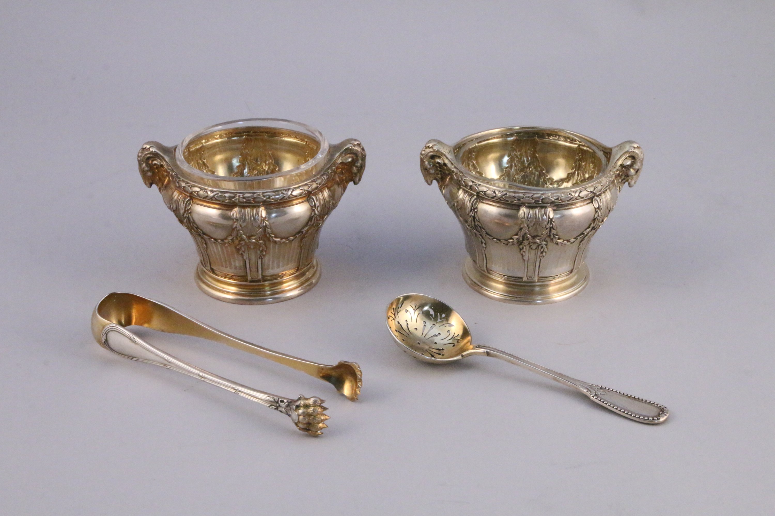 - PAIRE de SUCRIERS en vermeil à décor de guirlandes de laurier, les prises figurant de tête de béliers. Poinçon Minerve, style Louis XVI, fin XIXe-début XXe. Orfèvre Emile Puiforcat. Haut. 6,2 cm. Poids 160 g.