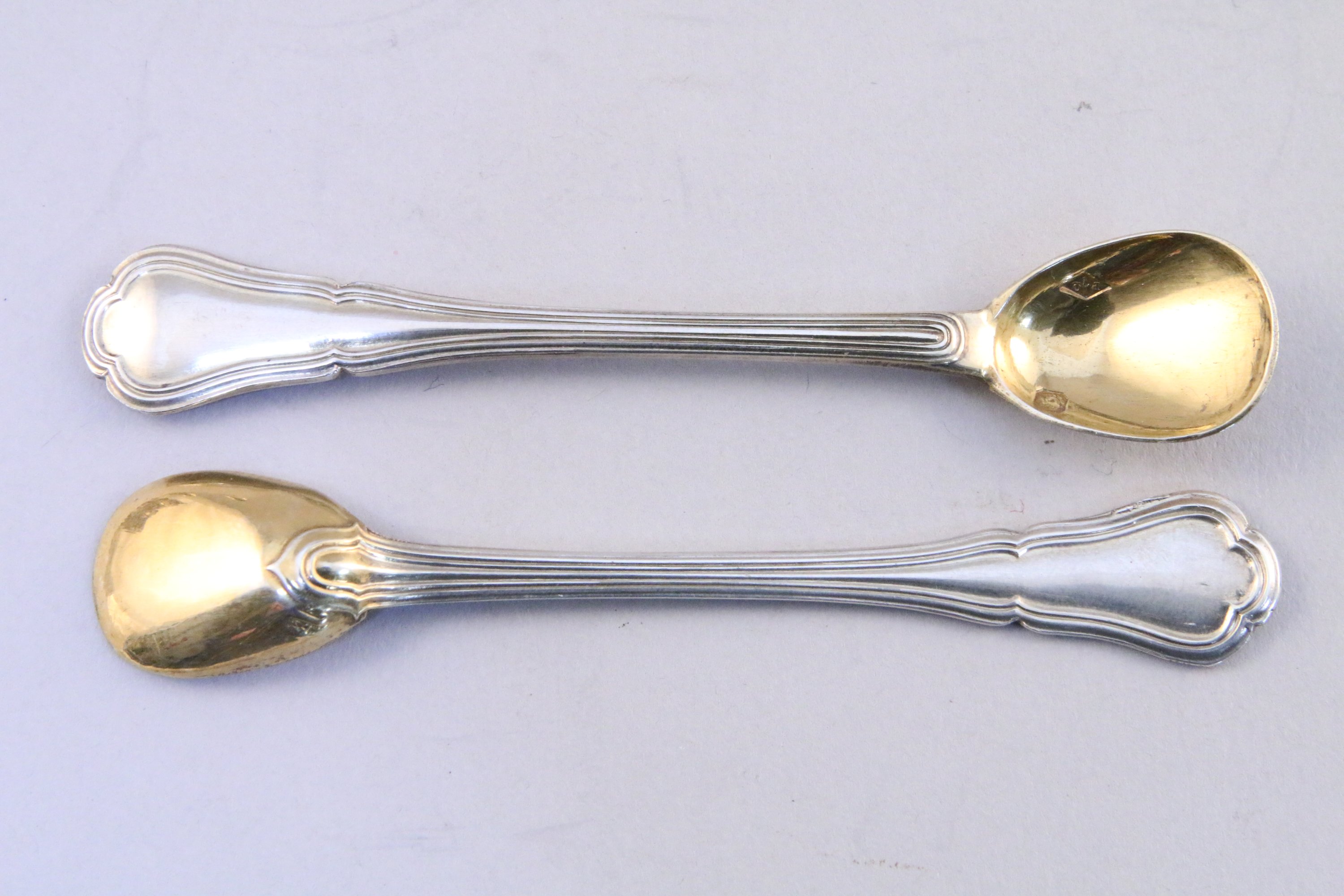 JOINT: PAIRE de PELLES à SEL en vermeil, modèle violoné et filets. Orfèvre Pierre Queille. Long. 9 cm. Poids 15 g.