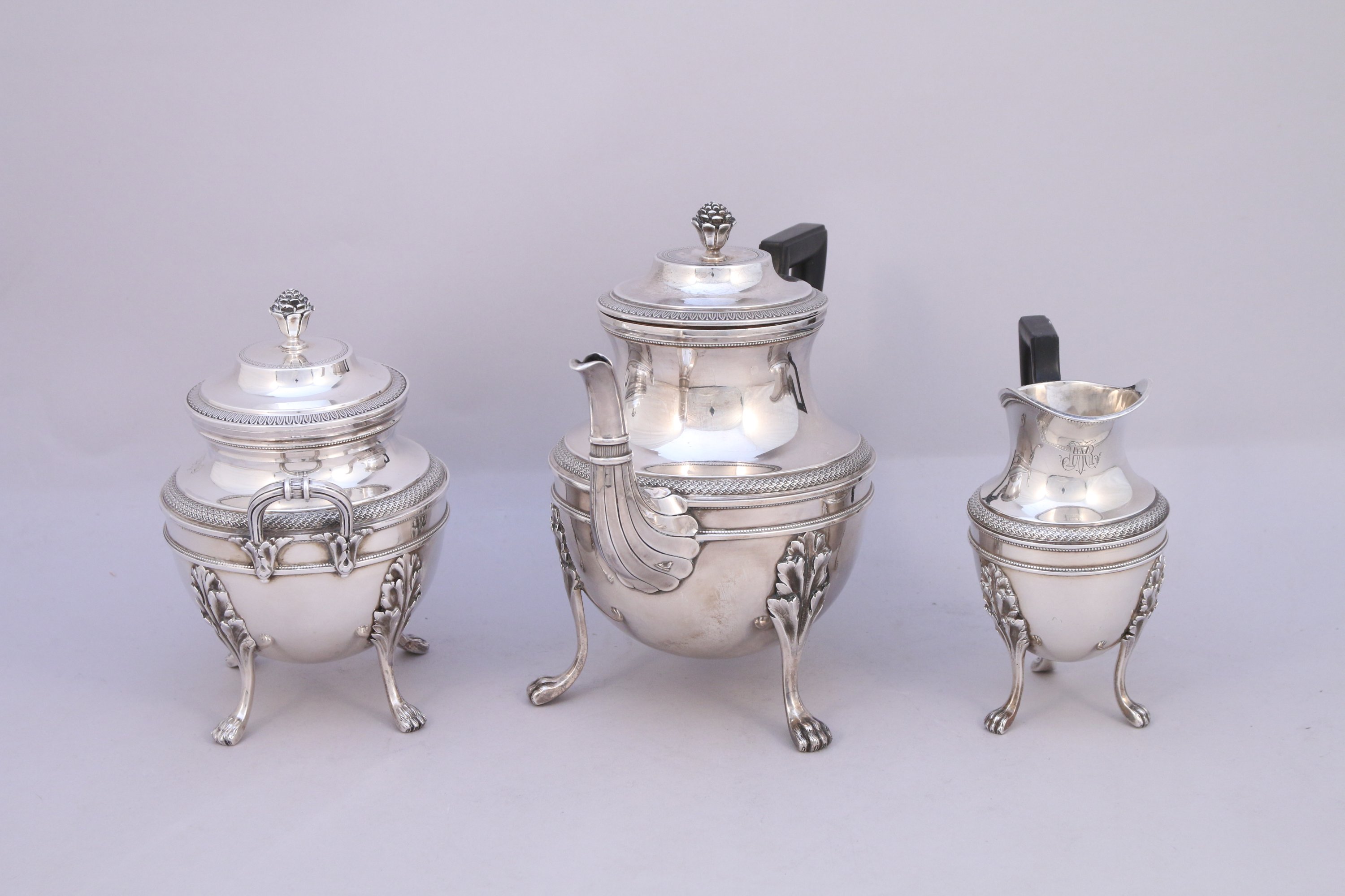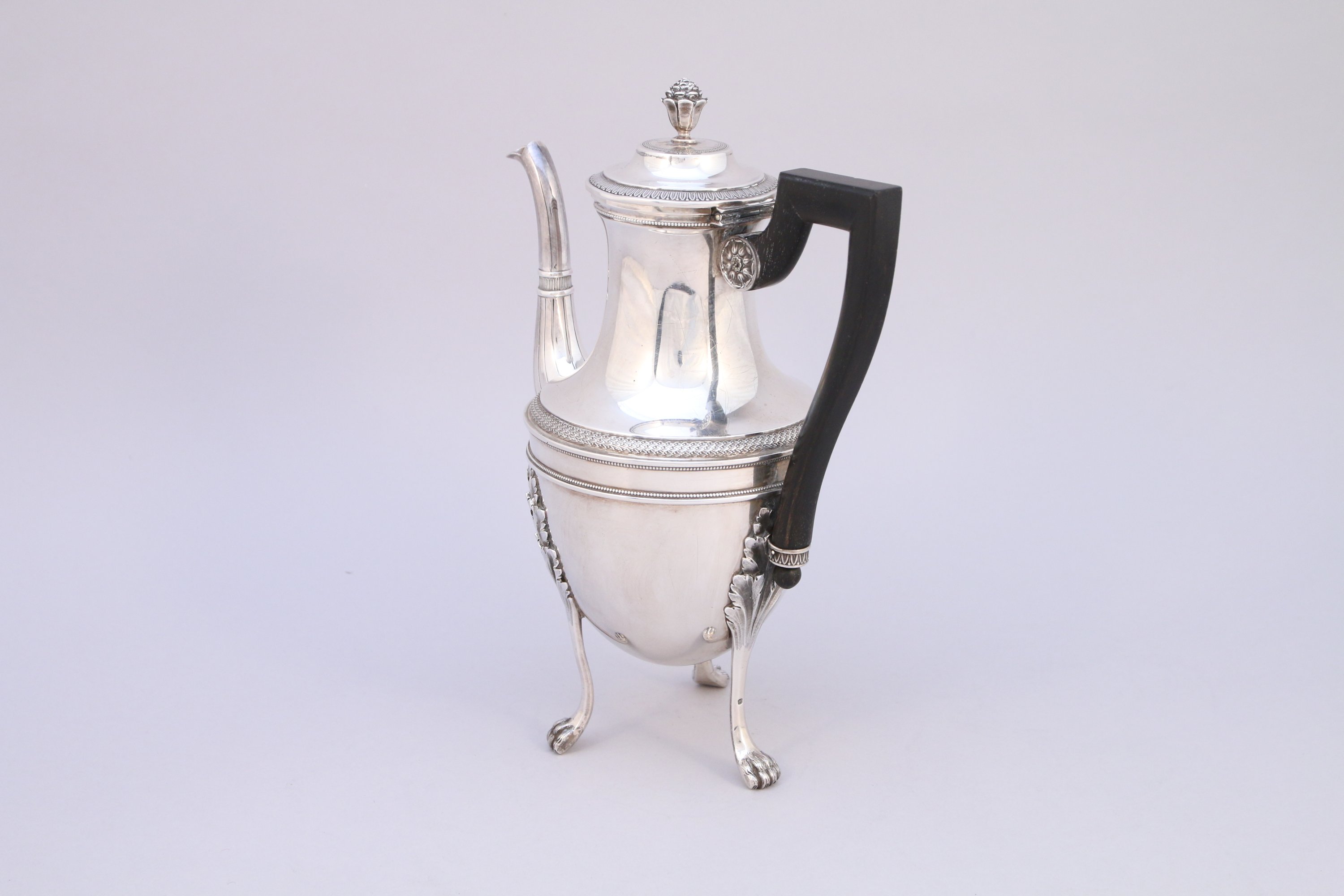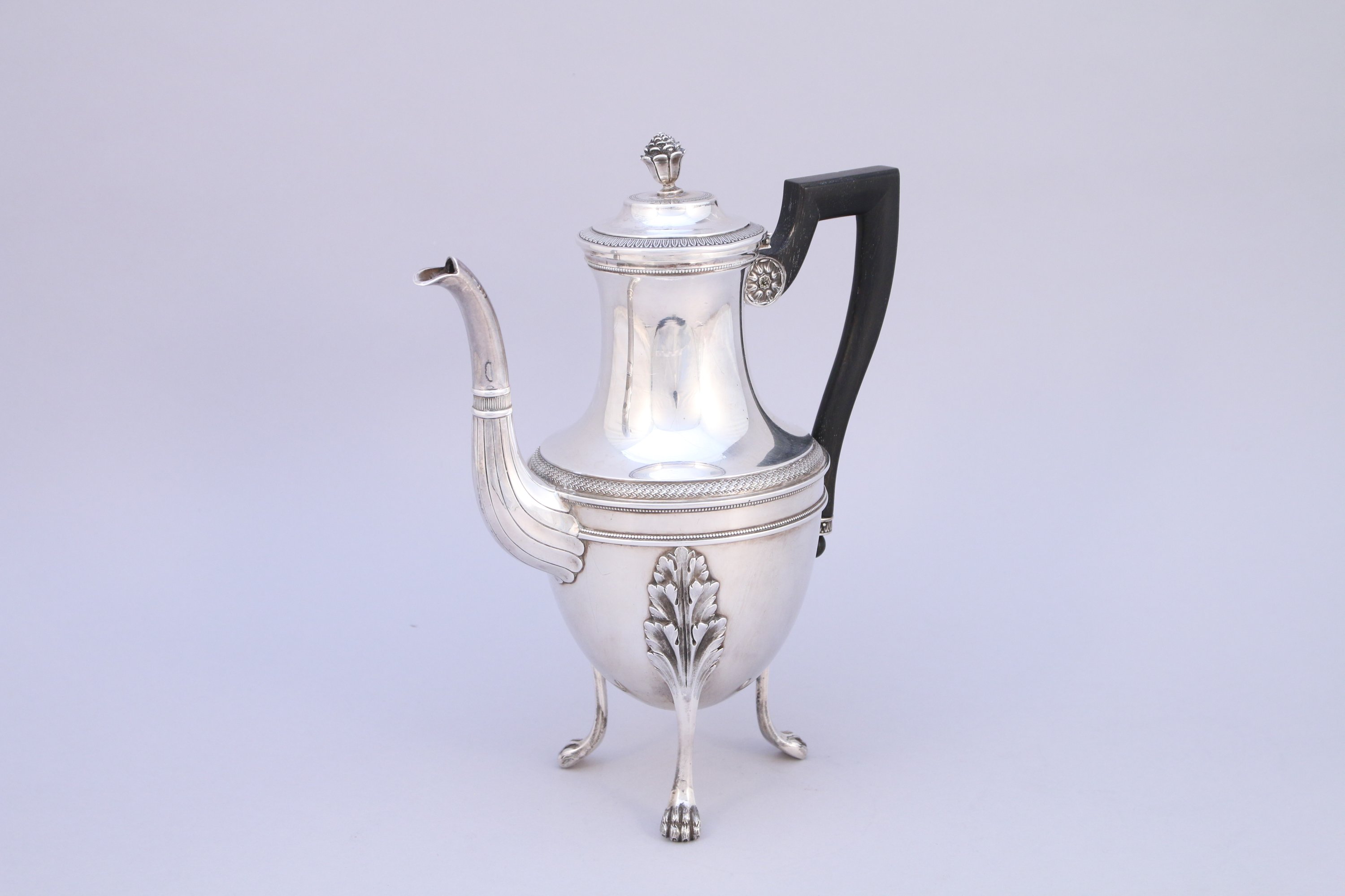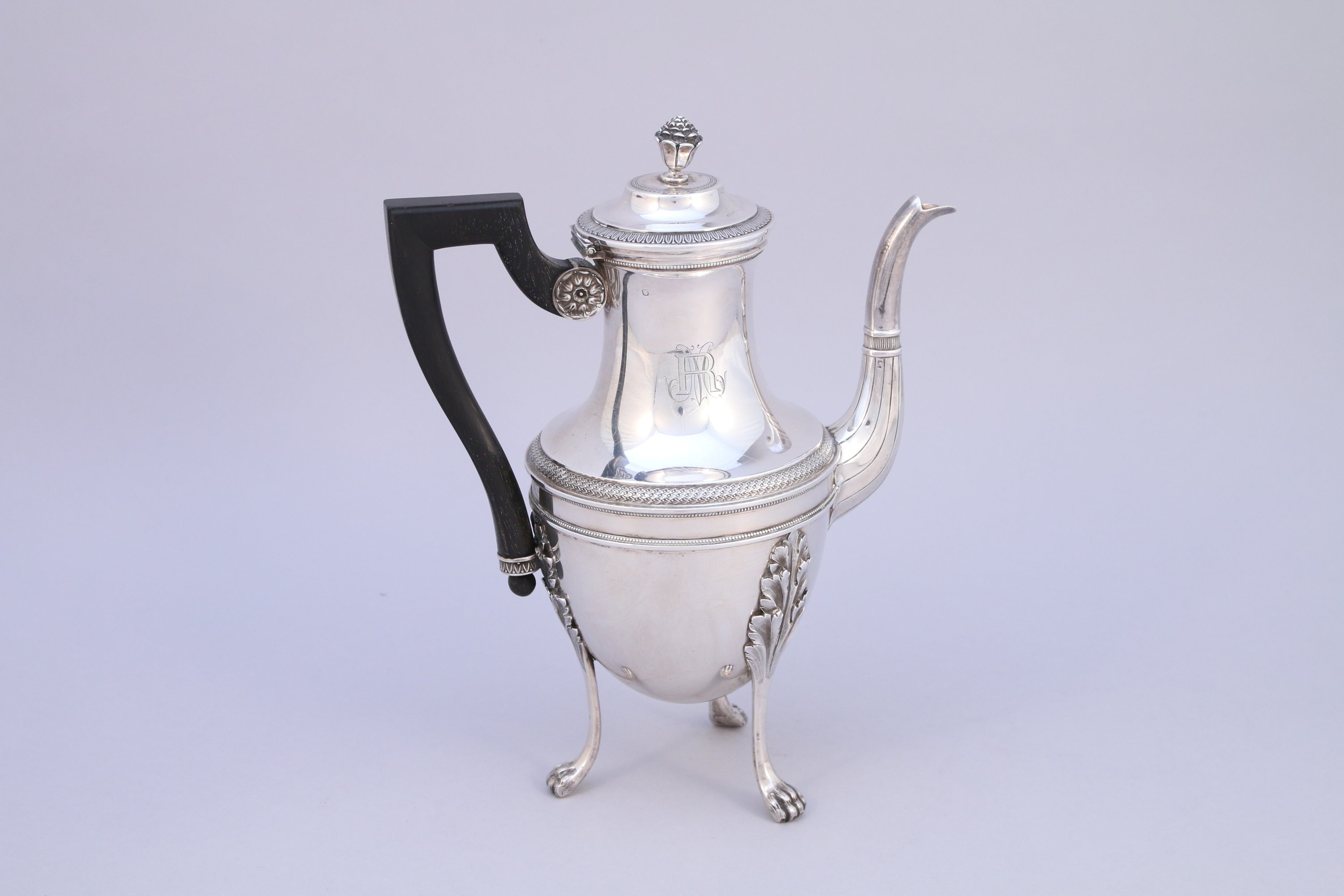 SERVICE à CAFÉ en argent. Il se compose de QUATRE pièces: deux cafetières, un sucrier et un pot-à-lait. Ils reçoivent un décor néoclassique de feuilles d'eau, tors de lauriers. Le corps monogrammé "MR". Les anses en bois agrémentées d'une rosace. Fretels en graine. Pieds feuillagés terminés pas des griffes de lions. Intérieur vermeillé (sauf une cafetière).
