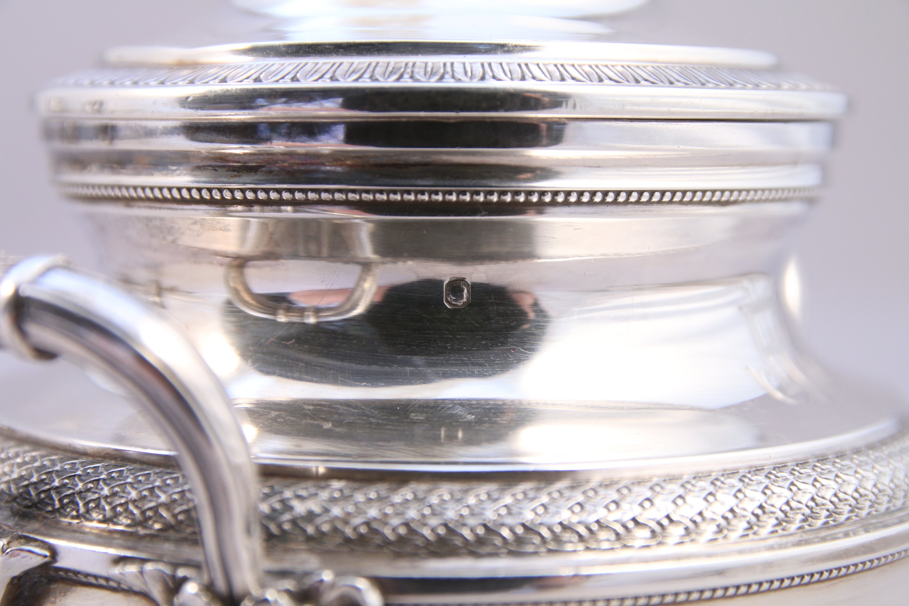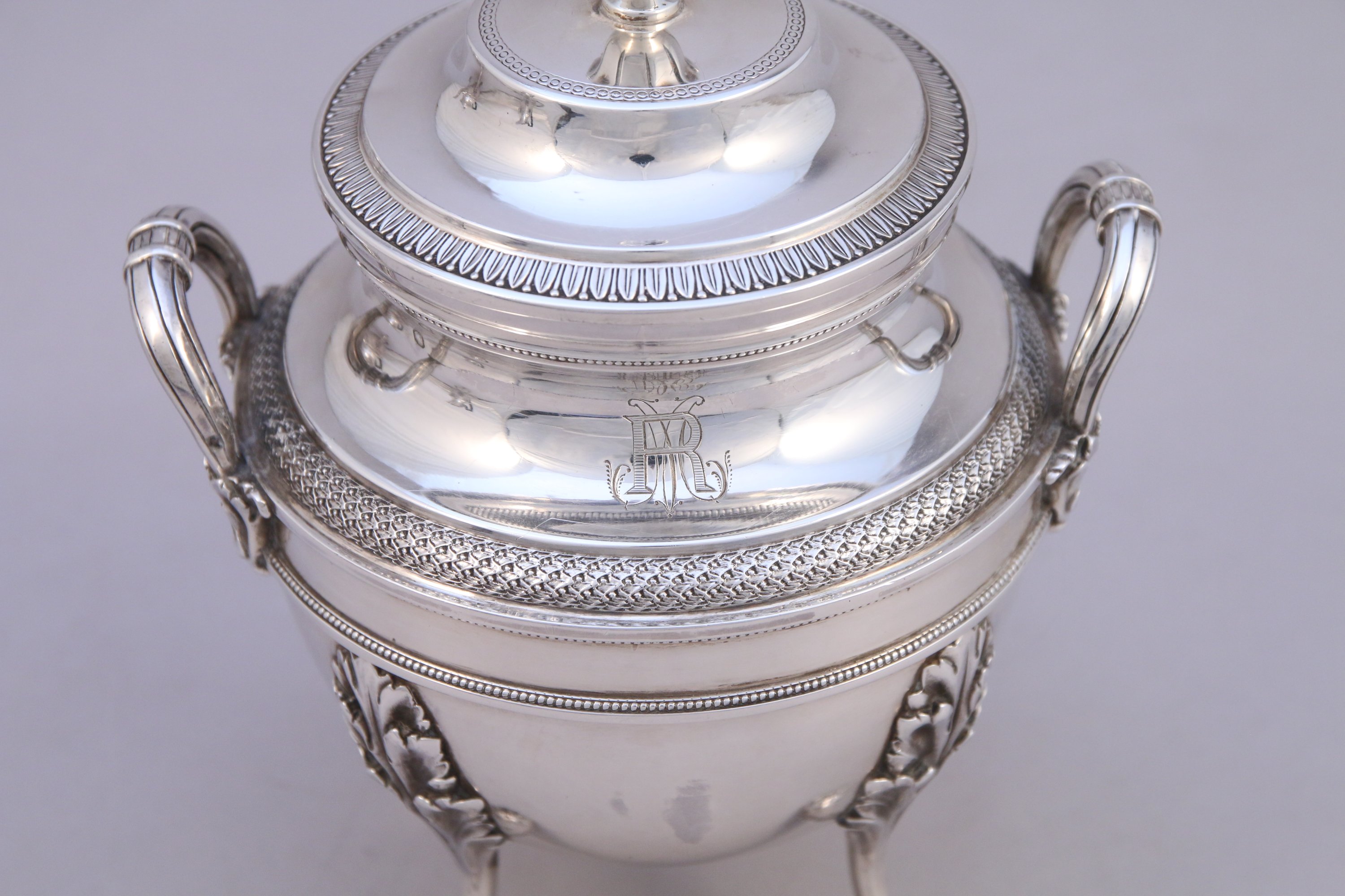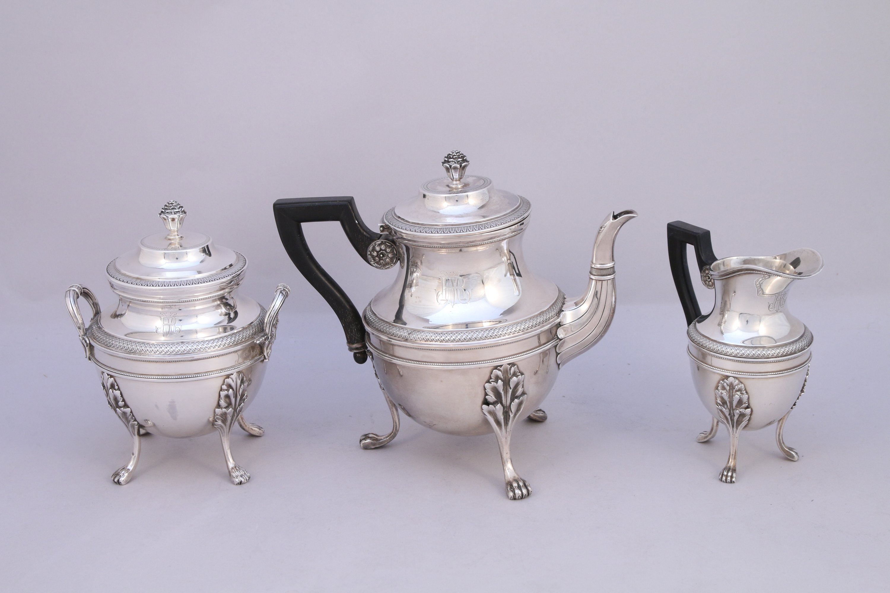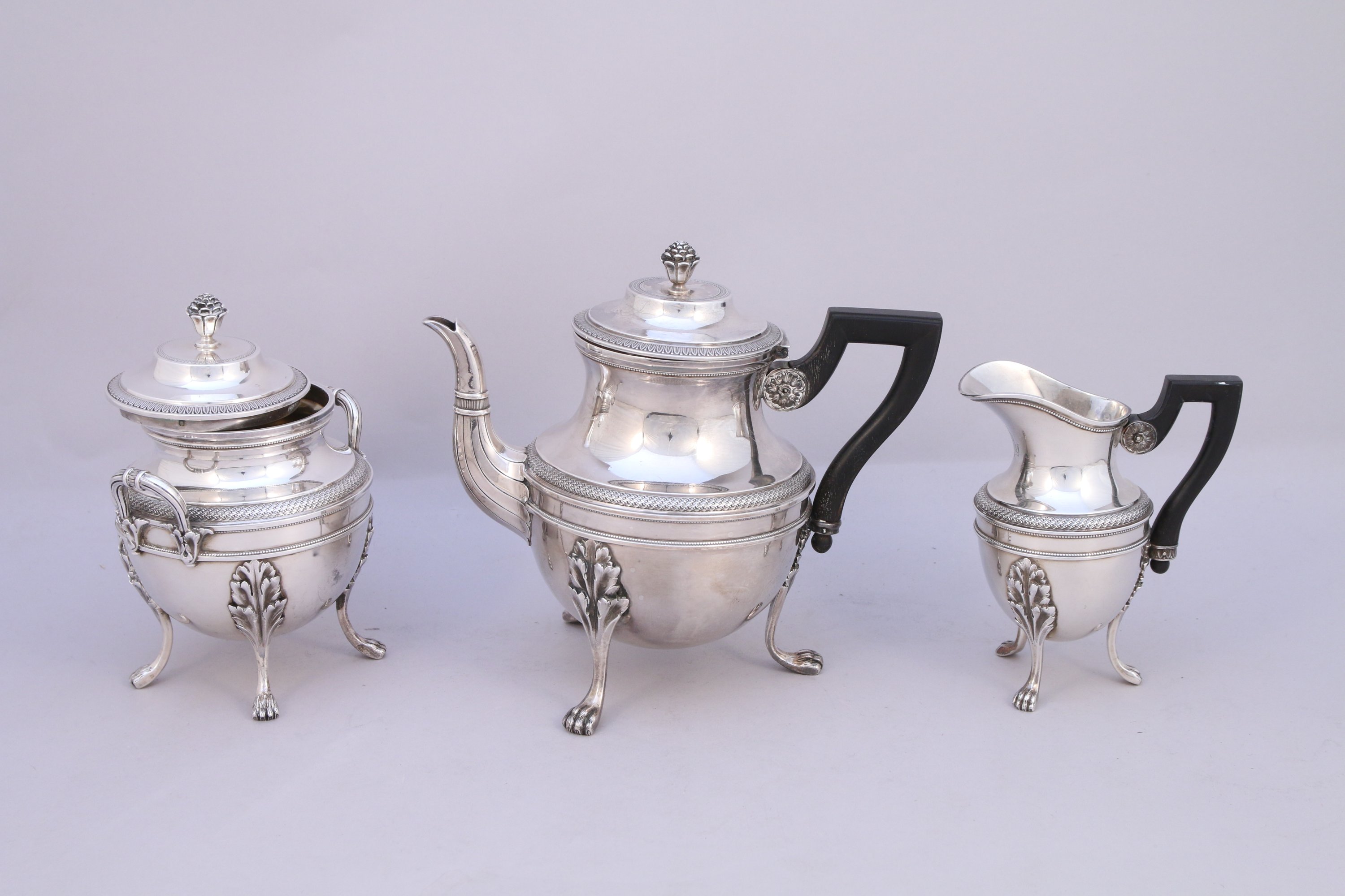SERVICE à CAFÉ en argent. Il se compose de QUATRE pièces: deux cafetières, un sucrier et un pot-à-lait. Ils reçoivent un décor néoclassique de feuilles d'eau, tors de lauriers. Le corps monogrammé "MR". Les anses en bois agrémentées d'une rosace. Fretels en graine. Pieds feuillagés terminés pas des griffes de lions. Intérieur vermeillé (sauf une cafetière).