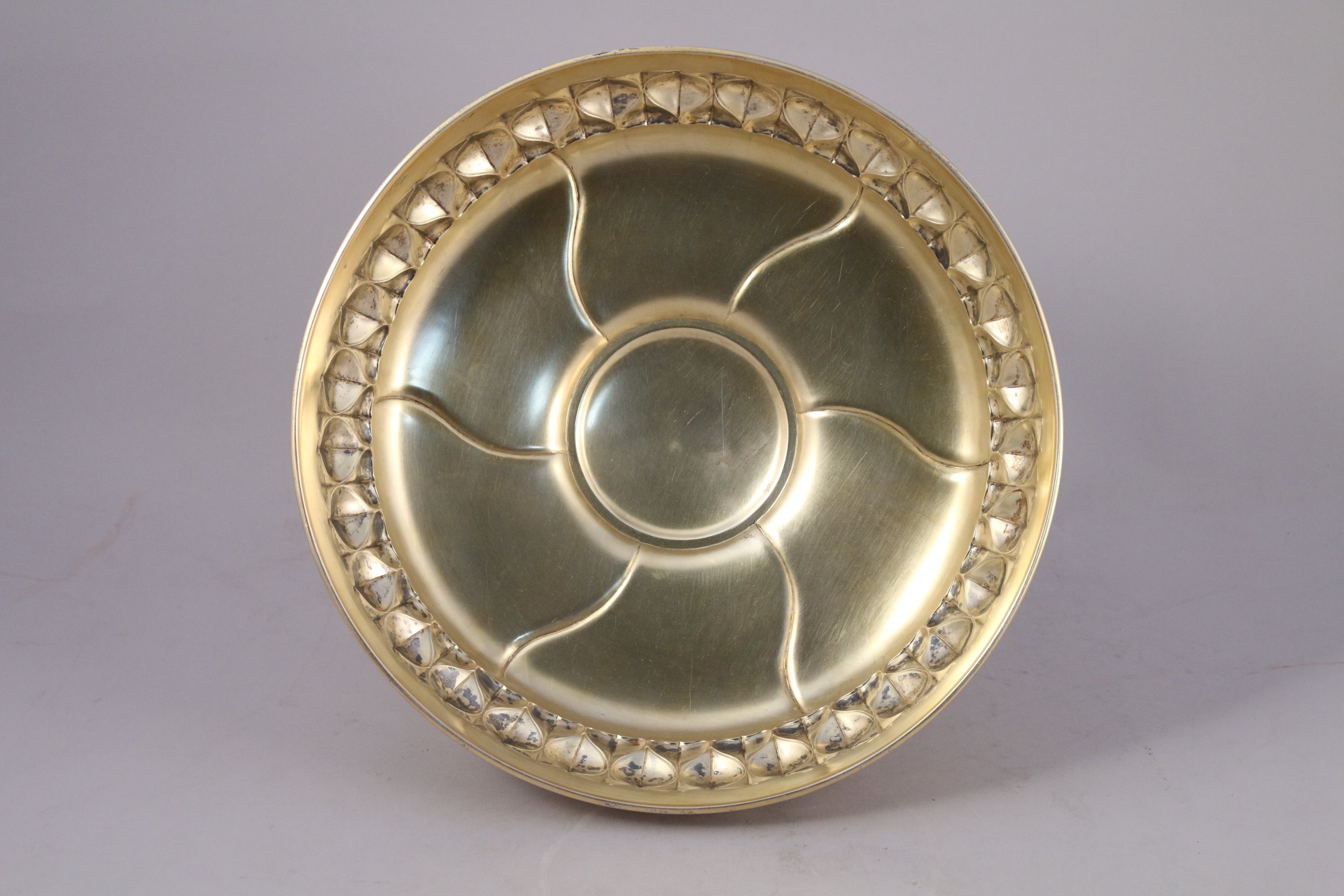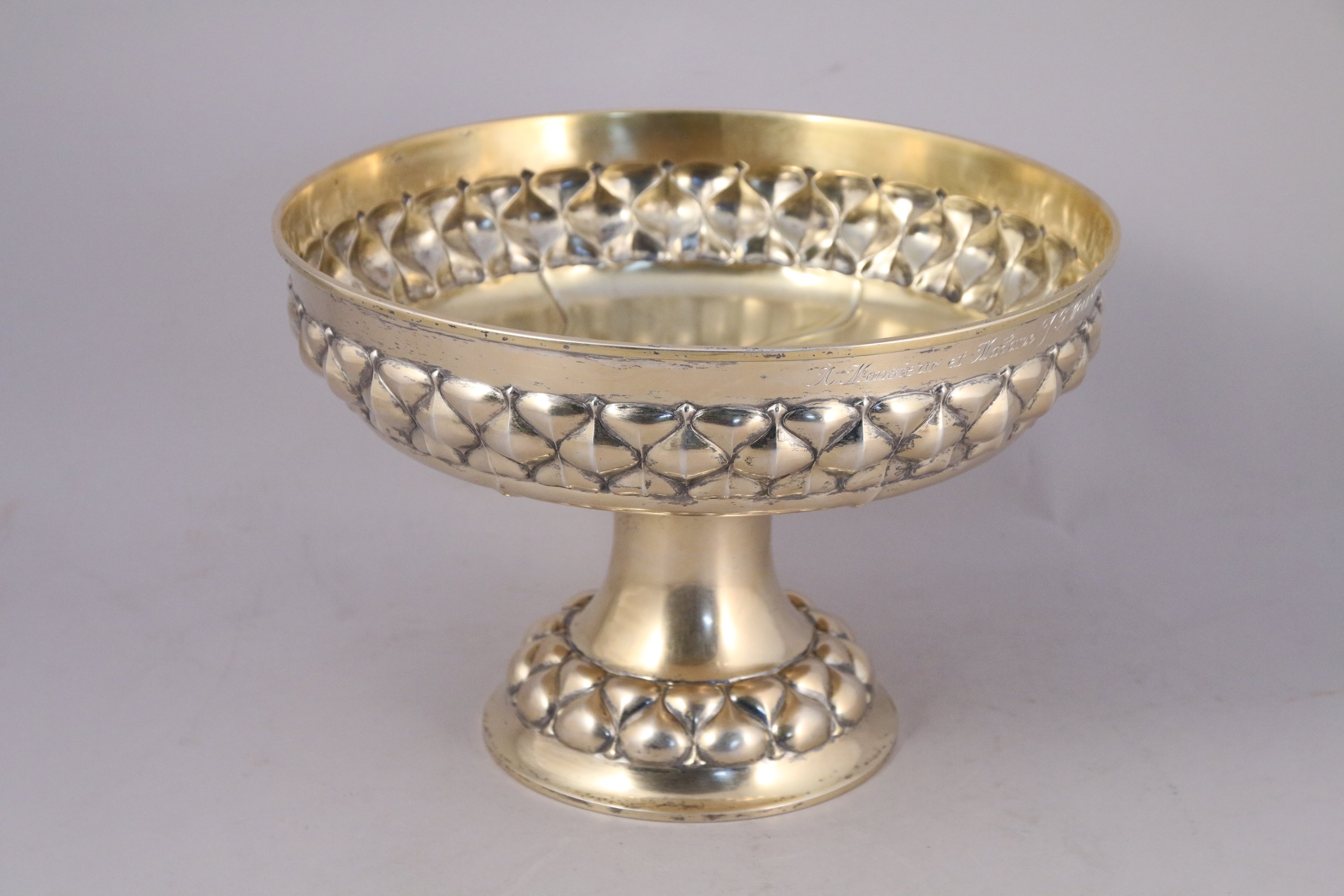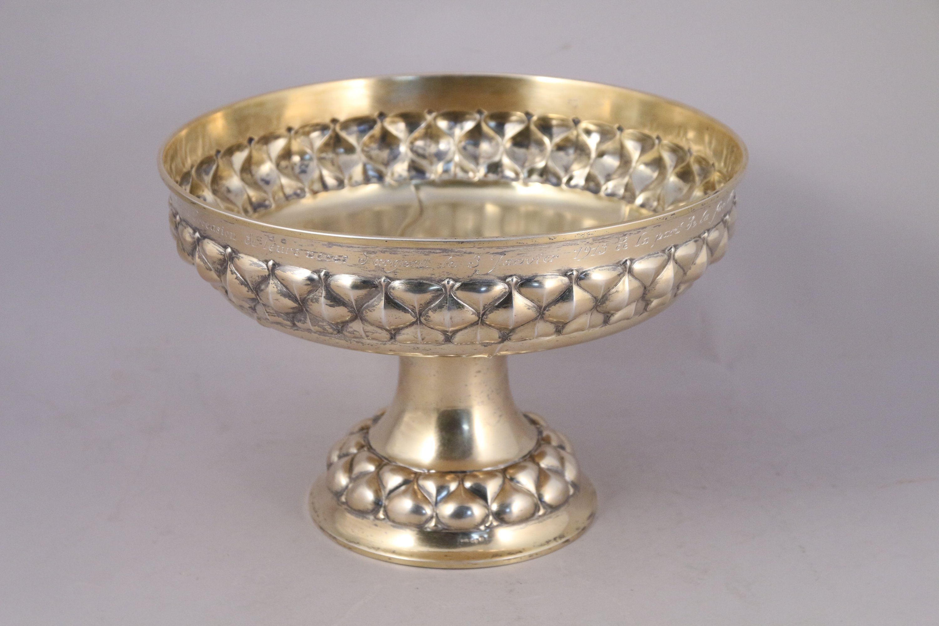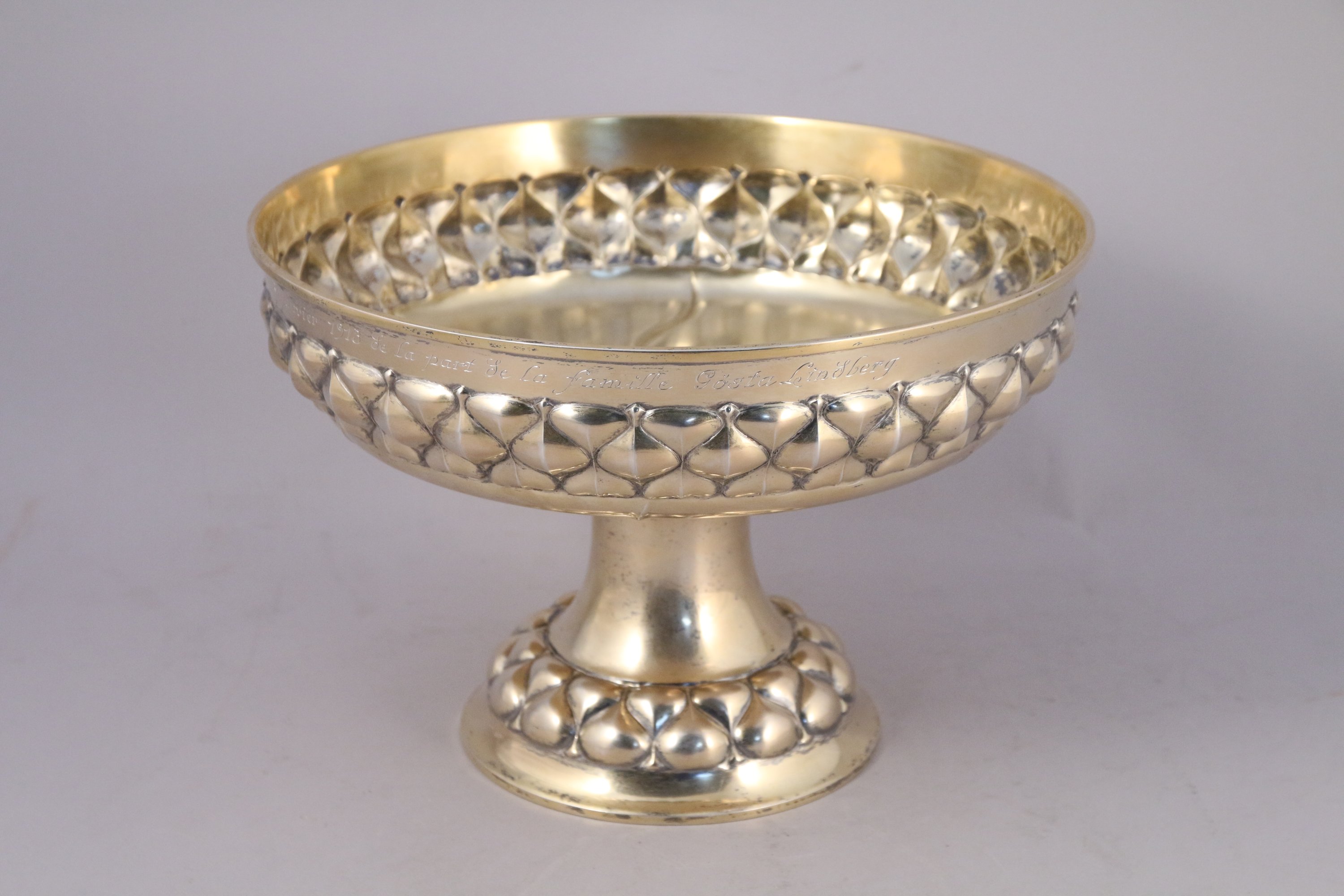 SUEDE. Grande COUPE sur PIÉDOUCHE en vermeil avec une dédicace: "À Monsieur et Madame J. G. Monnet à l'occasion de leurs noces d'argent le 3 Janvier 1913 de la part de la famille Gösta Lindberg".