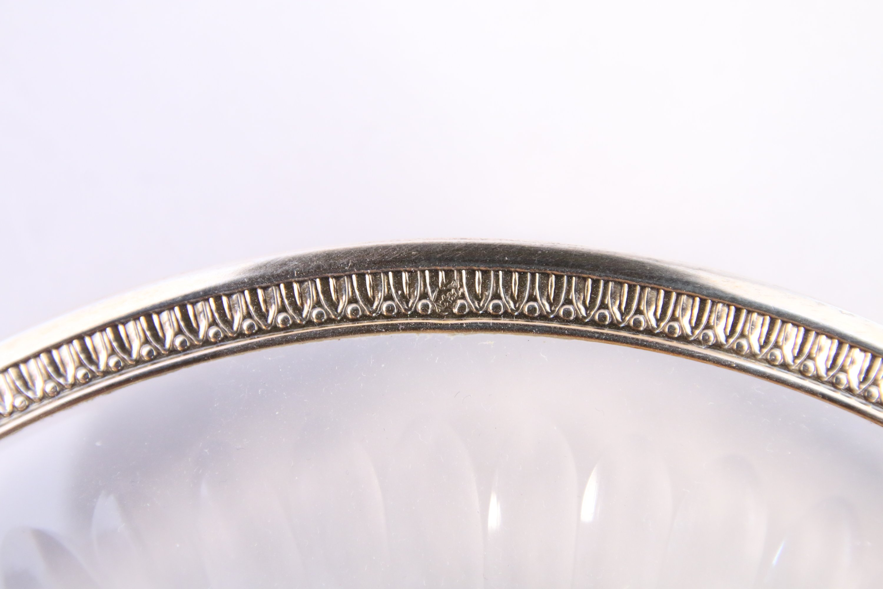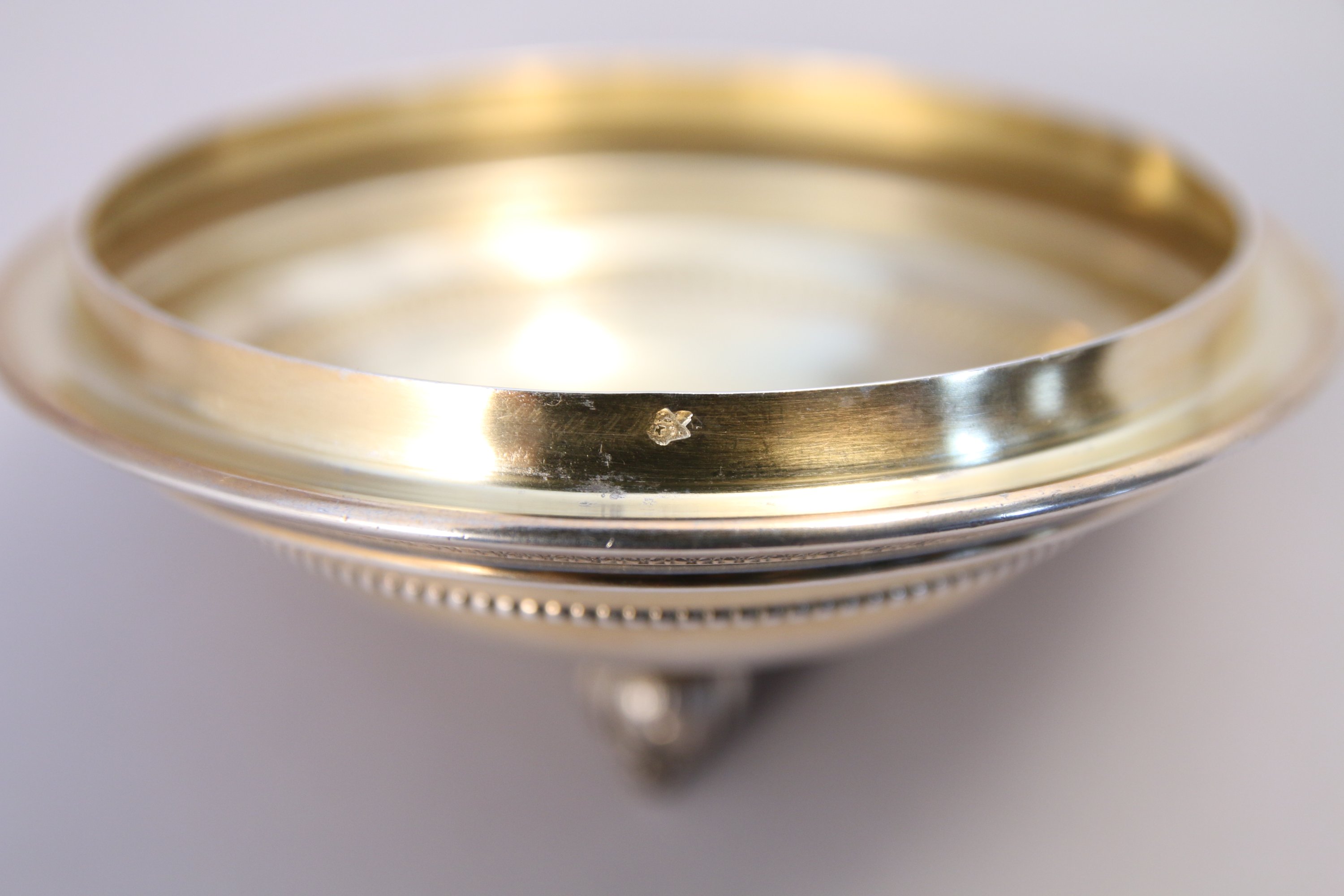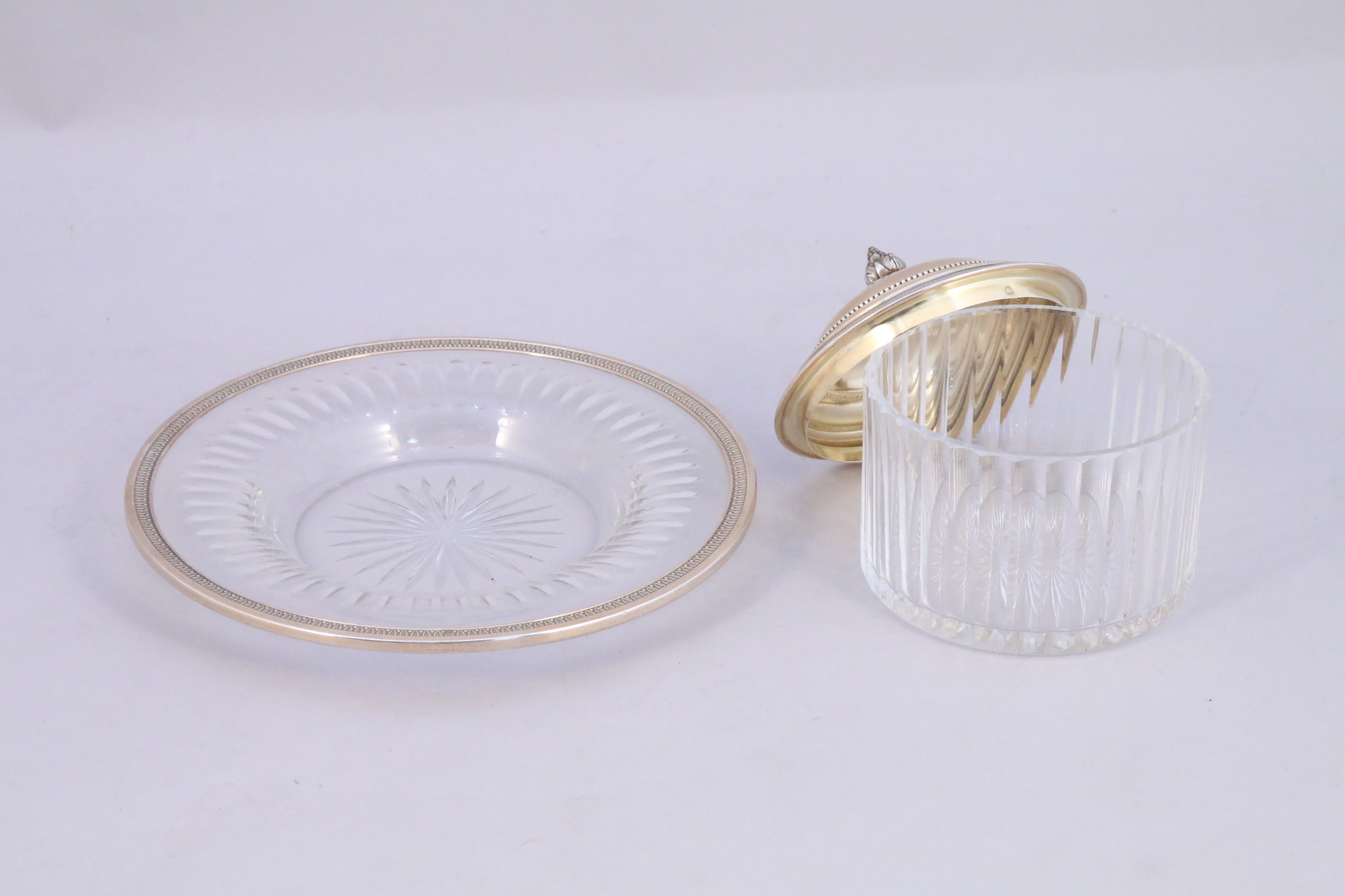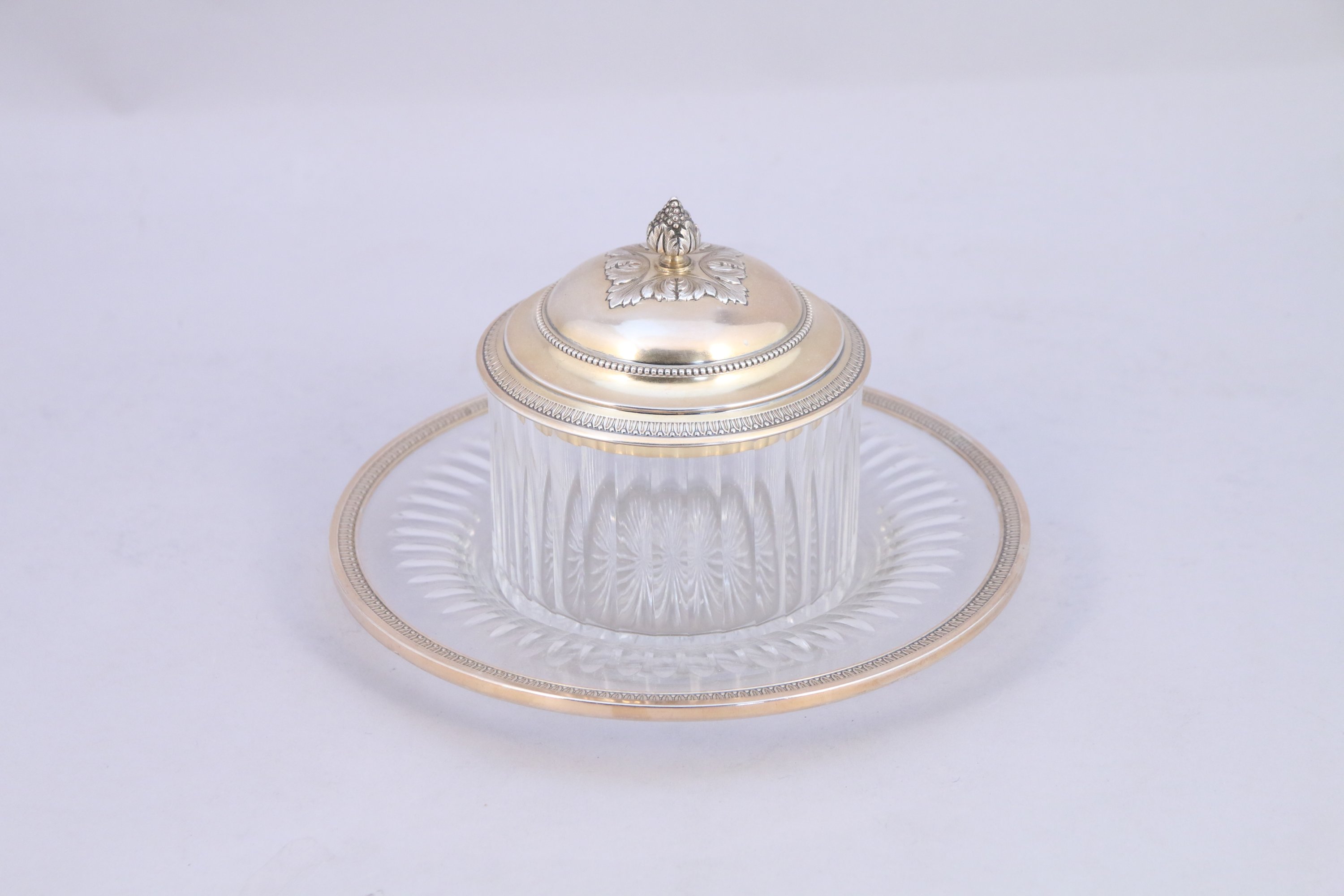 LAPAR. SERVICE à CAVIAR en cristal taillé et vermeil. Couvercle à doucine décoré d'une frise de perles et feuilles d'eau reprise sur la bordure de la soucoupe. Fretel figurant une pomme de pin sur une terrasse feuillagée.