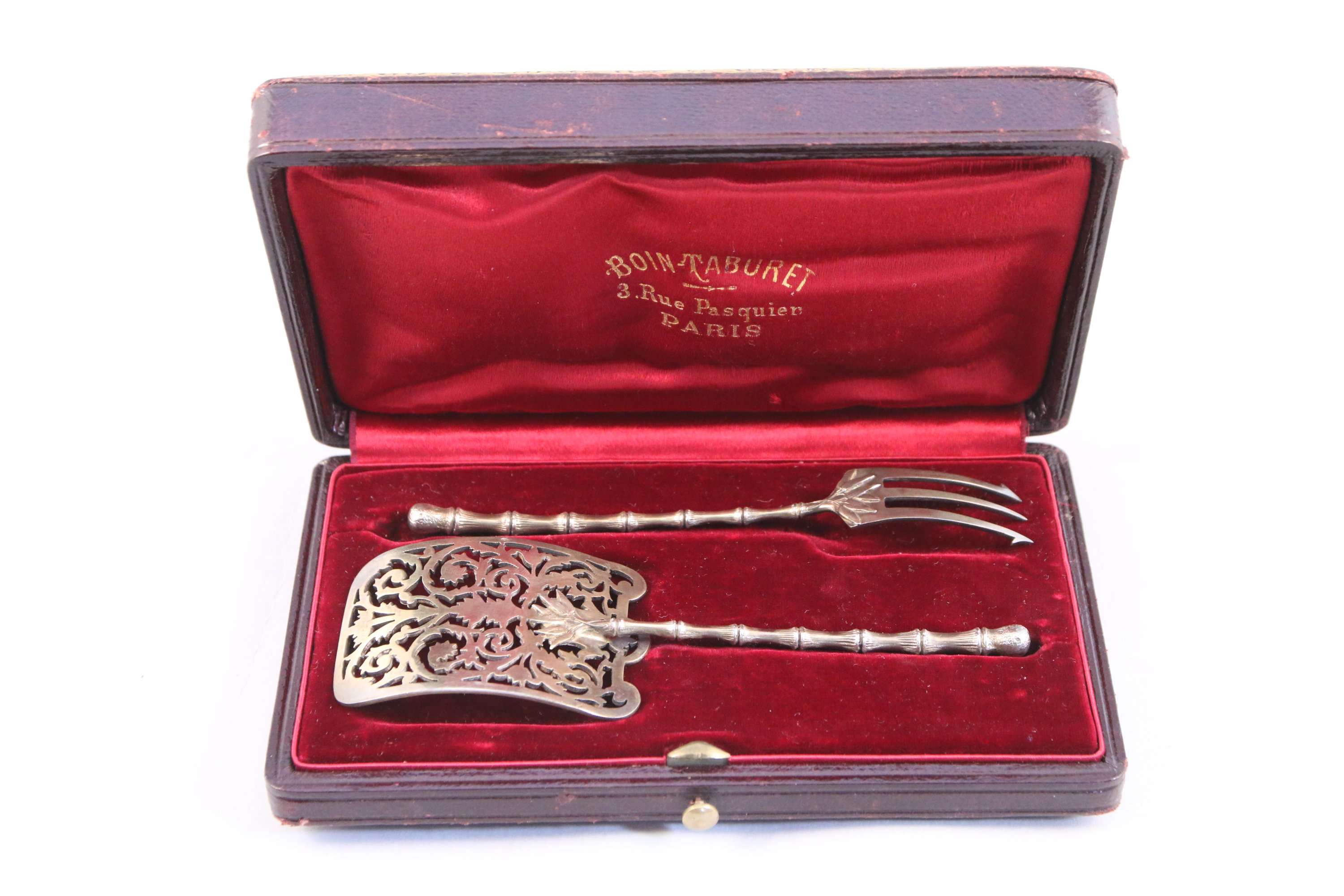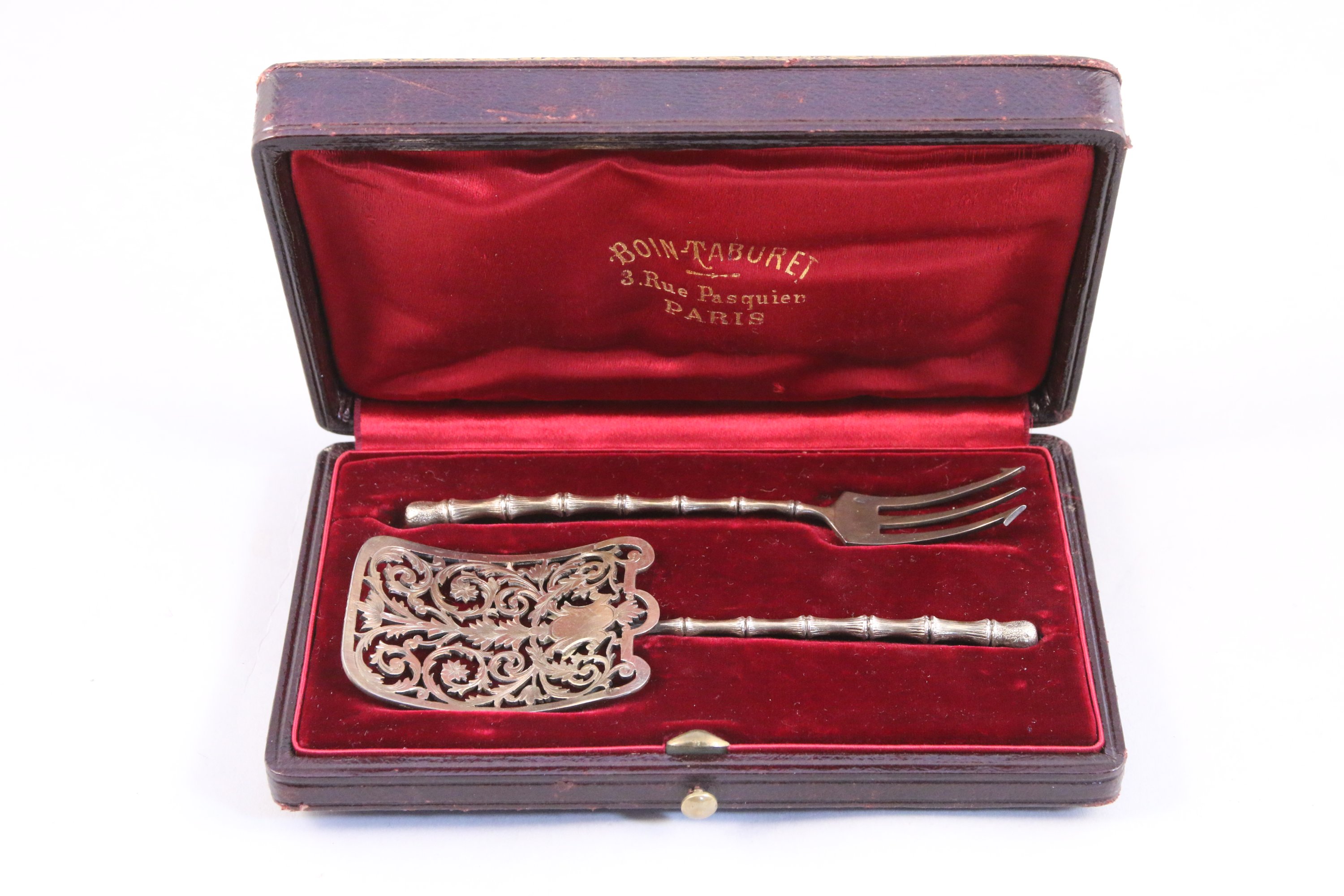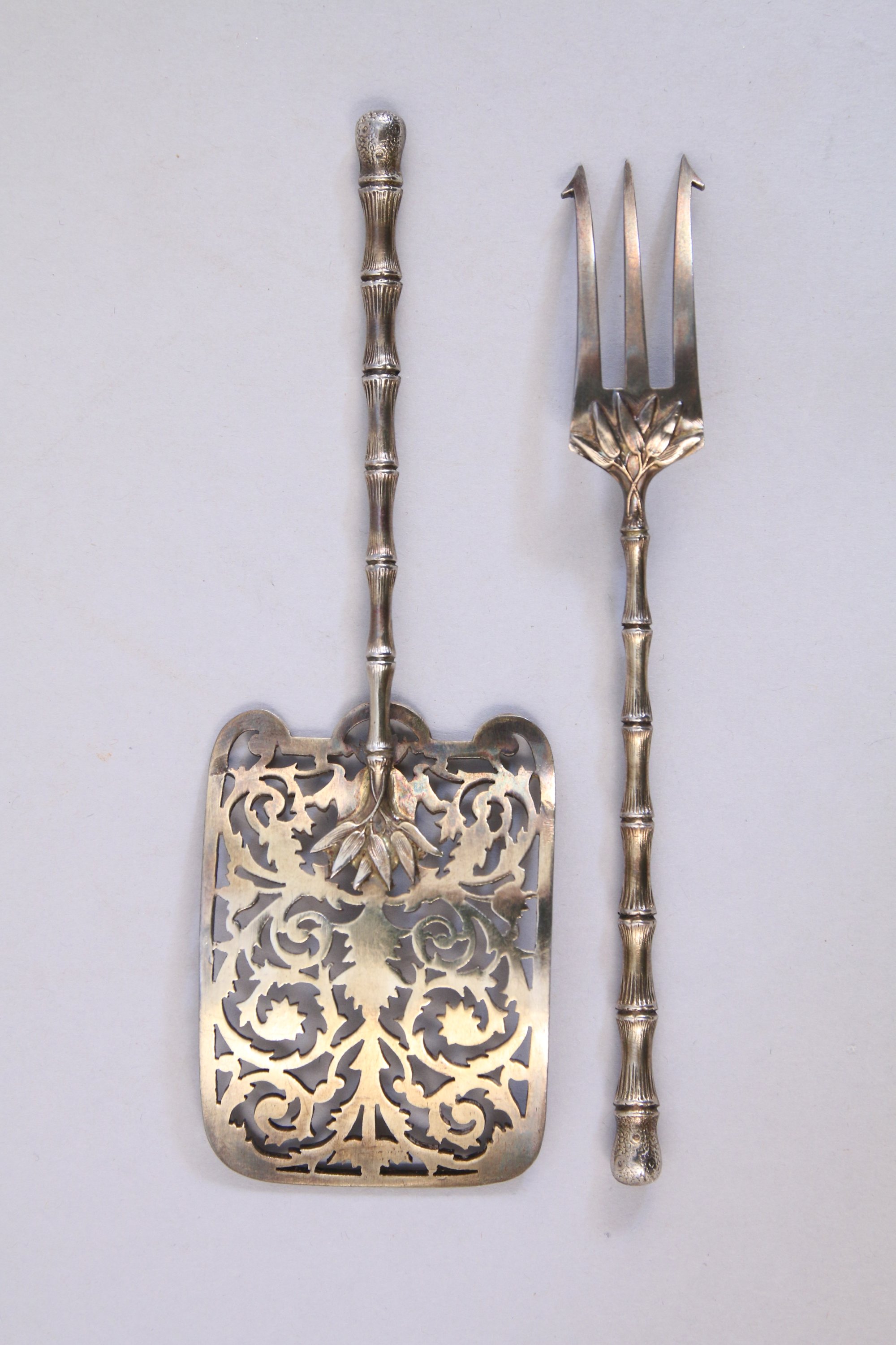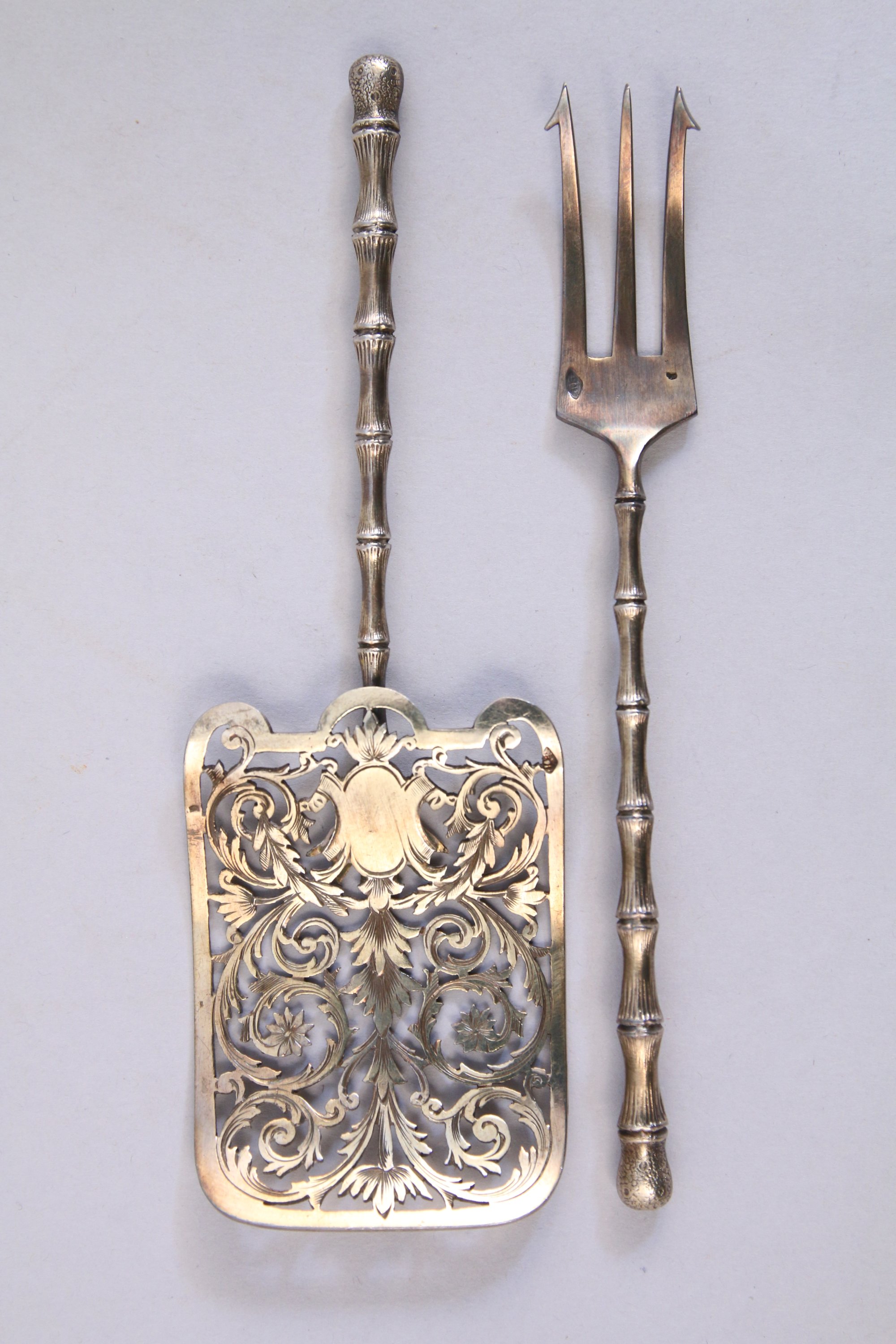 PUIFORCAT. COUVERT à MIGNARDISES en vermeil, pelle à riche décor ajouré de rinceaux et d'enroulements feuillagés, manches simulant du bambou.