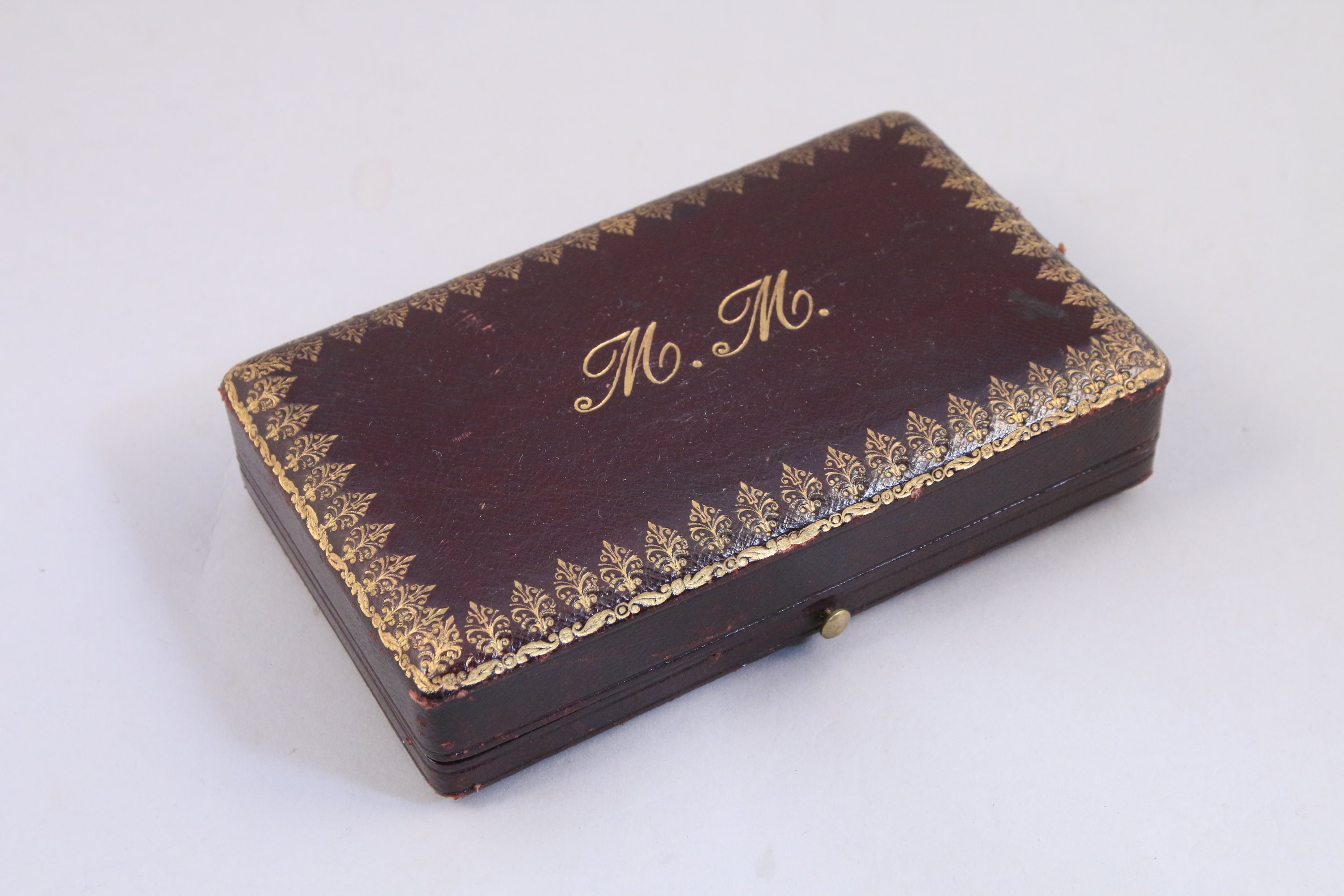 Dans un ÉCRIN gainé de cuir décoré au petit fer de palmettes a l'or et monogrammé " M.M " signé BOIN TABURET, 3 rue Pasquier PARIS