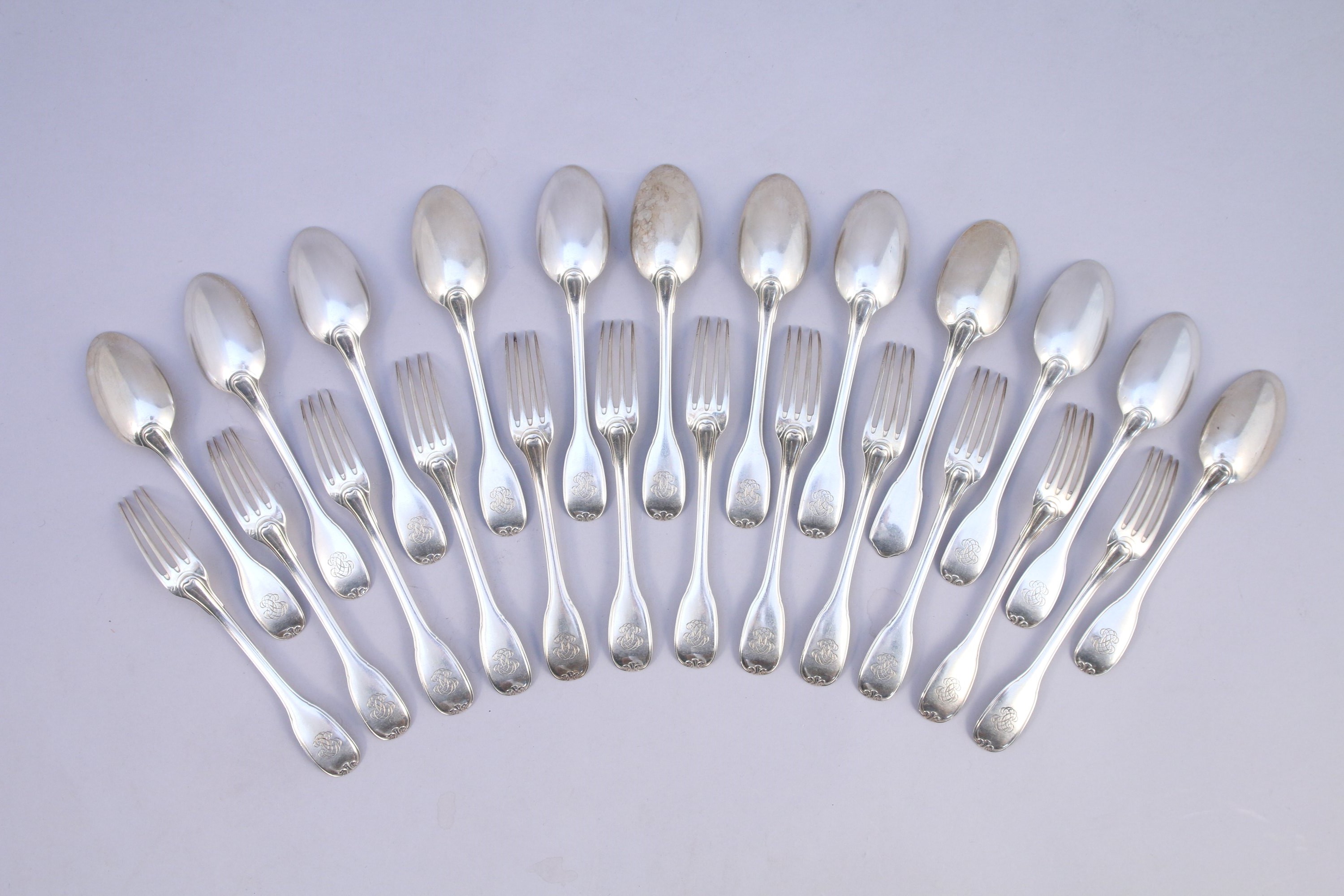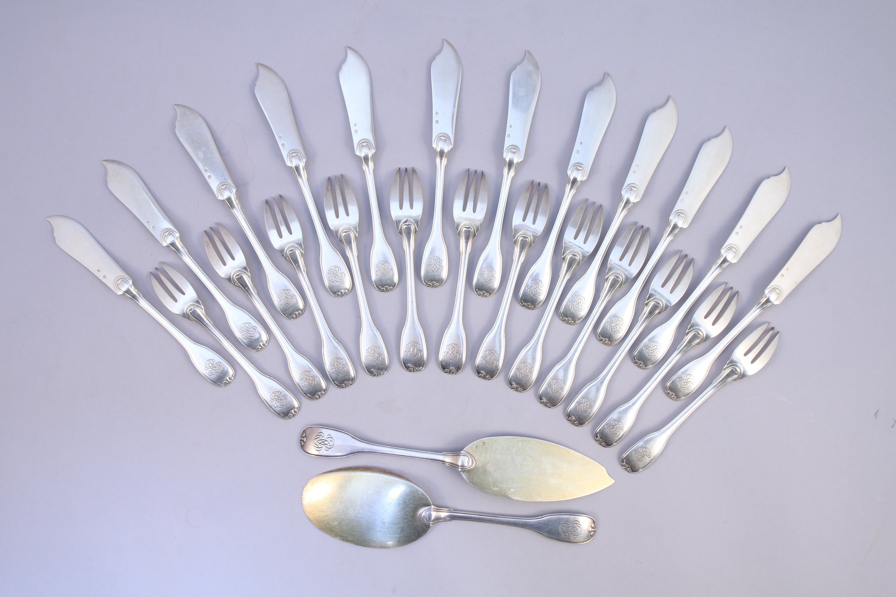PUIFORCAT. MÉNAGÈRE EN ARGENT modèle filet en entrelacs comprenant: 12 CUILLERS à gateaux, 12 petites FOURCHETTES, 12 cuillers à glace, 12 FOURCHETTES à escargots, 12 FOURCHETTES à poisson, 12 COUTEAUX à poisson, 2 COUVERTS de service (partiellement doré).