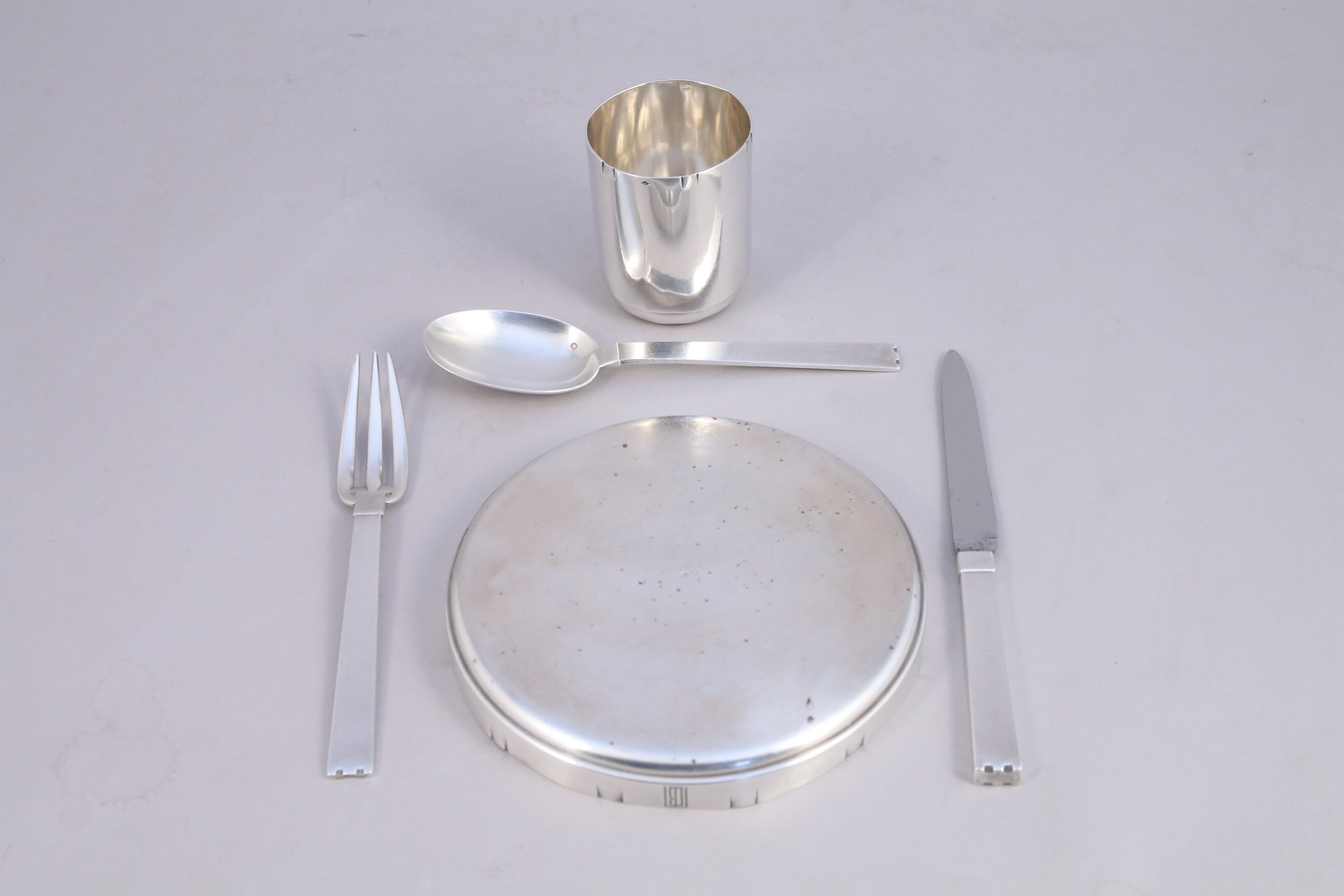 Une ASSIETTE, une TIMBALE, une CUILLER, une FOURCHETTE et un COUTEAU (le couteau en argent fourré la lame en métal). Motifs géométriques emboutis. Chaque élément portant des initiales "MB" à la graphie très géométrique.