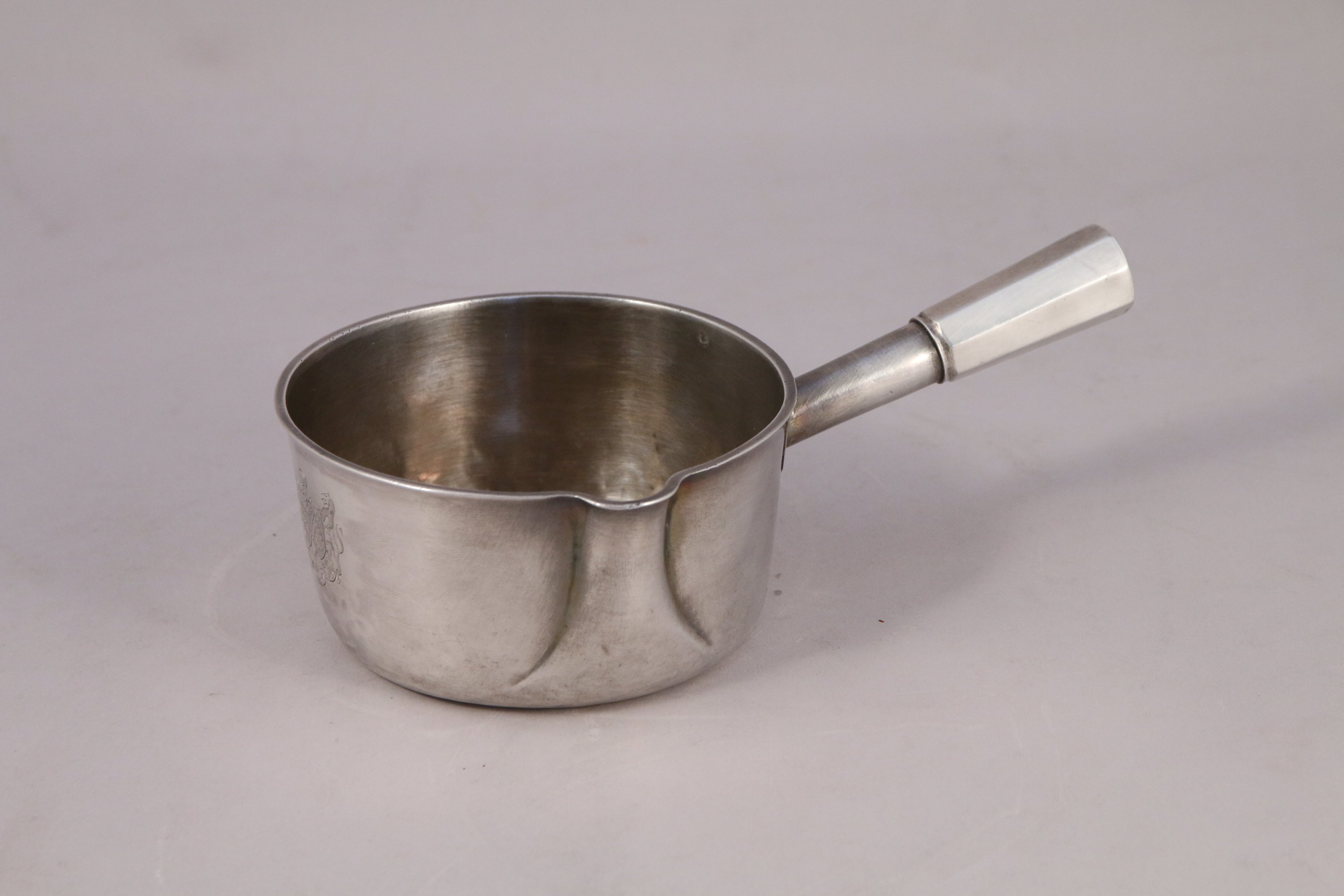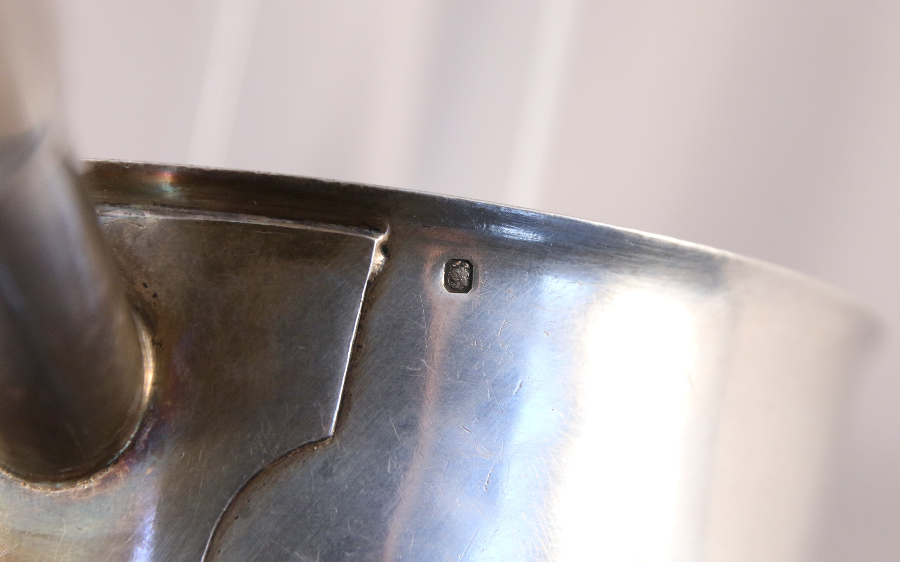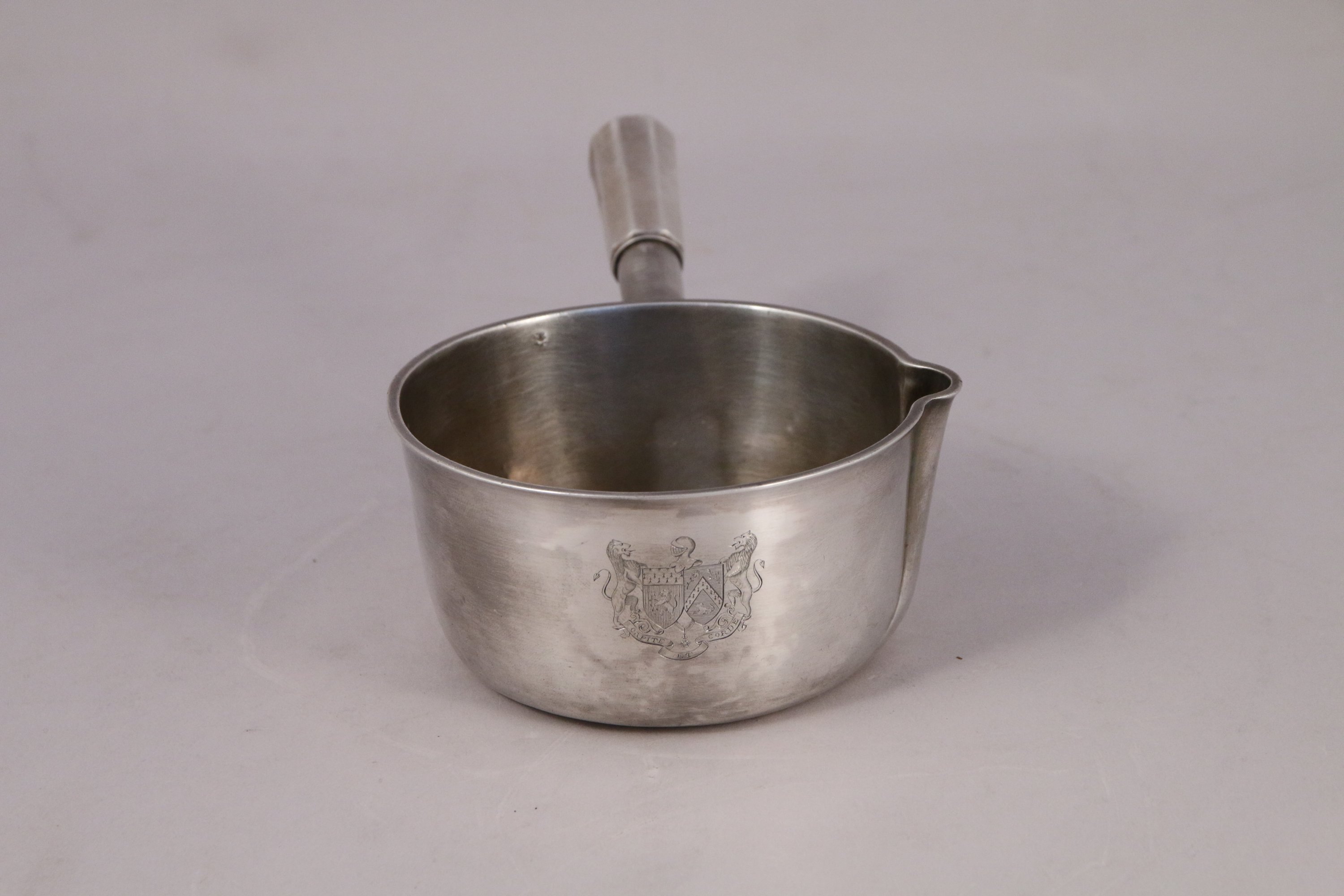 POÊLON de TABLE en argent uni gravé d'armoiries d'alliances surmontées d'un heaume, au-dessous la devise "CAPITE ET CORDE" (tête et le cur) dans un Phylactère. Manche en bois à pans.
