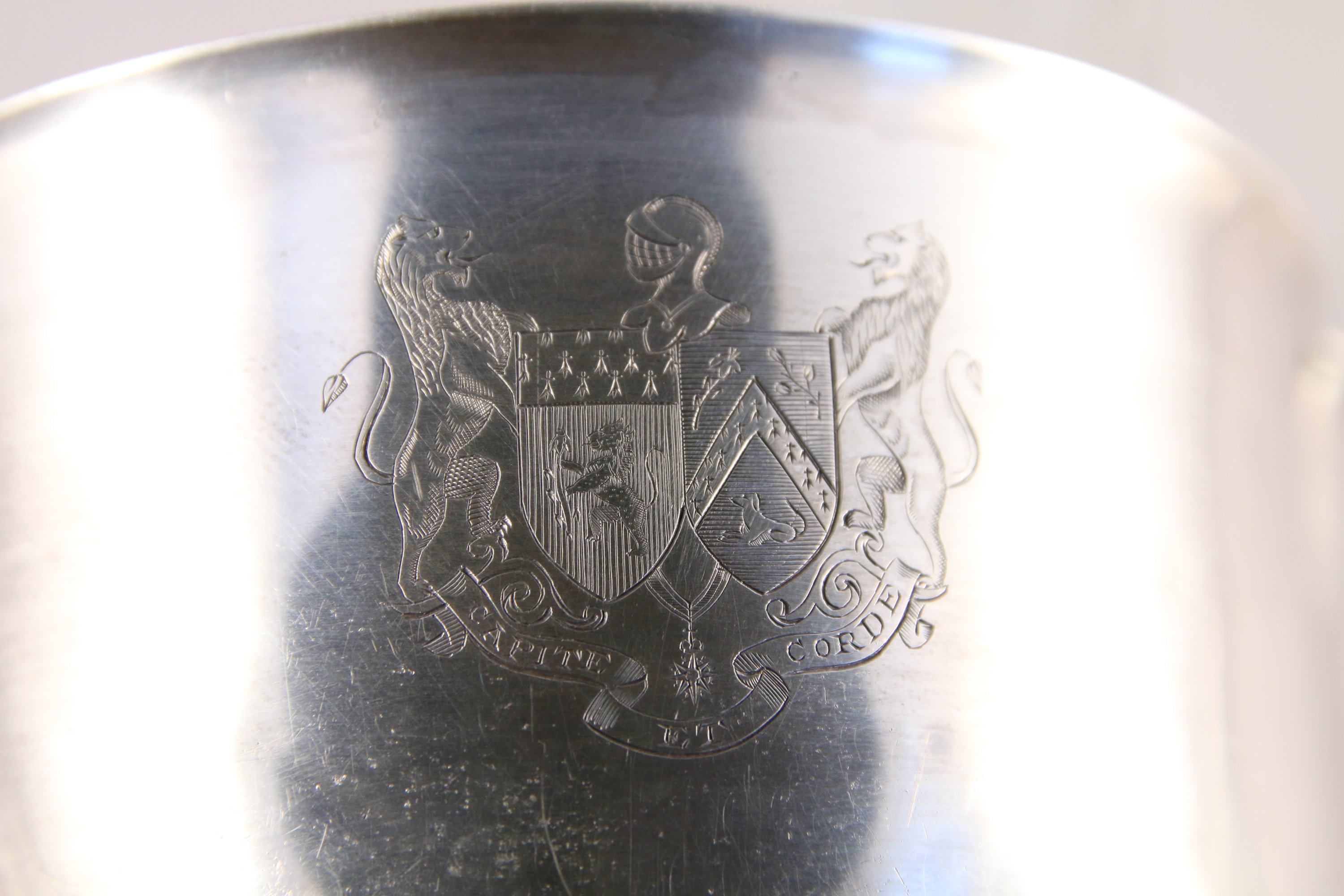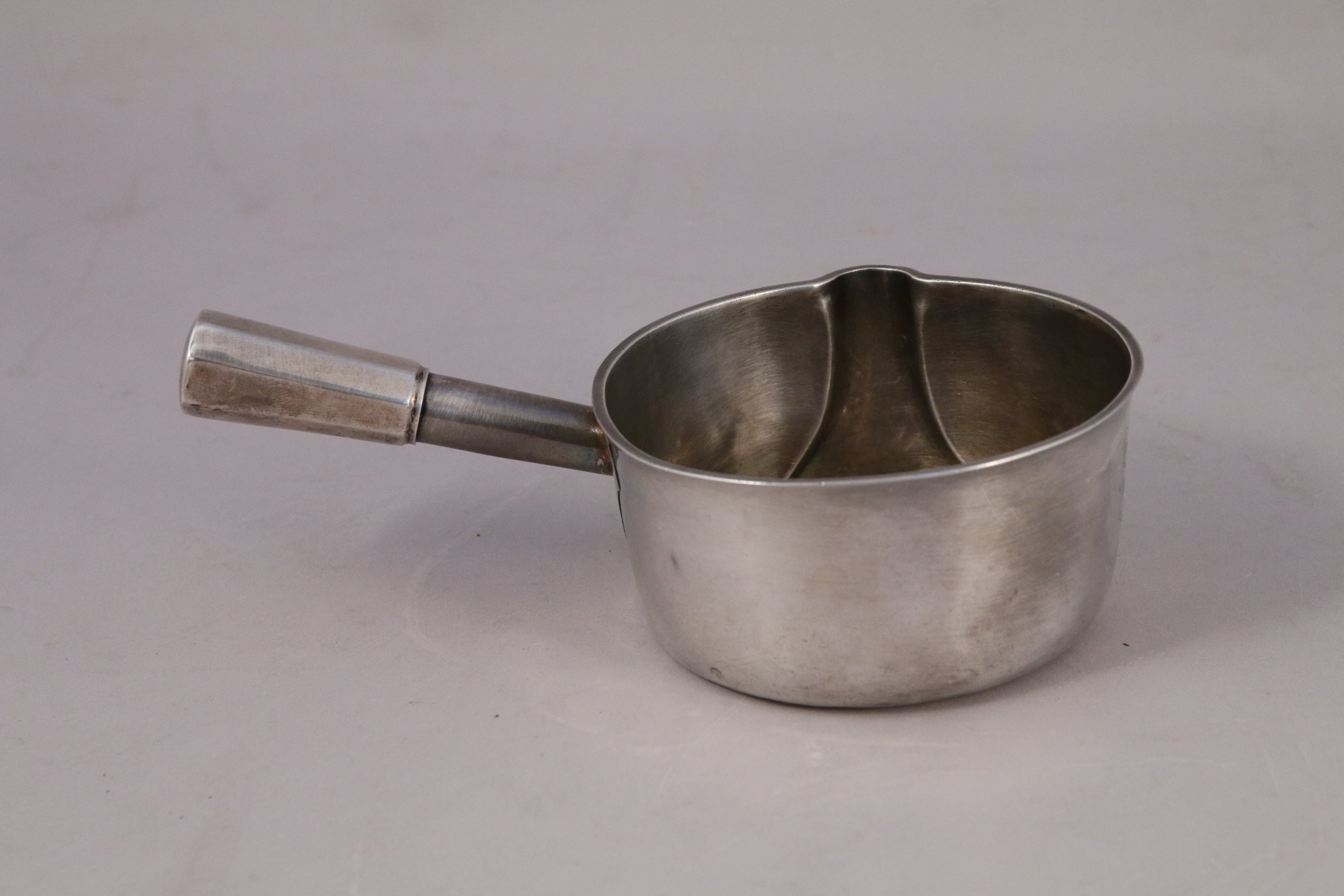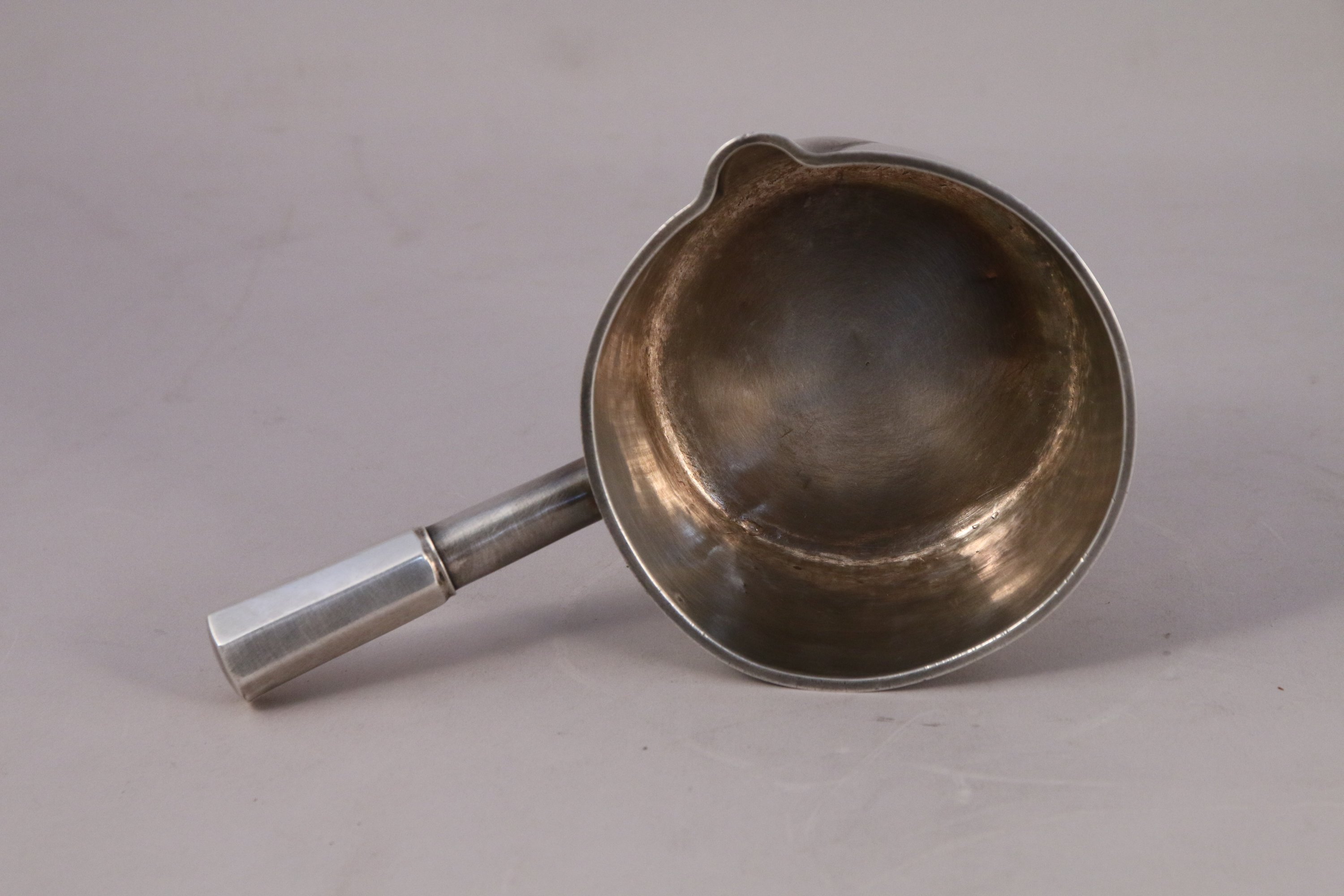 POÊLON de TABLE en argent uni gravé d'armoiries d'alliances surmontées d'un heaume, au-dessous la devise "CAPITE ET CORDE" (tête et le cur) dans un Phylactère. Manche en bois à pans.