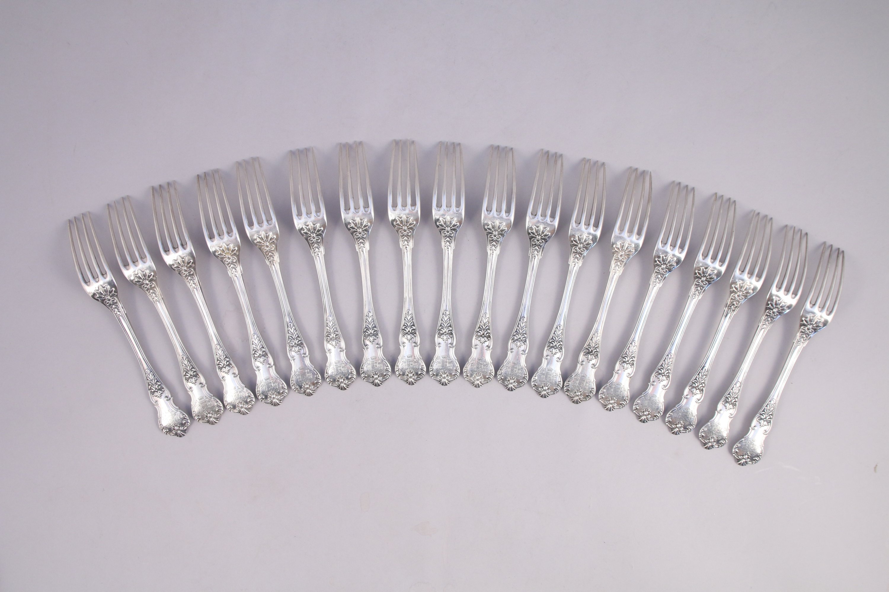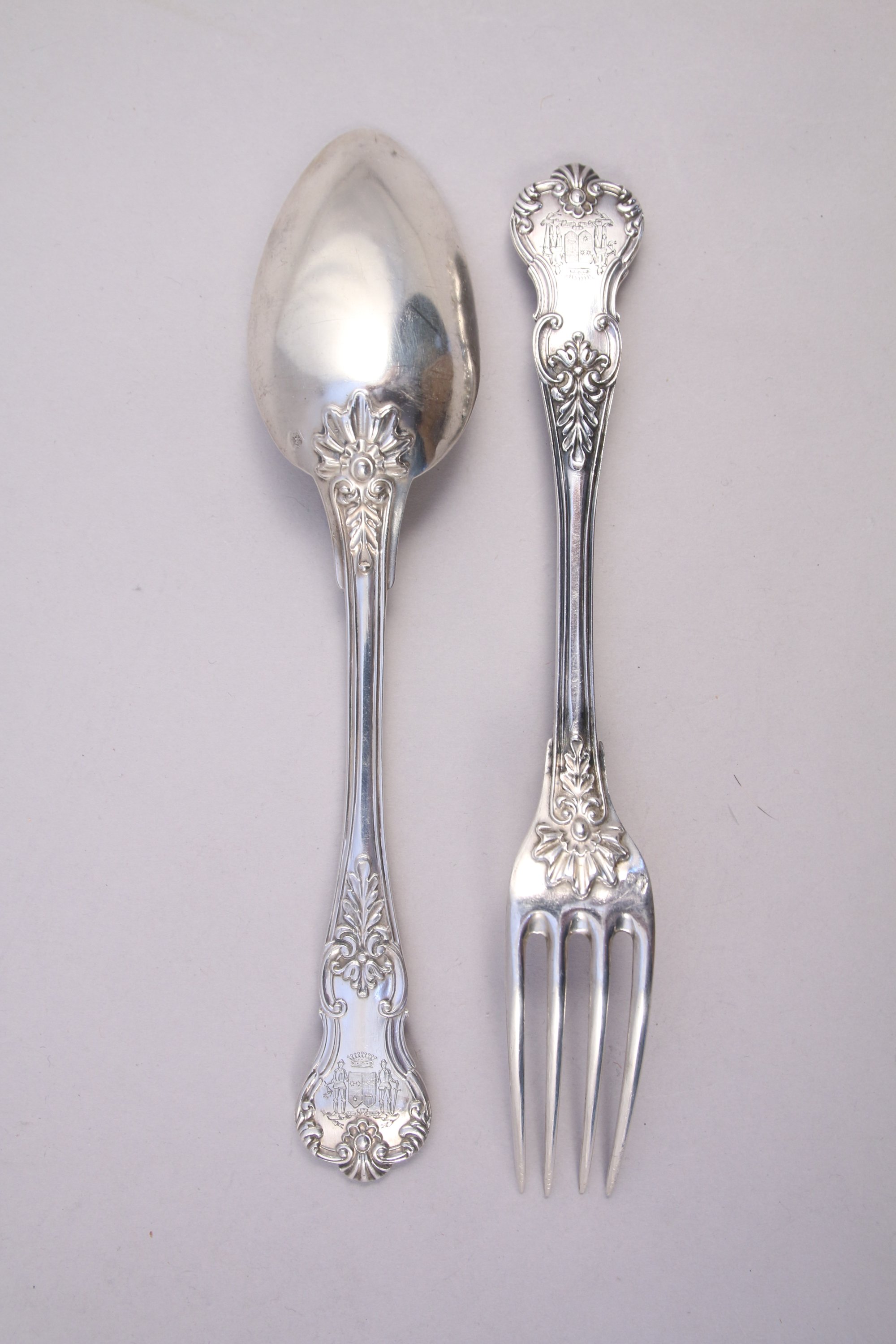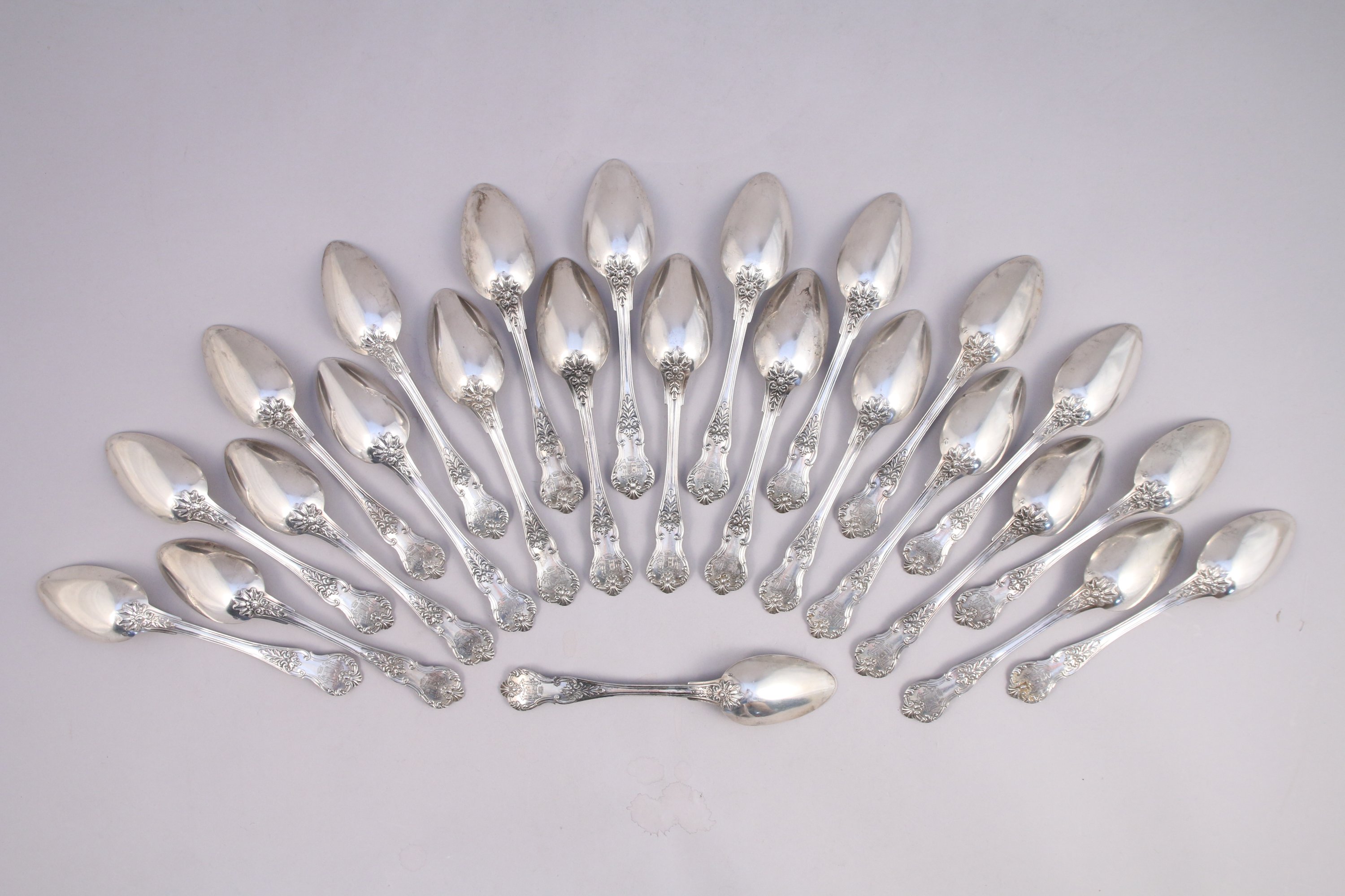 PARTIE de MÉNAGÈRE de QUARANTE-TROIS PIÈCES en argent comprenant VINGT-QUATRE CUILLIÈRES et DIX-NEUF FOURCHETTES de TABLE, modèle violoné à décor feuillagé et coquilles stylisées. Armoiries d'alliances surmontées d'une couronne comtale, au dessous devise "Ignis et ferrum" (Le feu et le Fer) dans un phylactère.