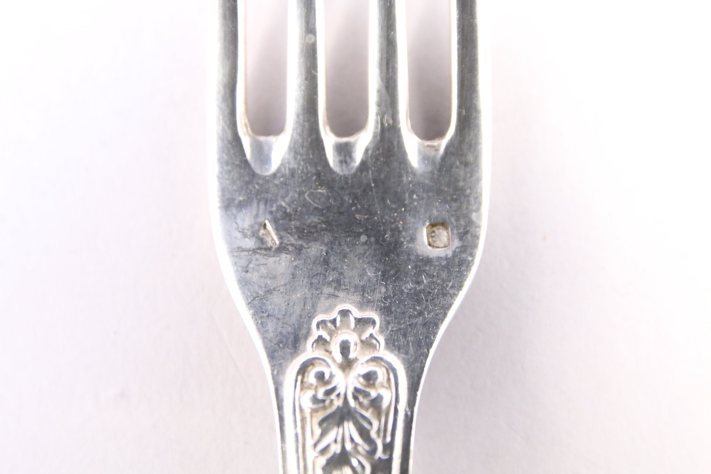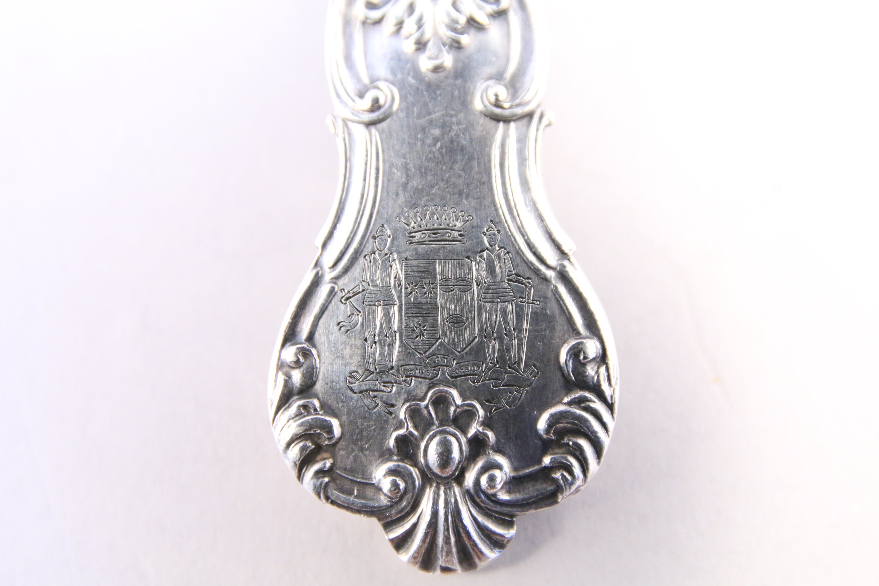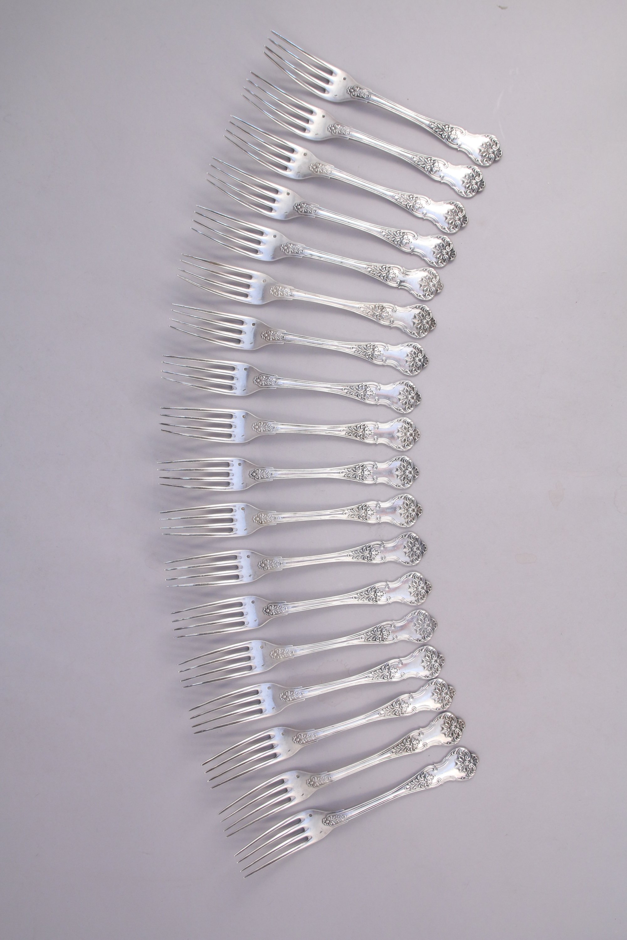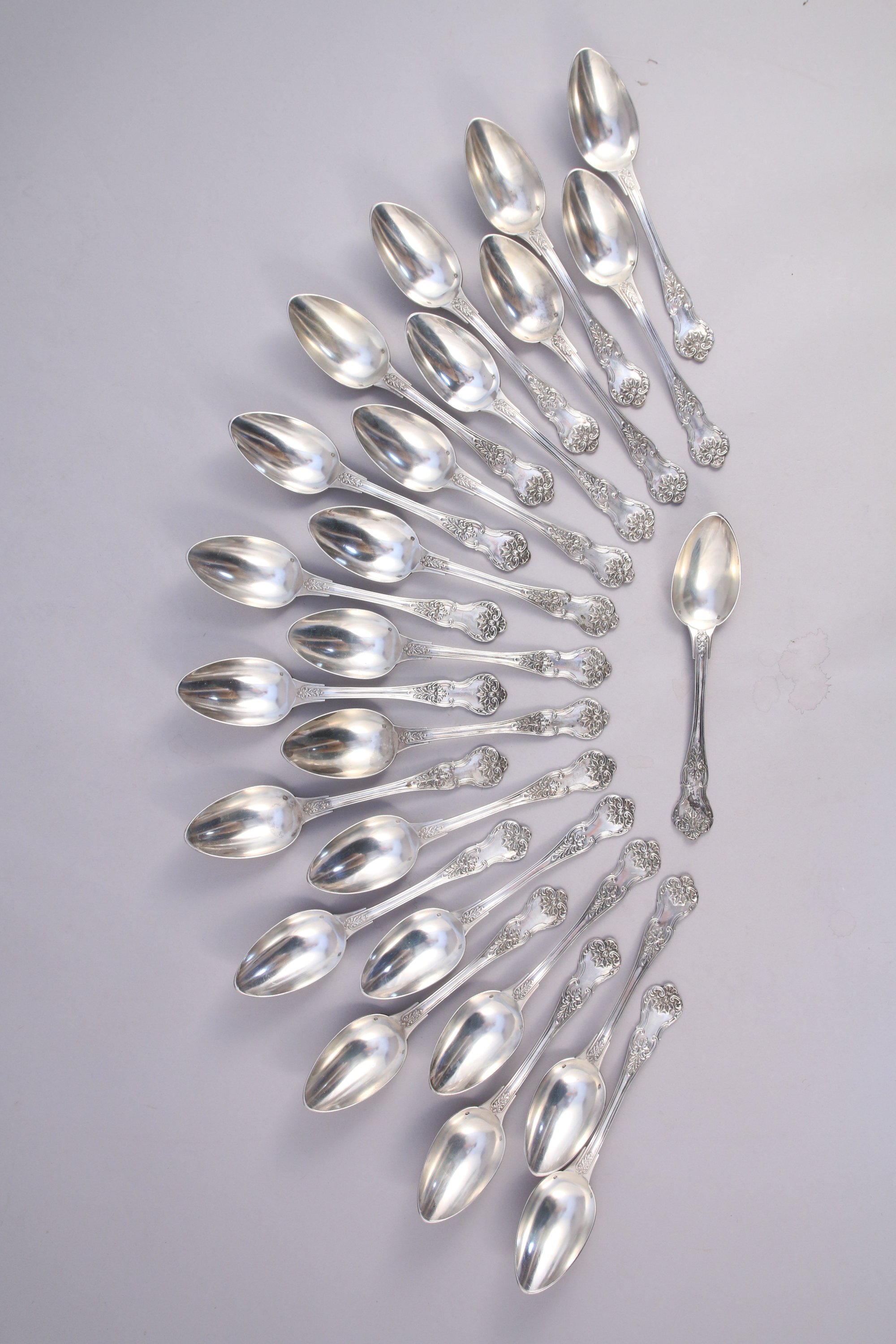 PARTIE de MÉNAGÈRE de QUARANTE-TROIS PIÈCES en argent comprenant VINGT-QUATRE CUILLIÈRES et DIX-NEUF FOURCHETTES de TABLE, modèle violoné à décor feuillagé et coquilles stylisées. Armoiries d'alliances surmontées d'une couronne comtale, au dessous devise "Ignis et ferrum" (Le feu et le Fer) dans un phylactère.