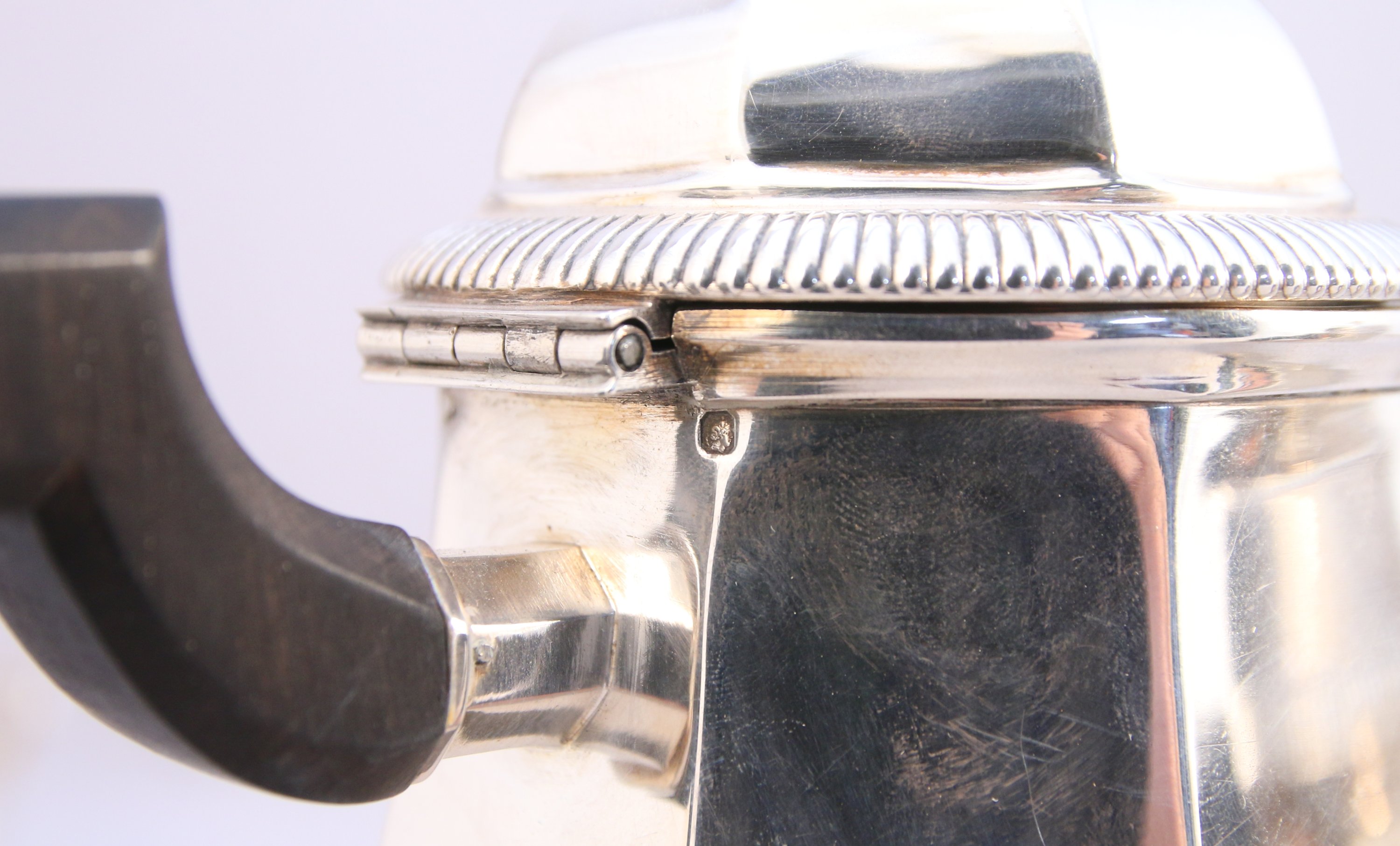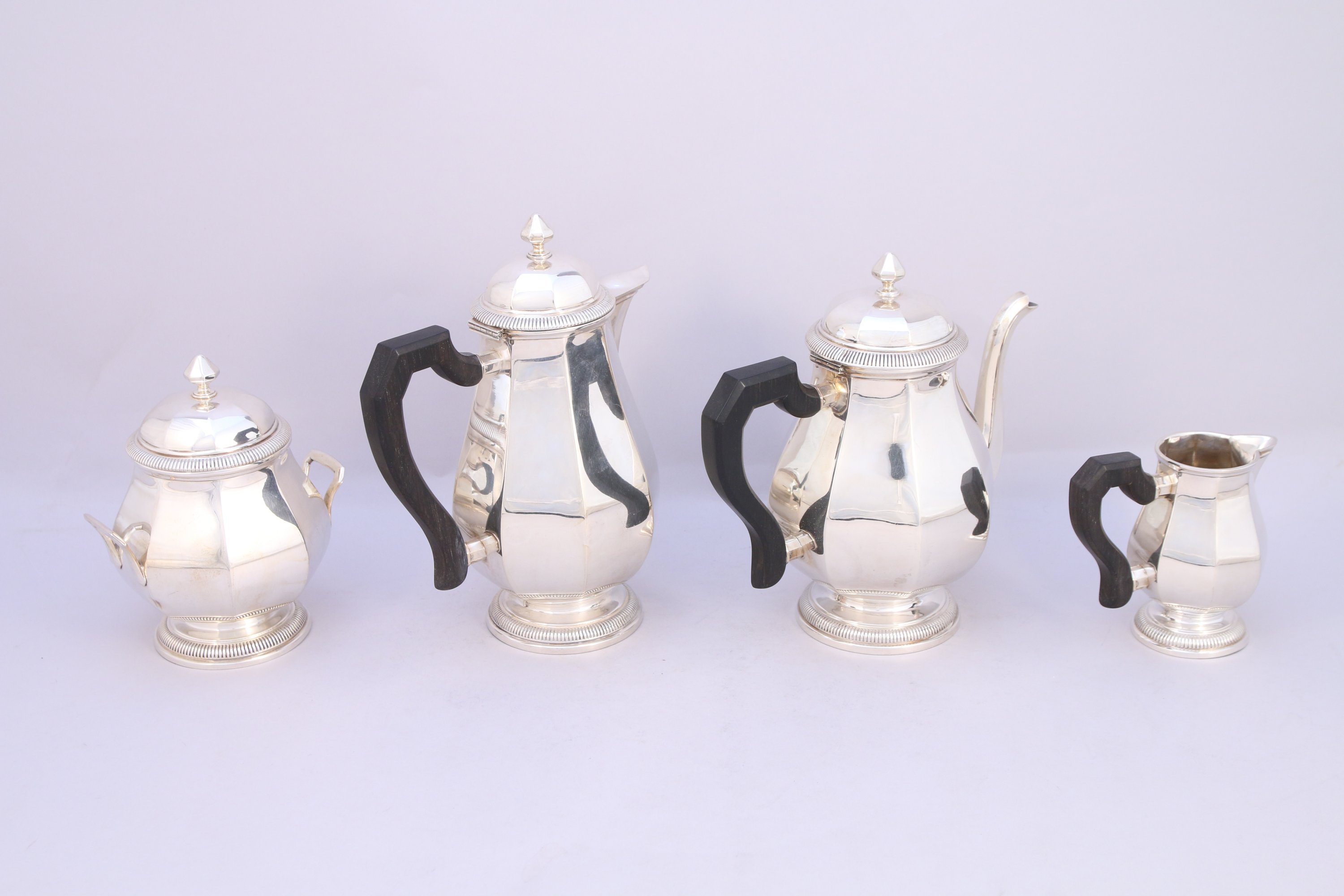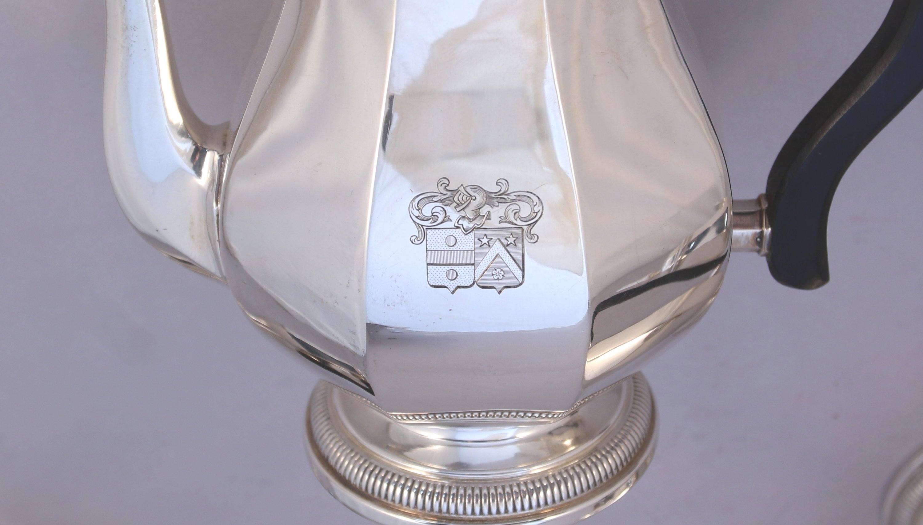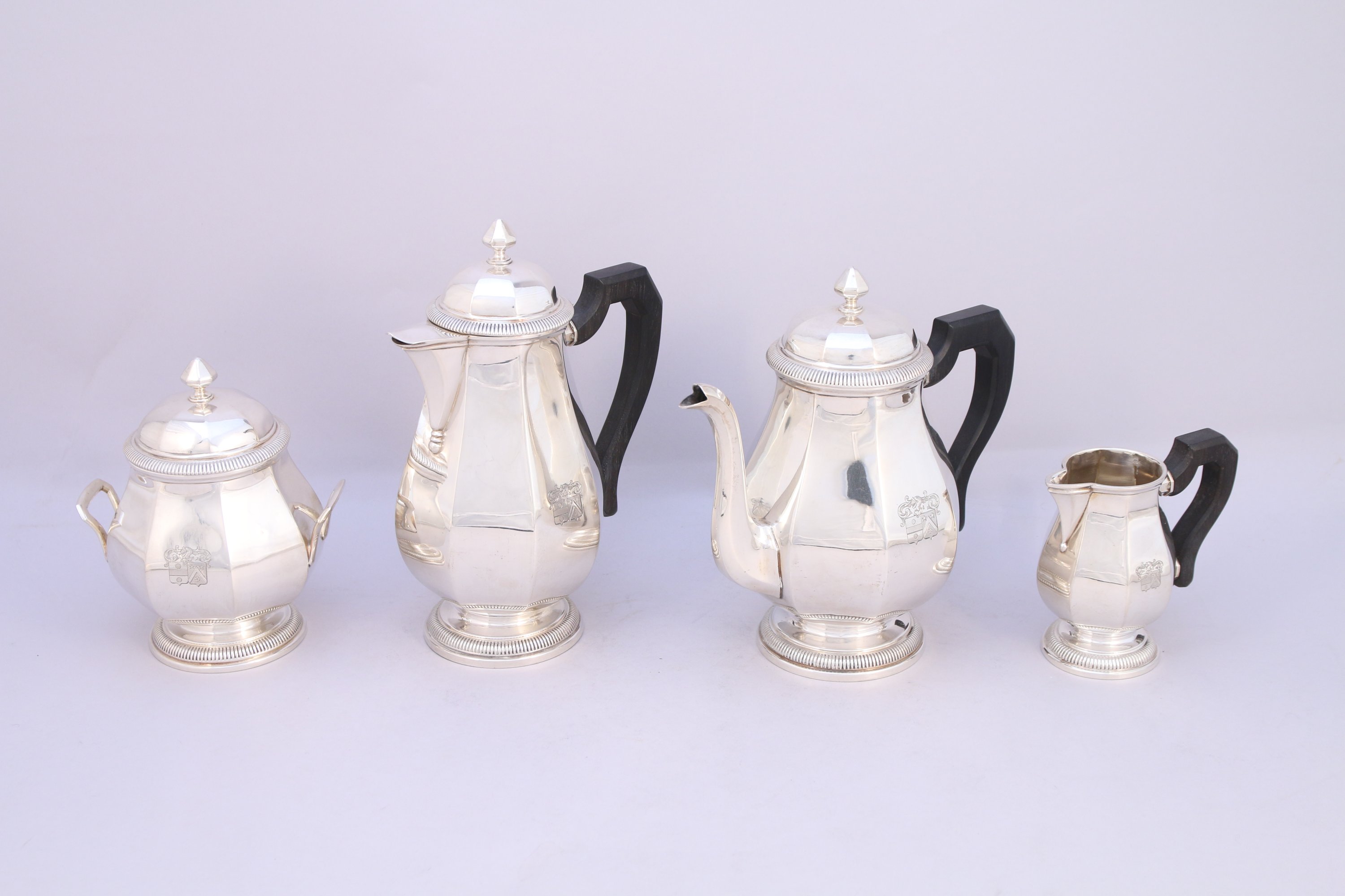 SERVICE à THÉ et CAFÉ en argent de QUATRE PIÈCES. Il se compose d'une théière, d'une cafetière, d'un sucrier et d'un pot-à-lait. De forme balustre à pans, le couvercle et le piédouche bordé d'une frise de godrons. Frétel de forme géométrique, anses latérales en ébène. Panse gravée d'armoiries d'alliance surmontées d'un heaume.