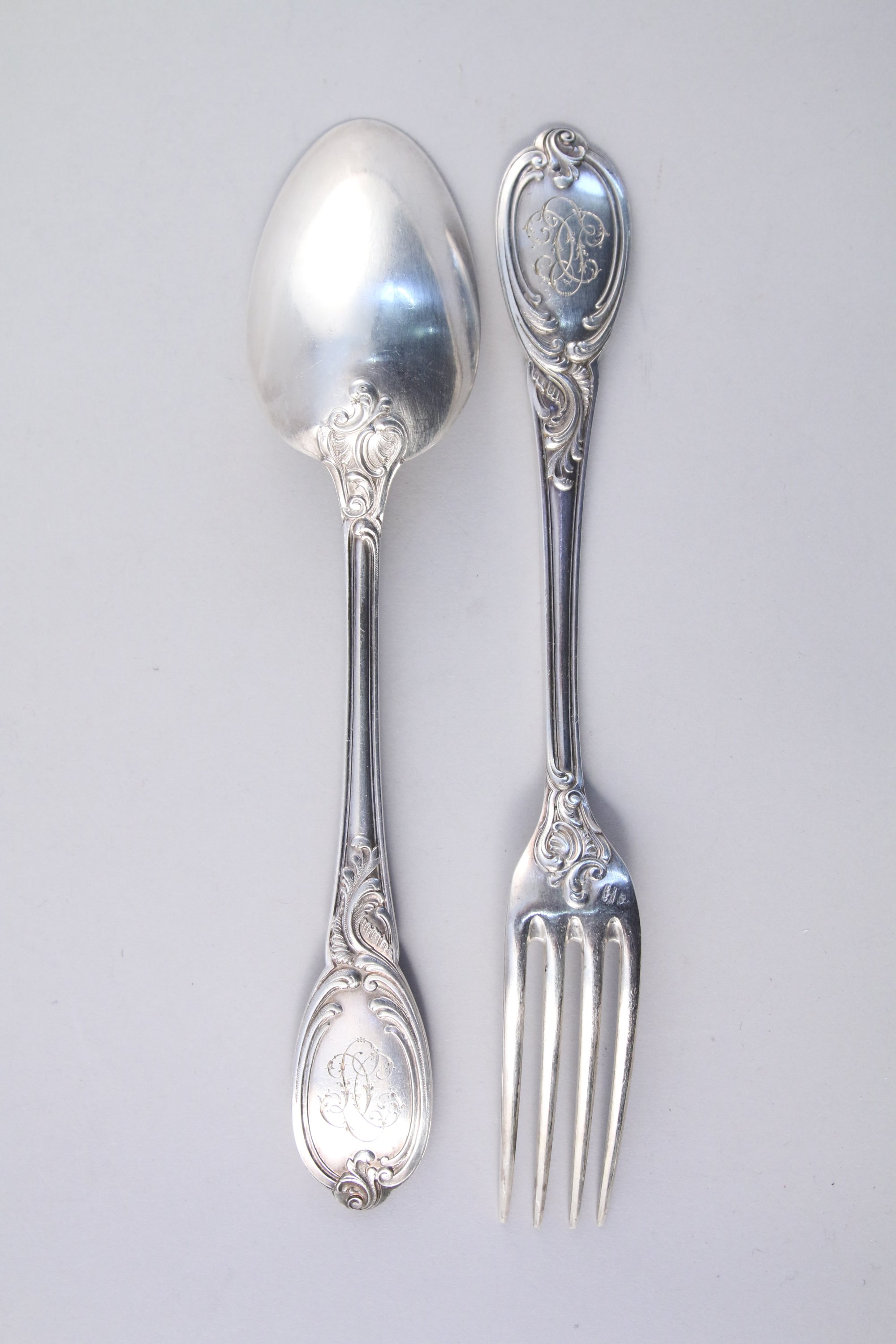 PARTIE de MÉNAGÈRE VINGT-TROIS PIÈCES en argent comprenant DOUZE FOURCHETTES et ONZE CUILLÈRES à ENTREMETS en argent, modèle à enroulement feuillagé en agrafe monogrammé "LX".