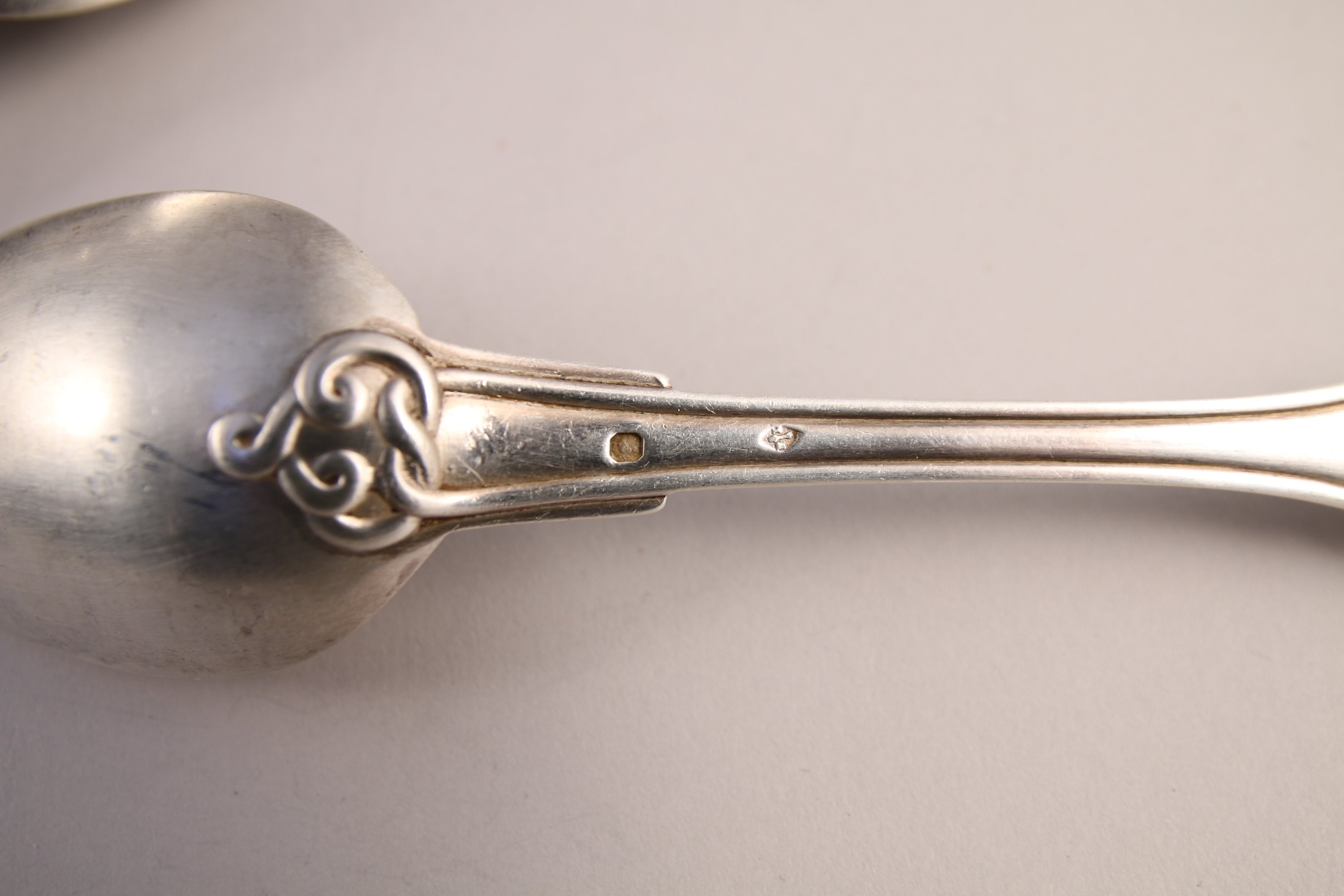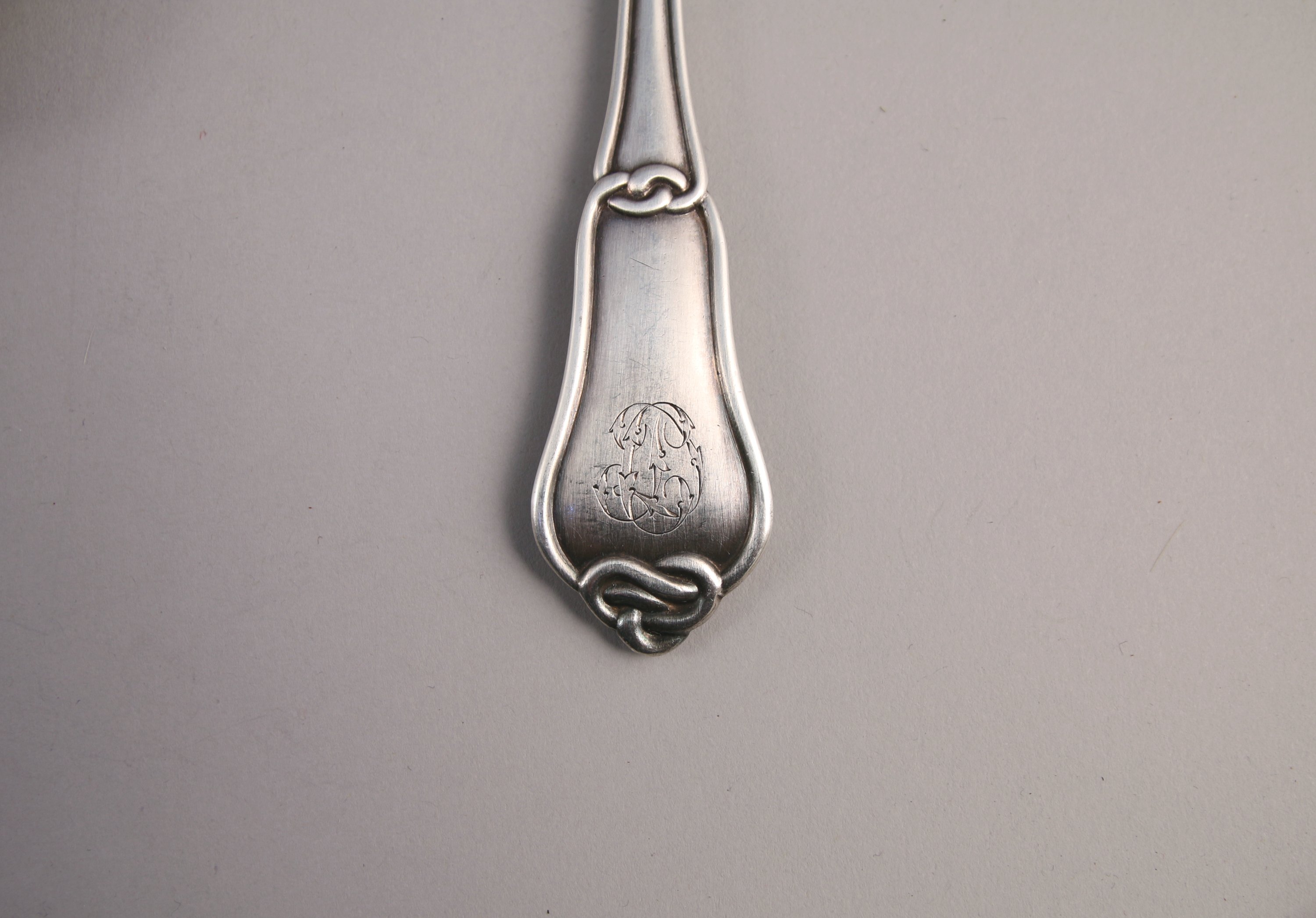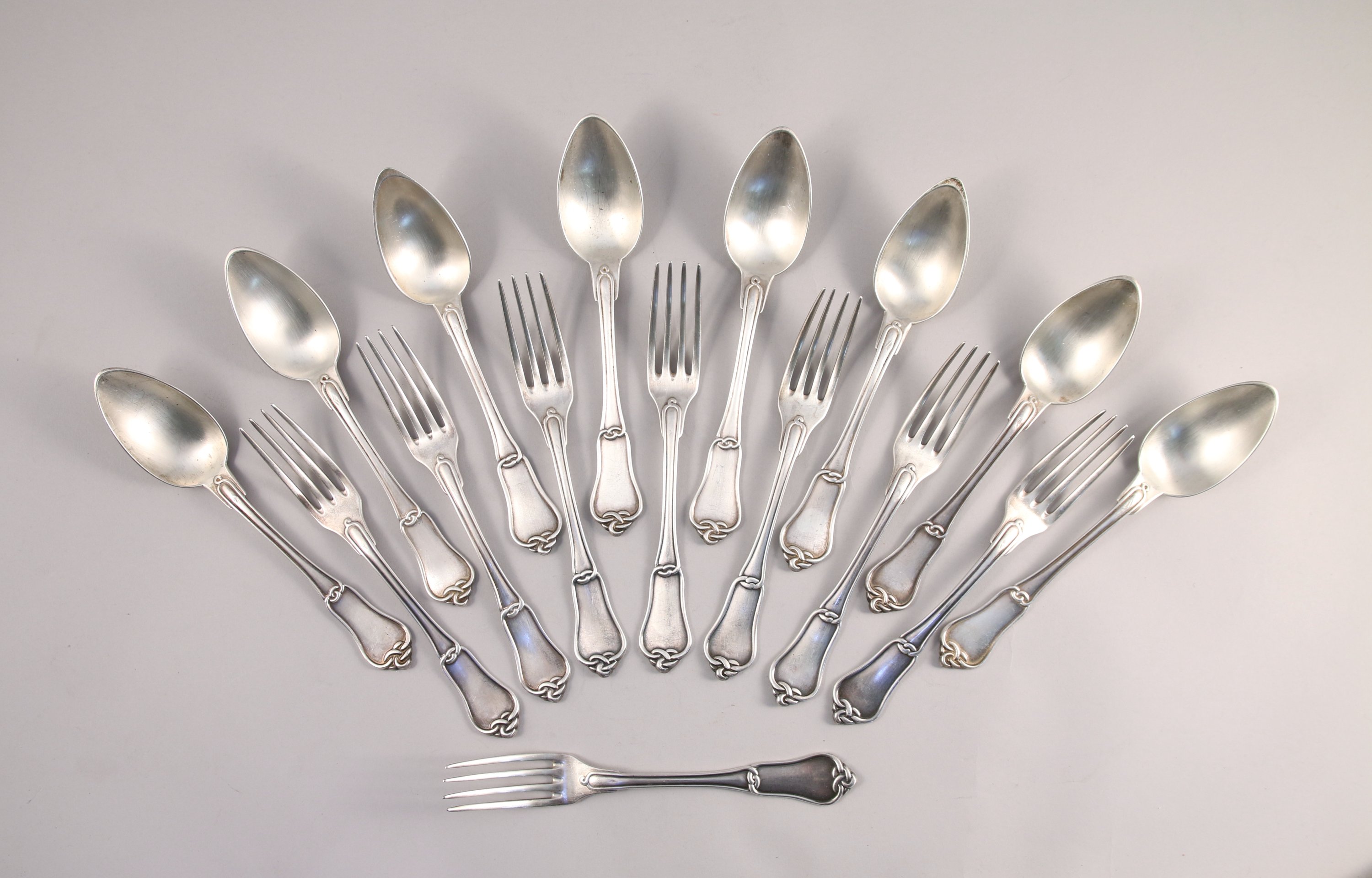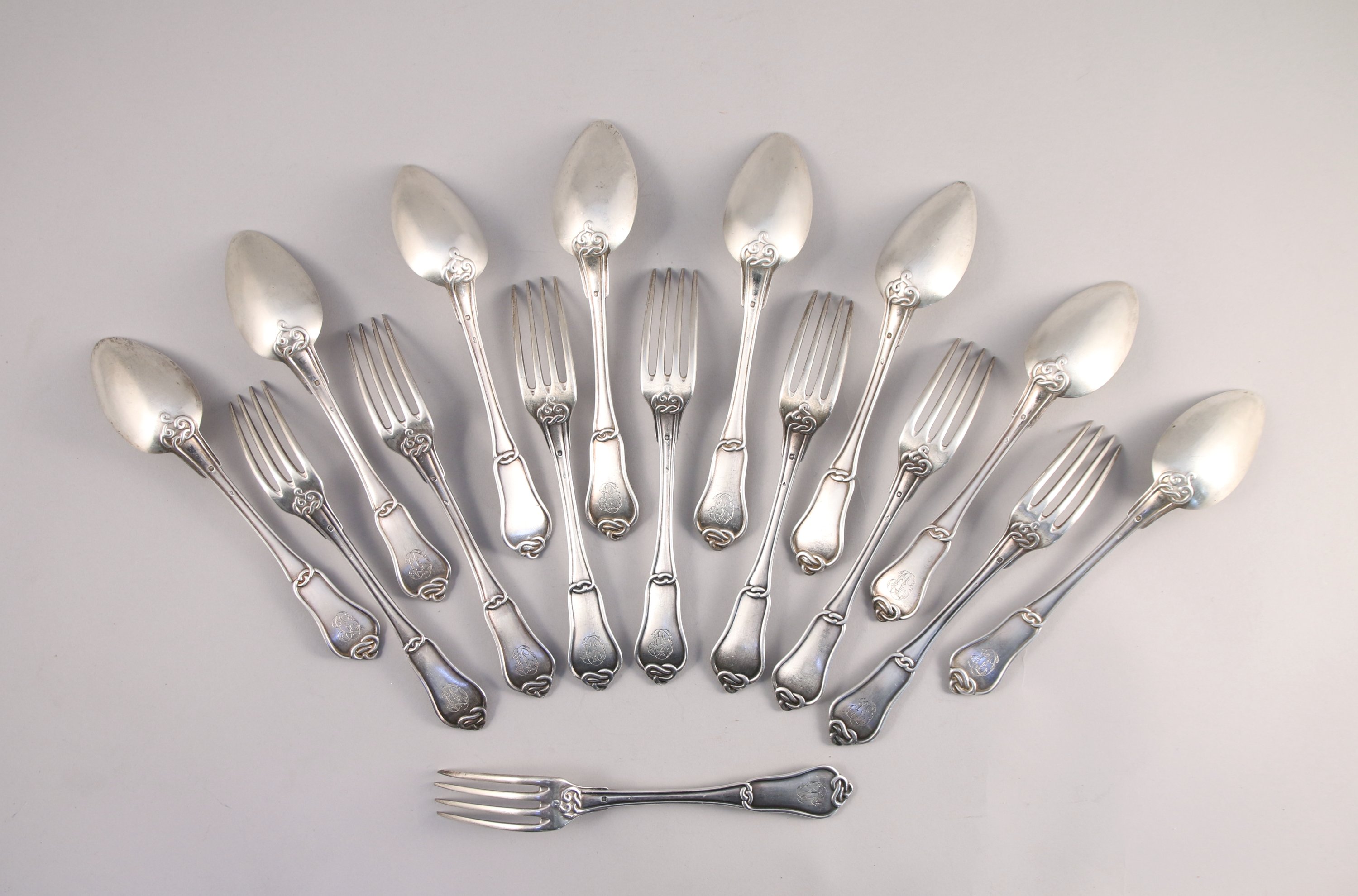 HUIT COUVERTS de TABLE en argent, modèle noeud gordien dont six couverts monogrammés "CD".