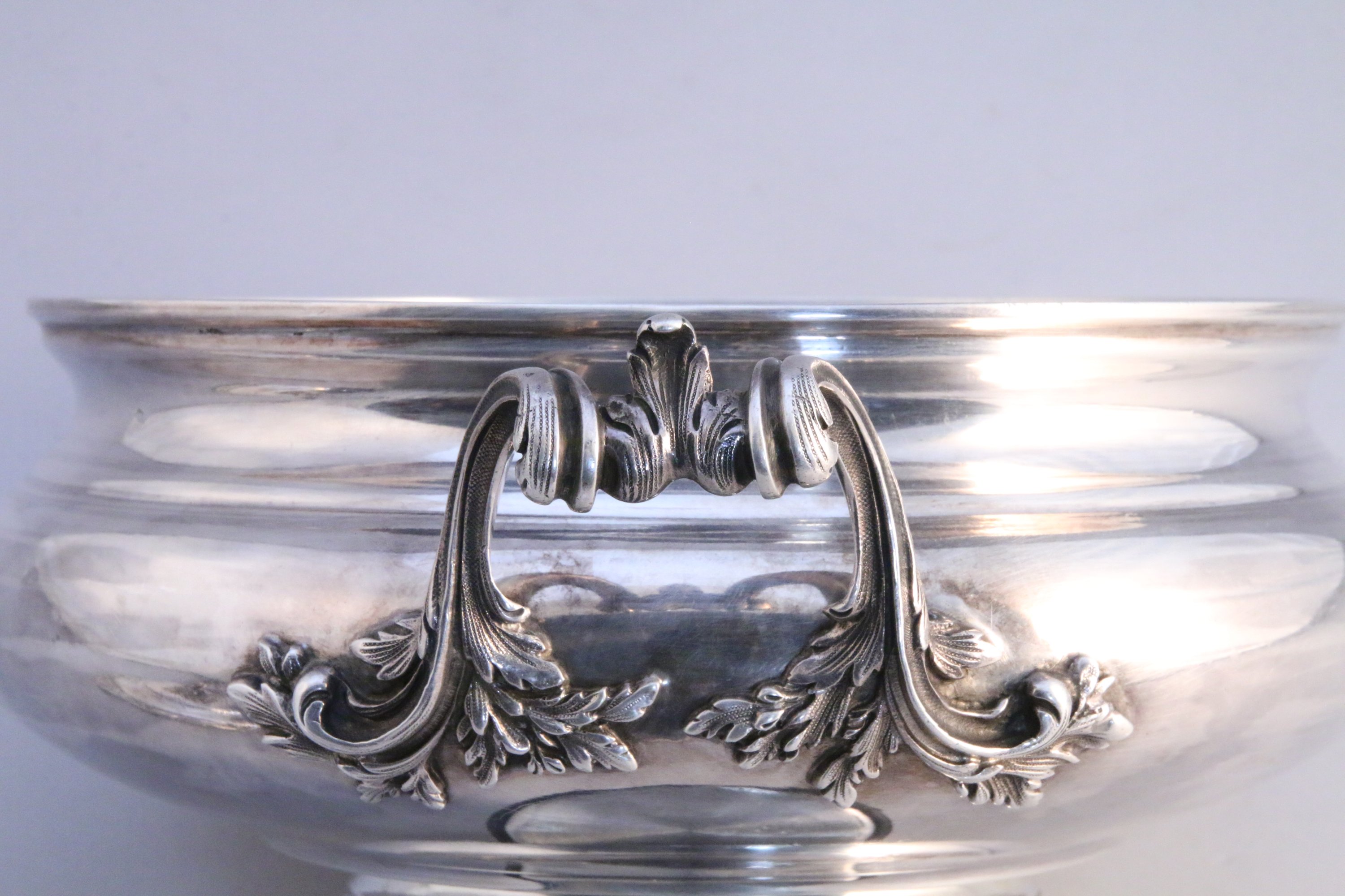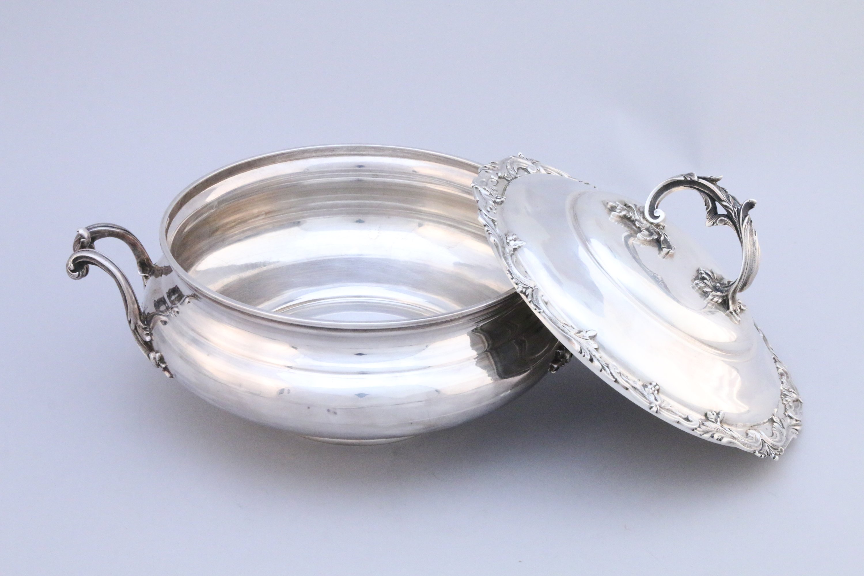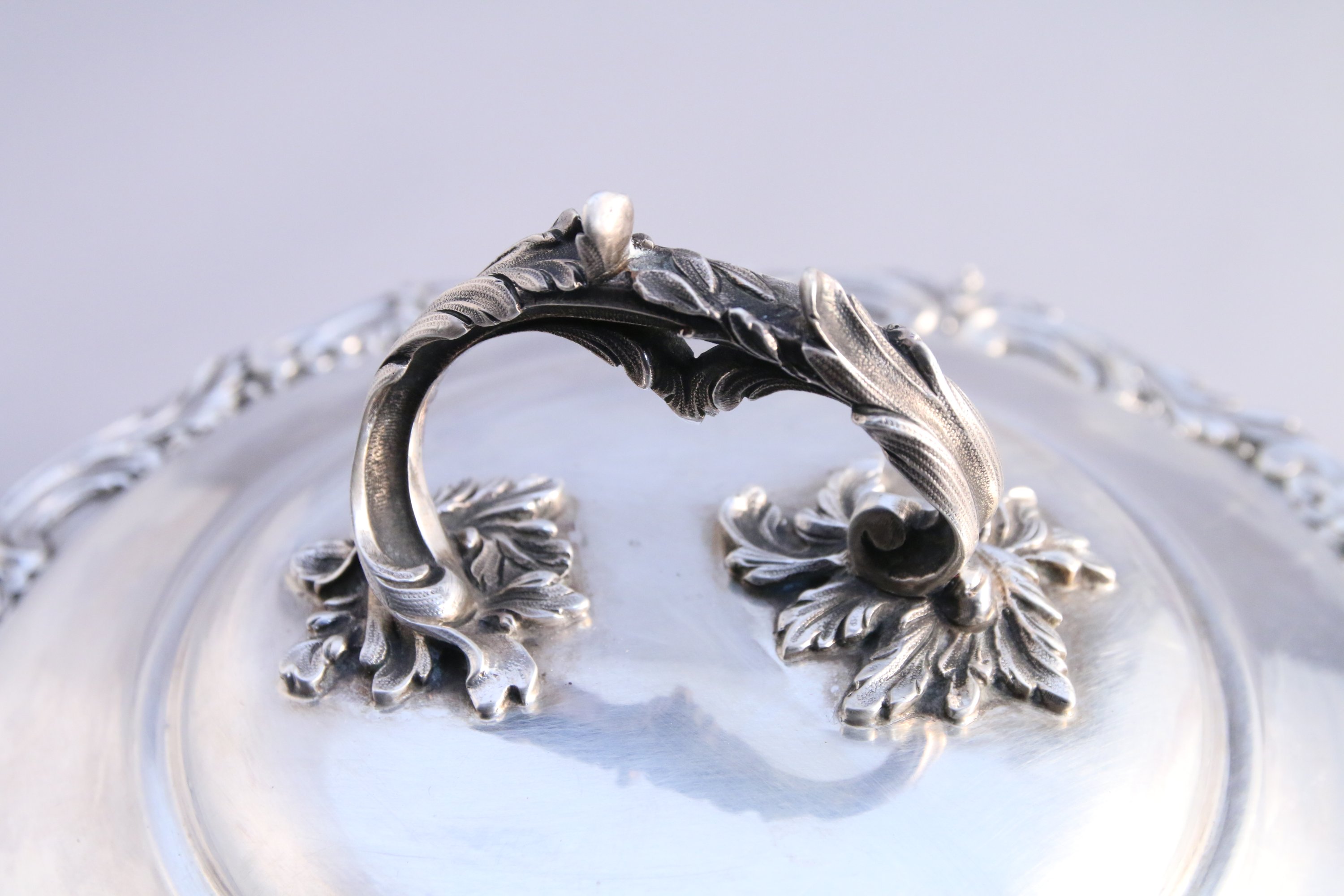 GRAND LÉGUMIER en argent de forme renflée, anses latérales à enroulements feuillagés. Couvercle bordé d'une frise feuillagée surmonté d'une prise.