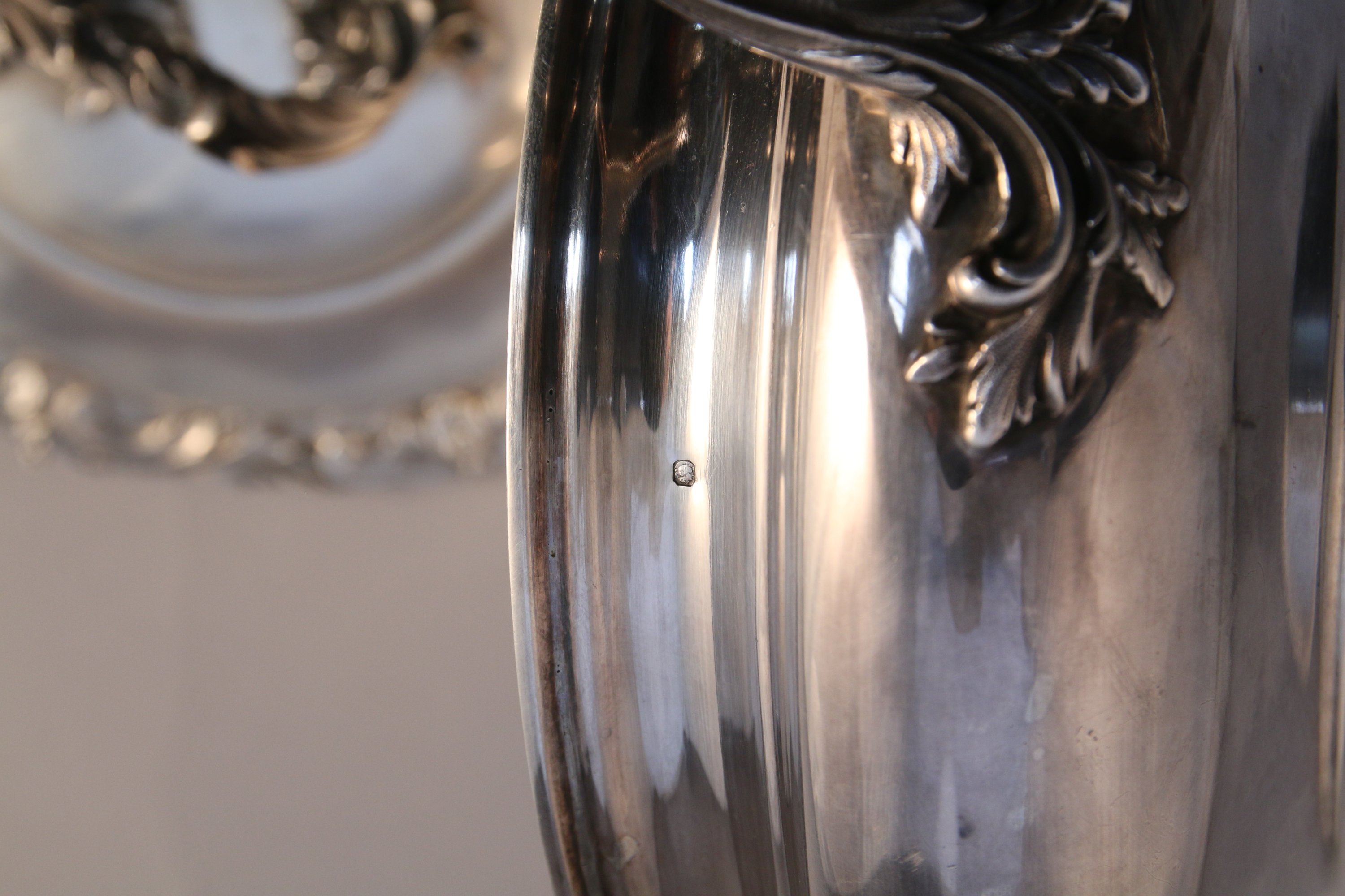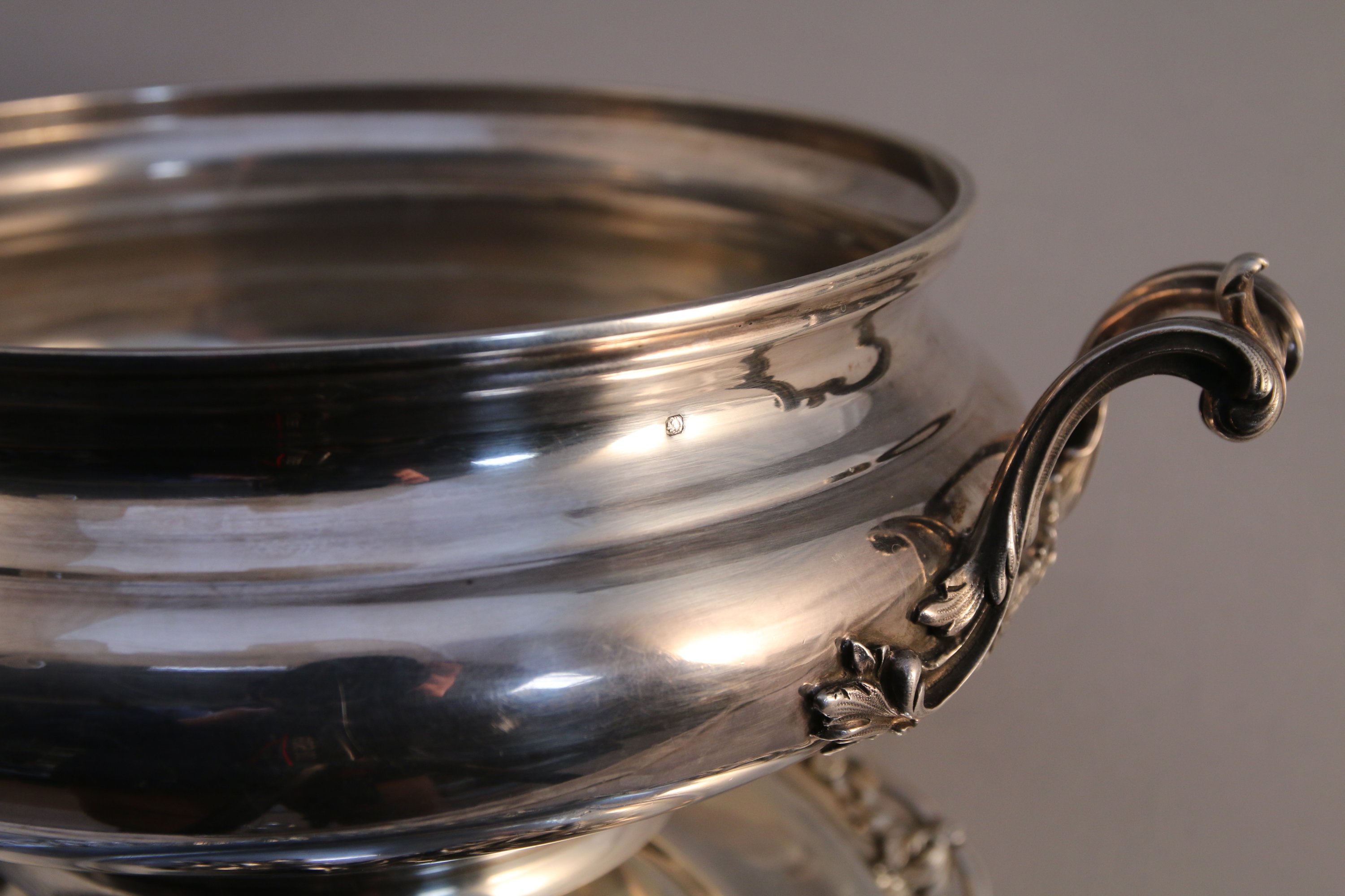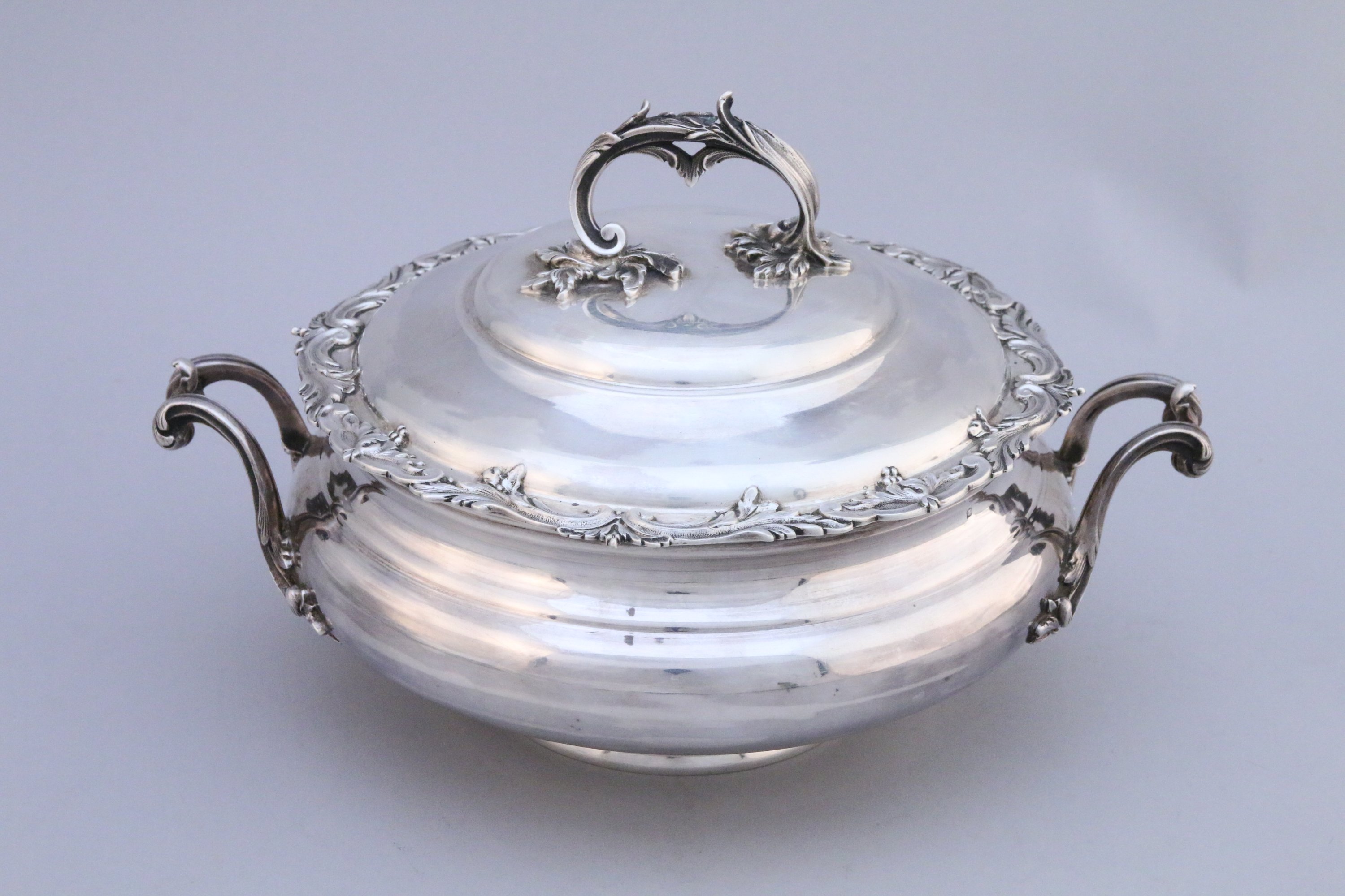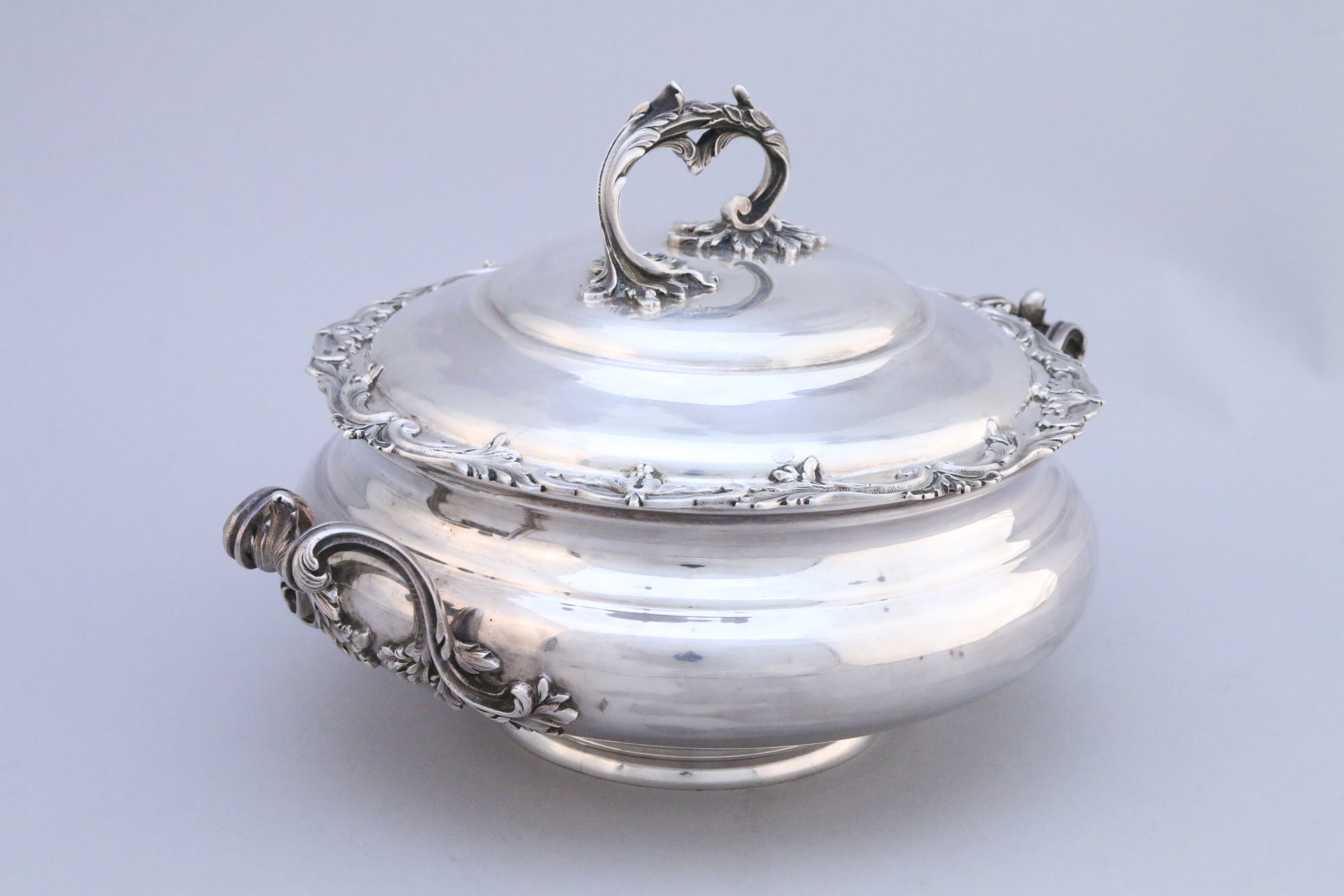 GRAND LÉGUMIER en argent de forme renflée, anses latérales à enroulements feuillagés. Couvercle bordé d'une frise feuillagée surmonté d'une prise.