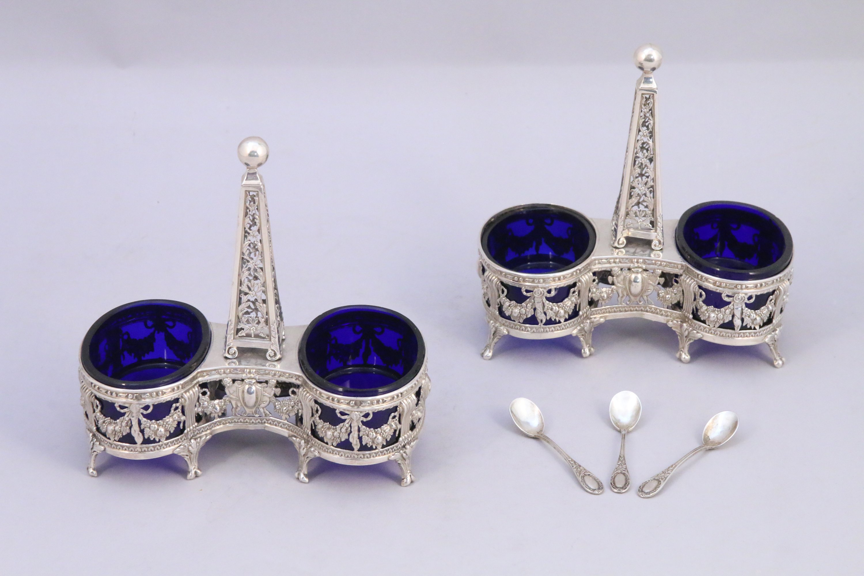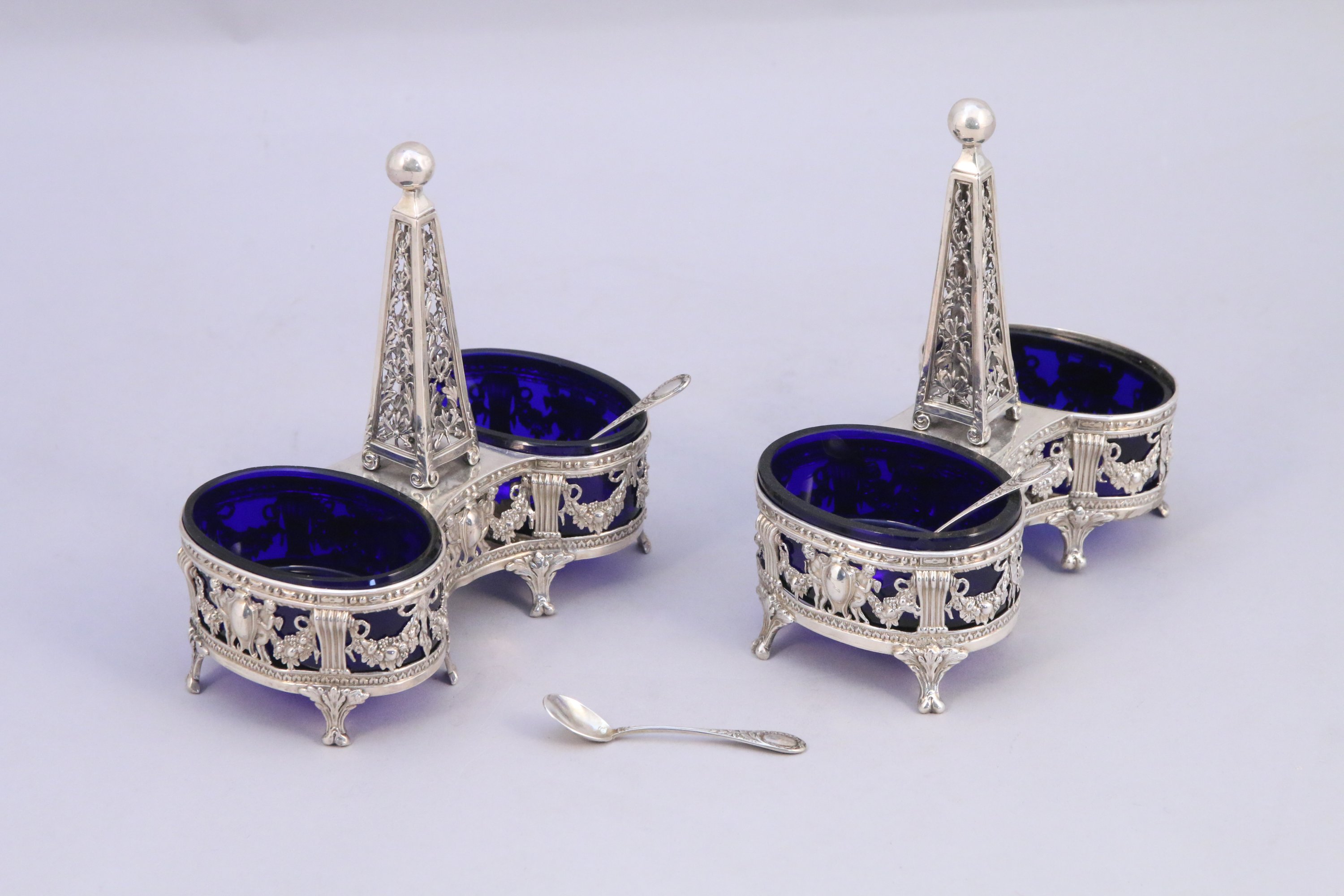 PAIRE de SALERONS doubles en argent, réceptacles de forme ovale à riche décor ajouré
