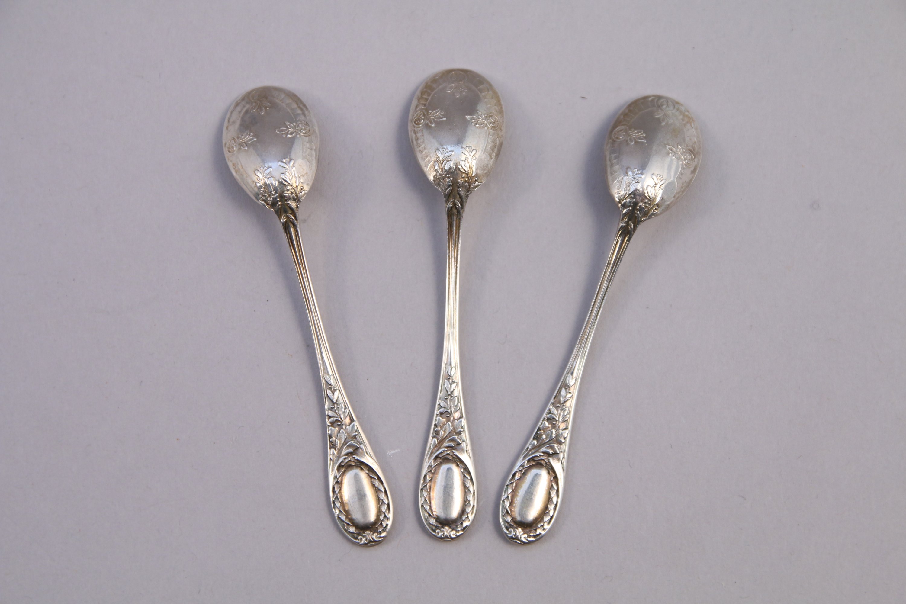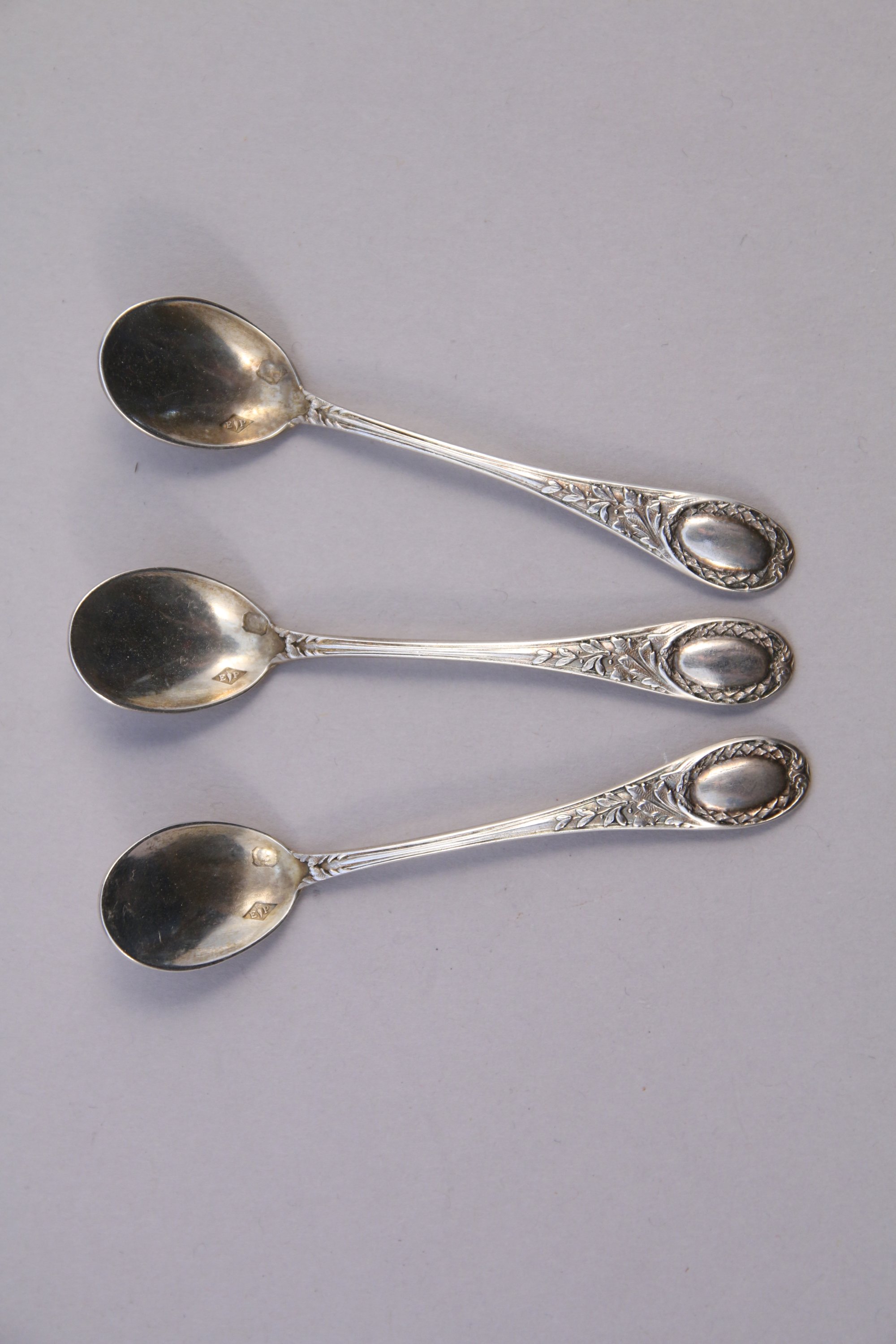 JOINT: TROIS PELLES à SEL en argent, modèle feuillagé. Poinçon Minerve, XIXe, XXe. Orfèvre. Emile Puiforcat. Haut. 7 cm. Poids: 15 g.