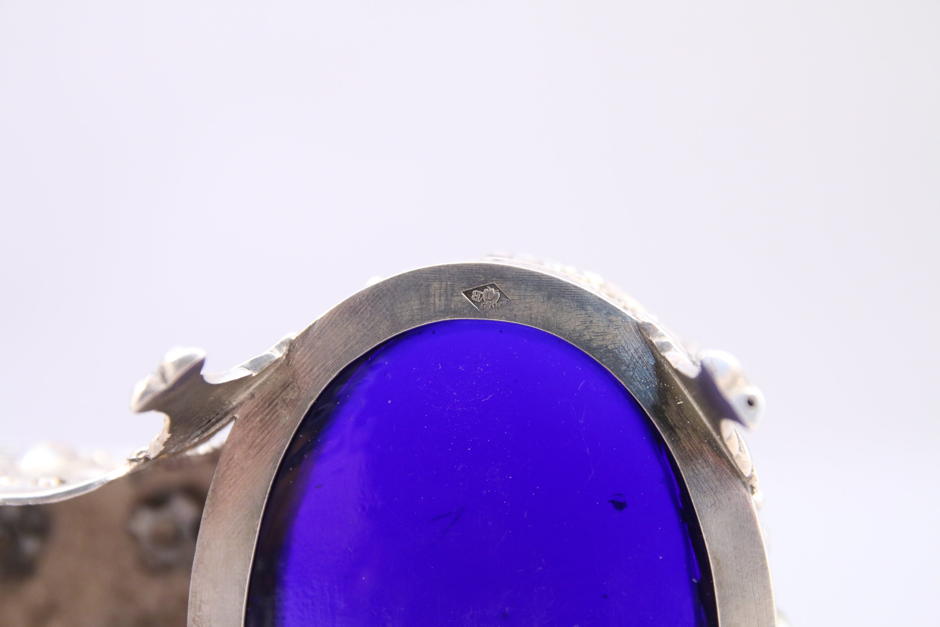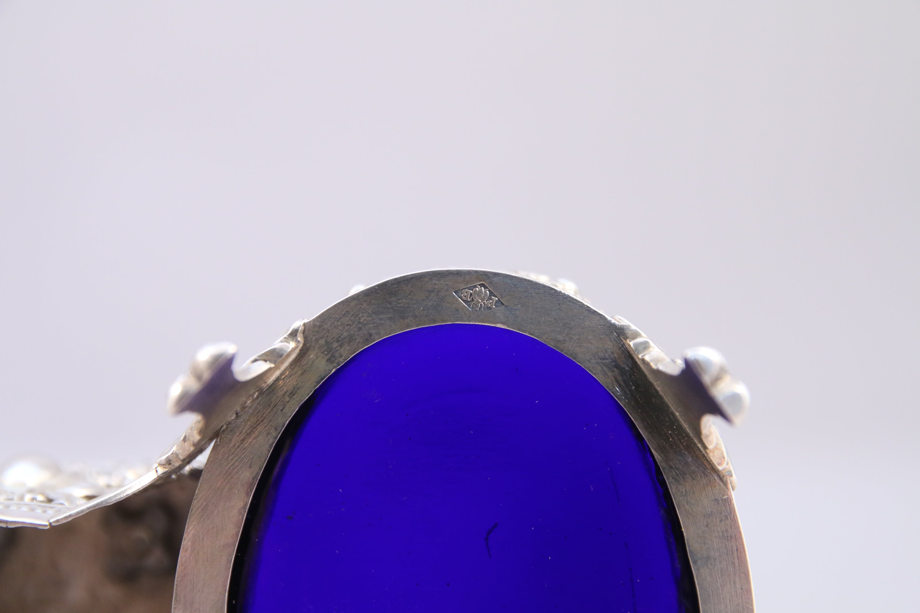 de guirlandes de fleurs, pilastres, noeuds de rubans et de cartouches soutenus par des amours ailés. Prise adoptant la forme d'une obélisque ajourée de rinceaux feuillagés sommée d'une boule. Pieds feuillagés. Intérieur en verre bleu.