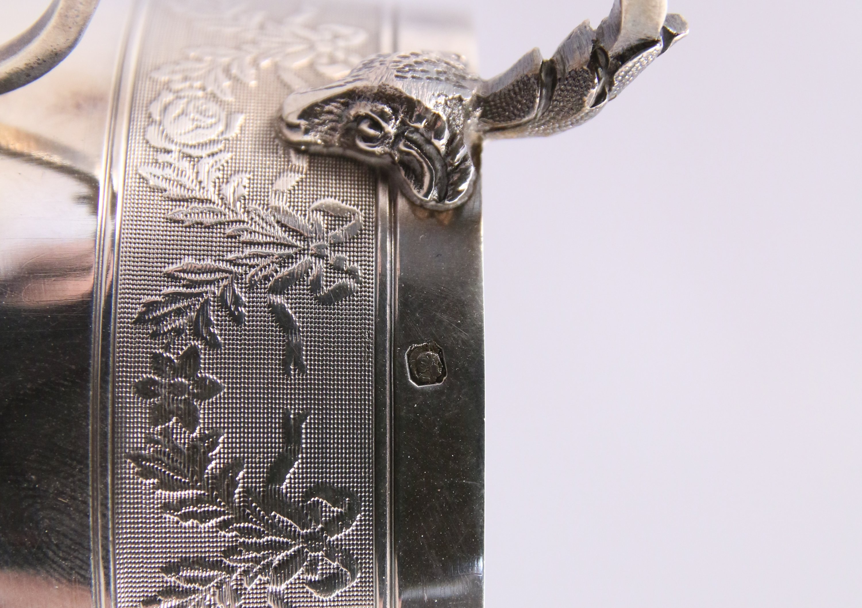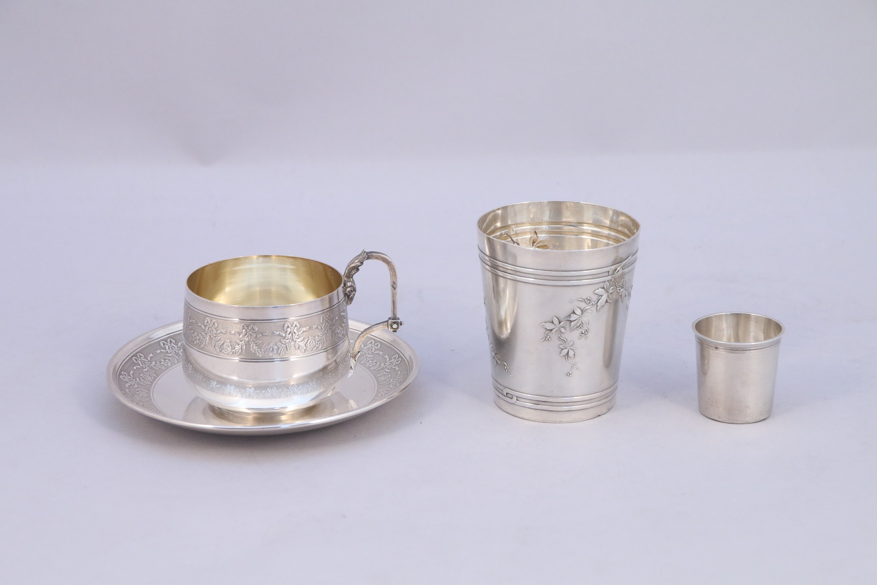 -TASSE et sa SOUS-TASSE à décor guilloché d'une frise de noeuds de rubans et guirlandes de fleurs, anse à décor d'une tête de bélier. Intérieur vermeillé. Poinçon Minerve XIXe-XXe. Orfèvre Victor Boivin. Haut de la tasse. 5,5, Diam. 6,7 cm. Diam de la sous-tasse. 13,5 cm. Poids 165 g.