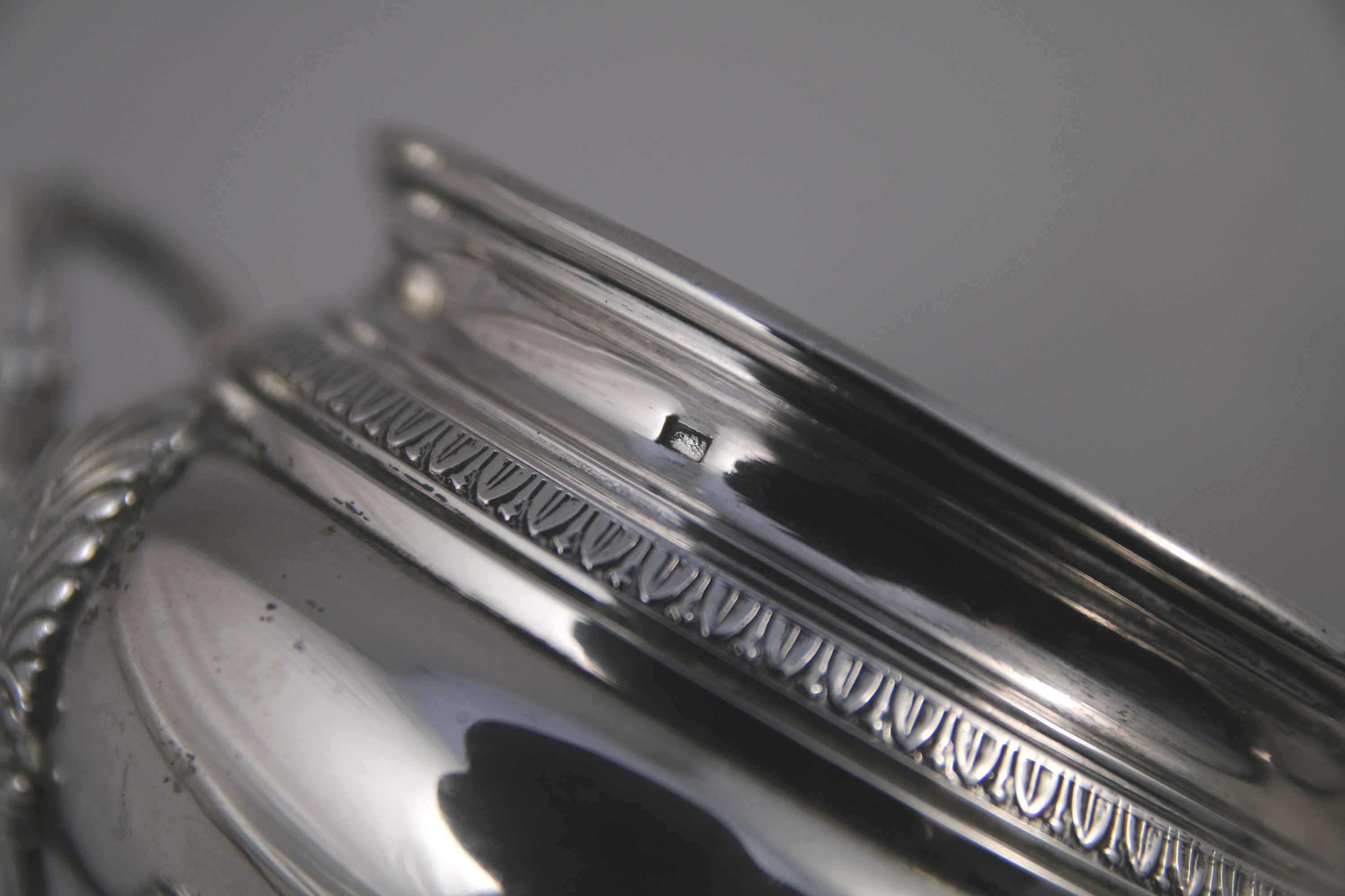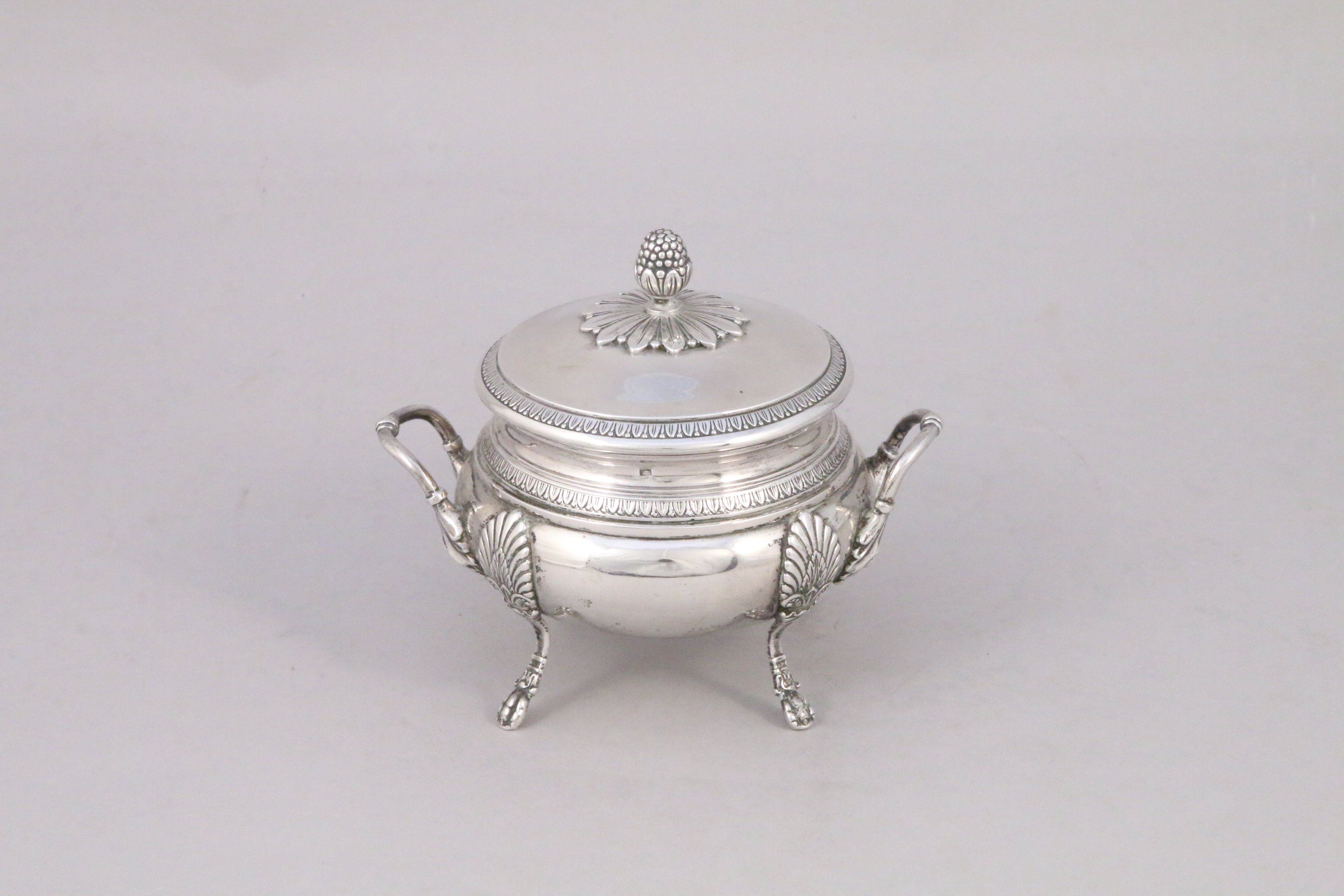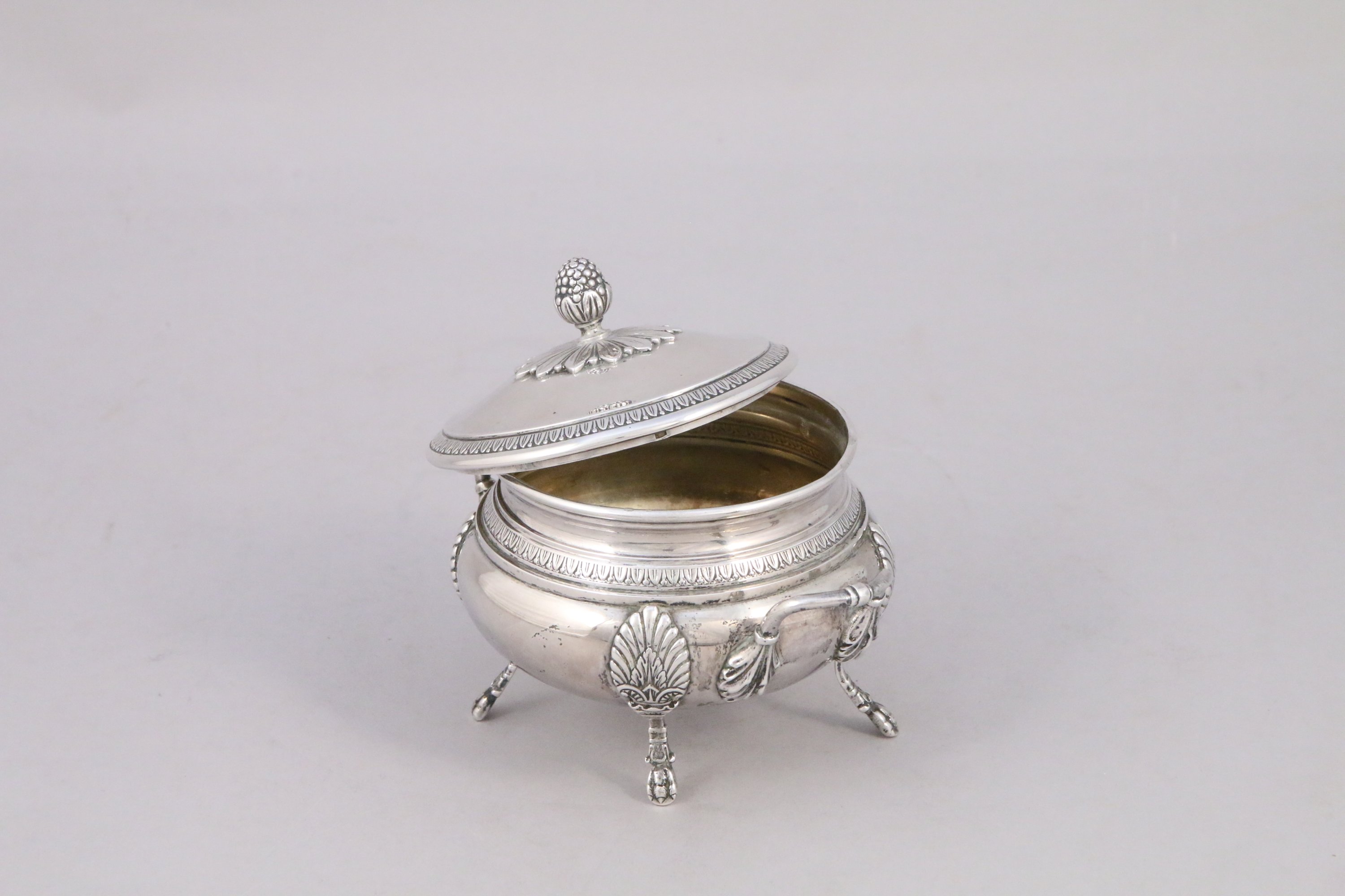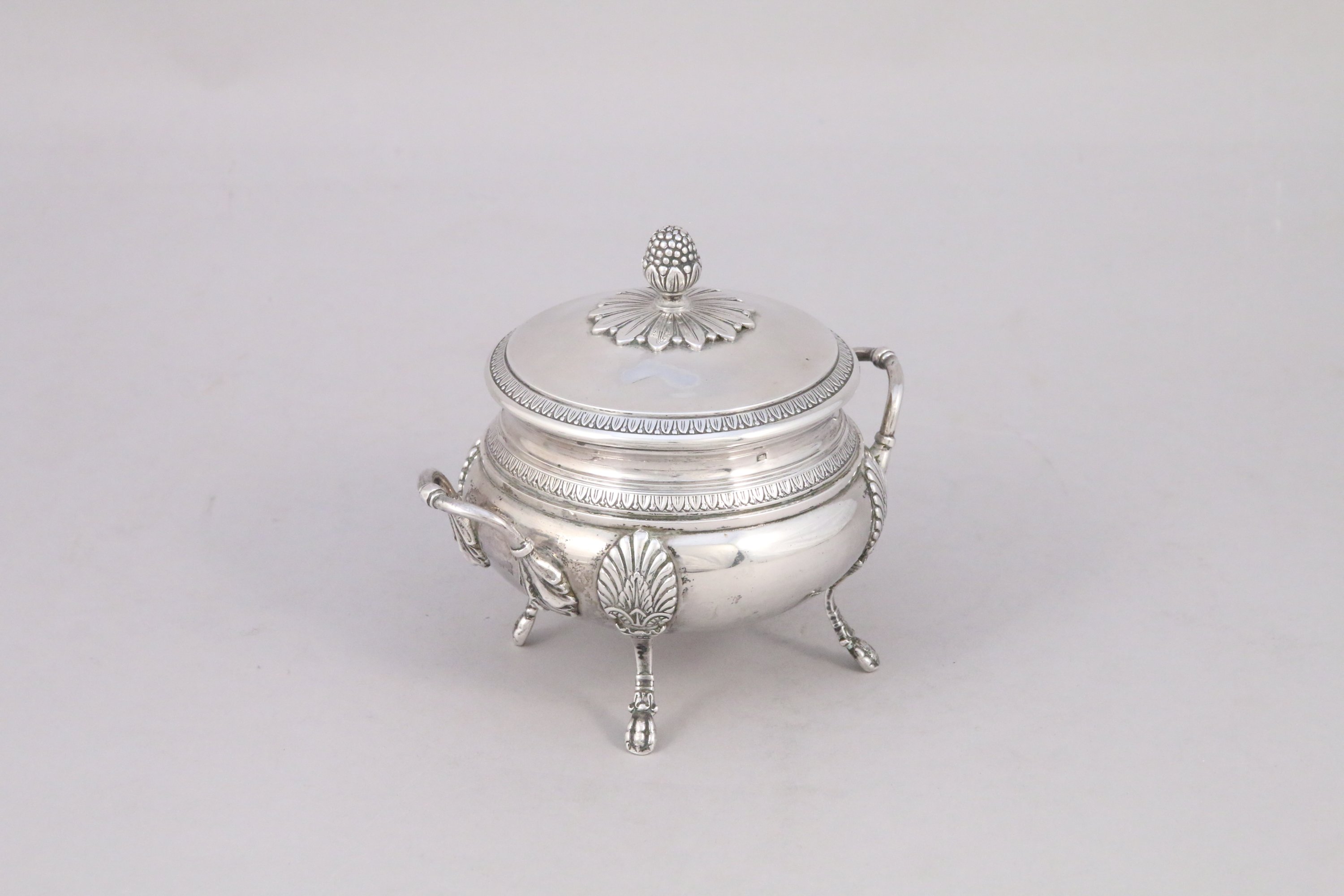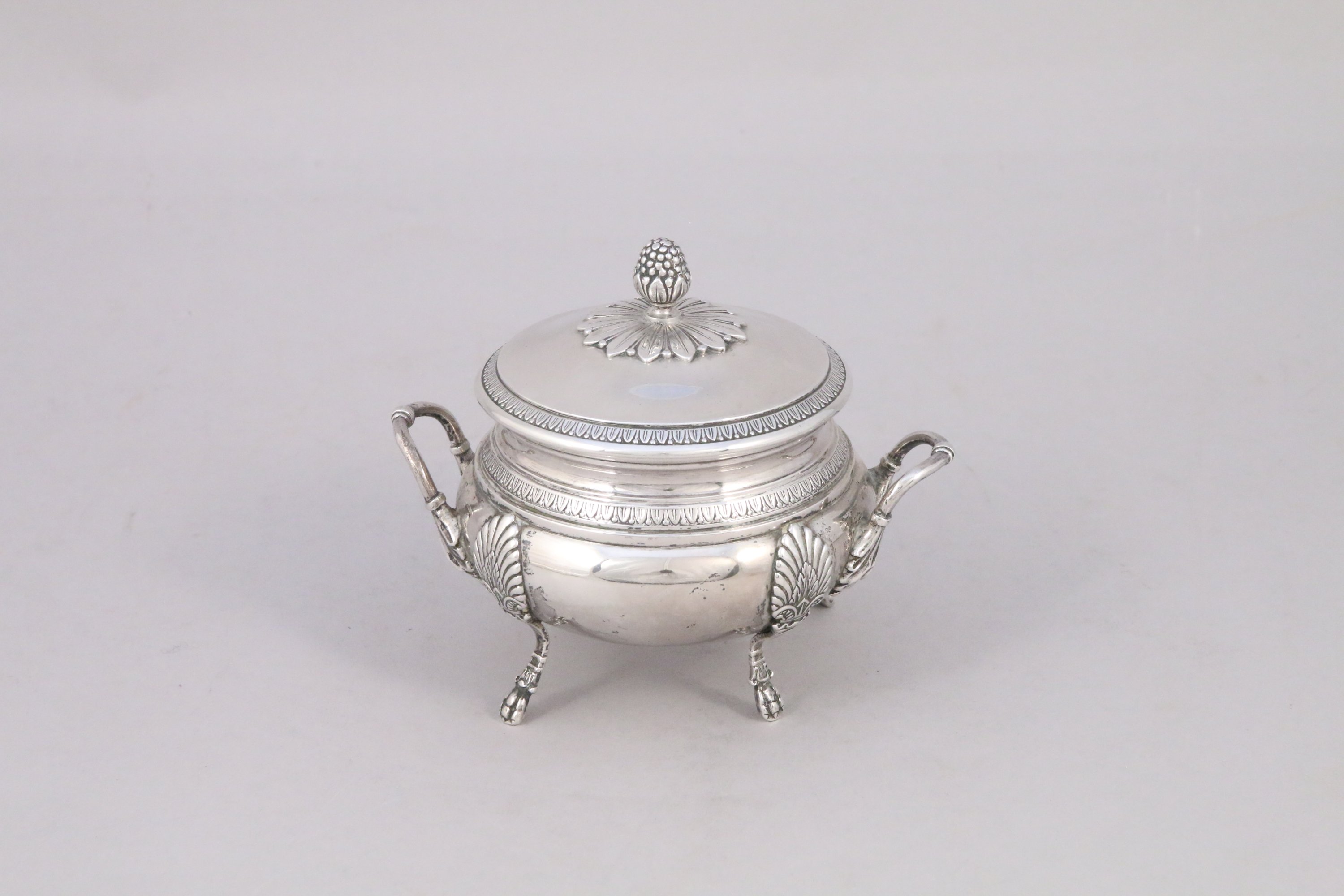 SUCRIER en argent à décor d'une frise d'oves et d'arces en rappel sur le bord du couvercle. Anses latérales à attaches feuillagées. Piétement quadripode à griffe et attache palmette. Couvercle à fretel en gland.