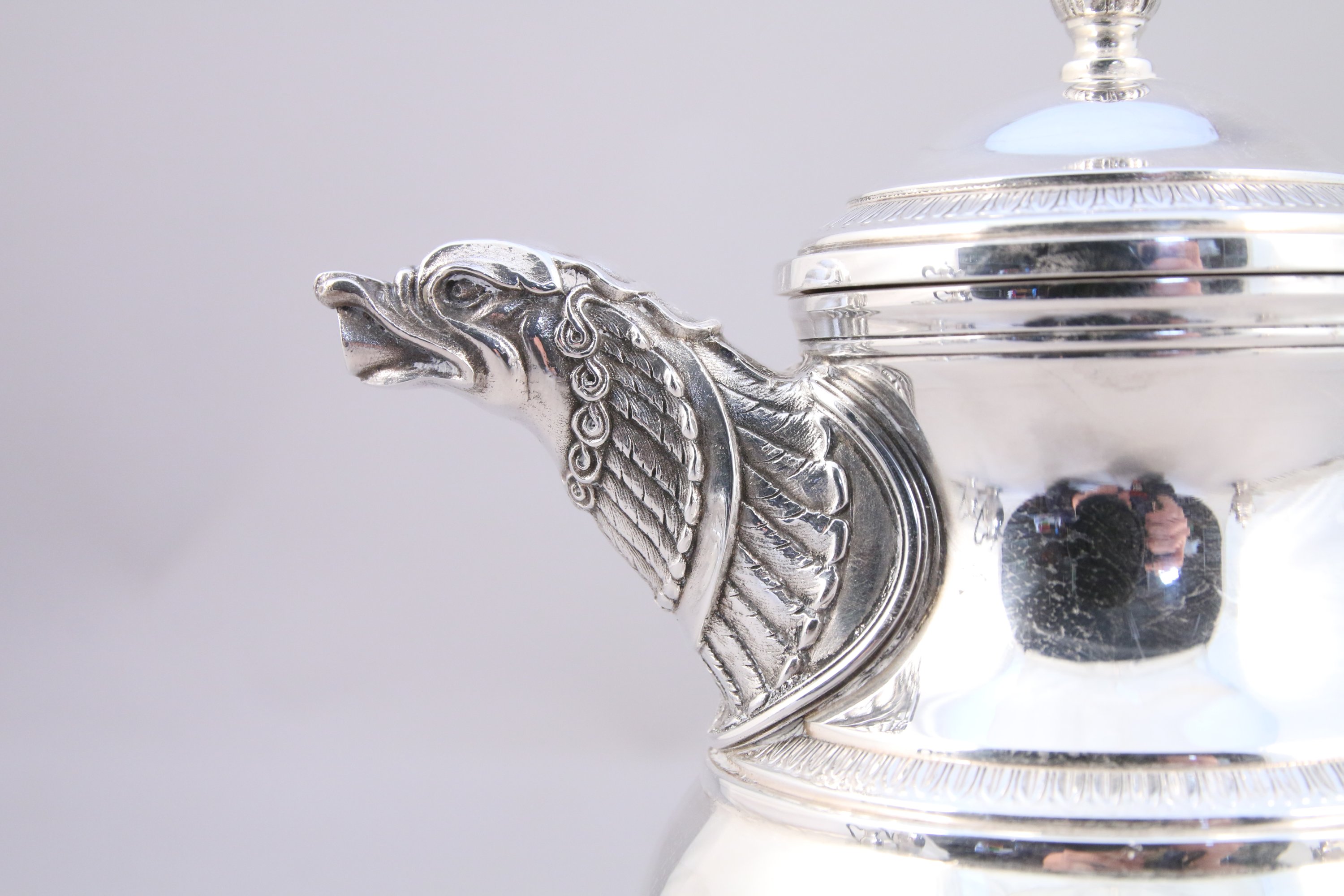 - d'une CAFETIÈRE et d'une THÉIÈRE ovoïdes sur piédouches. Elles sont ornées de frises de raies de coeur en rappel sur le bord du couvercle à charnière dont le fretel prend la forme d'une pomme de pin. Bec zoomorphe. Anses en bois noirci.