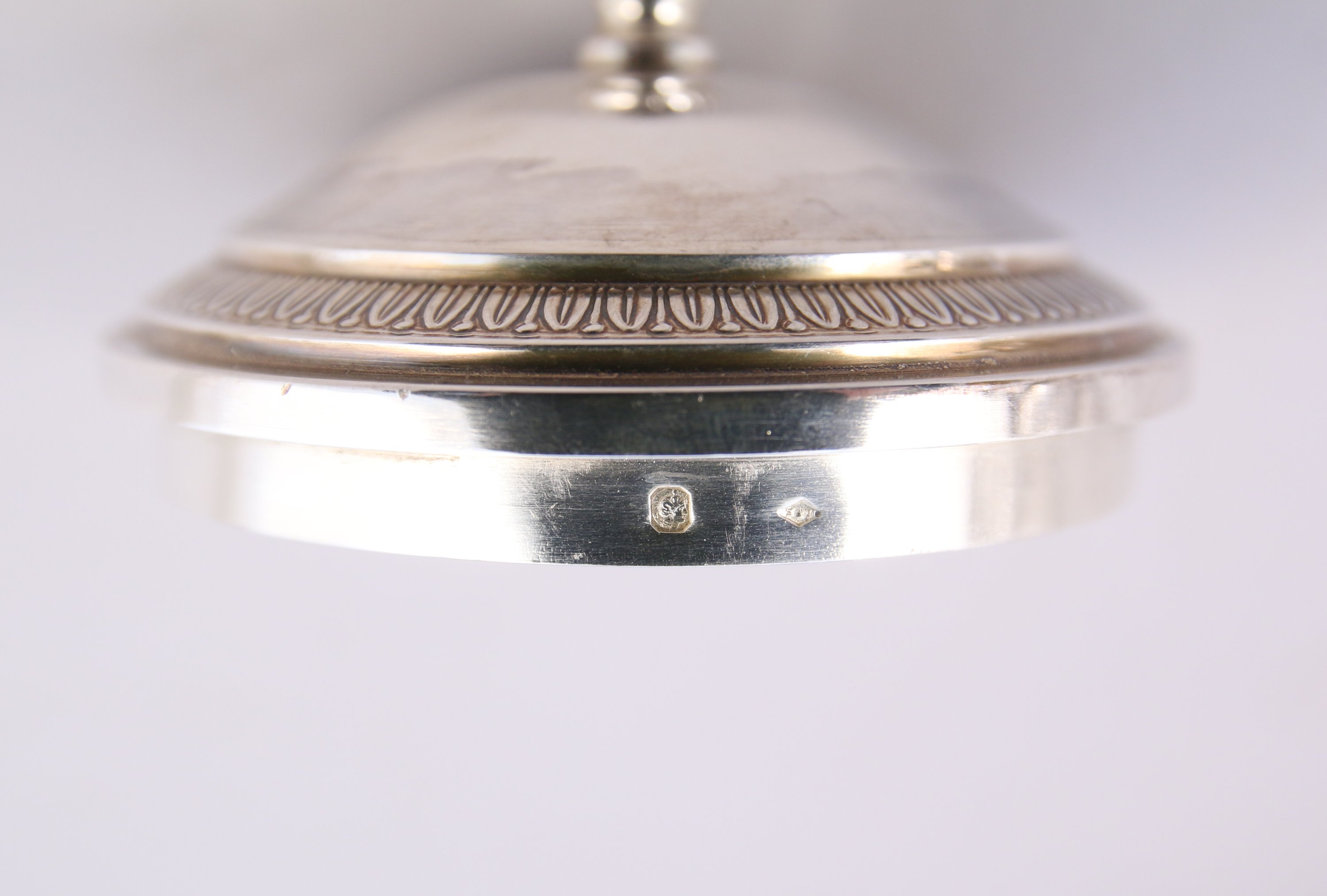 - d'un SUCRIER ovoïde sur piédouche. Frises de raies de coeur en rappel sur le bord du couvercle. Fretel en pomme de pin. Anses à attaches feuillagées.
