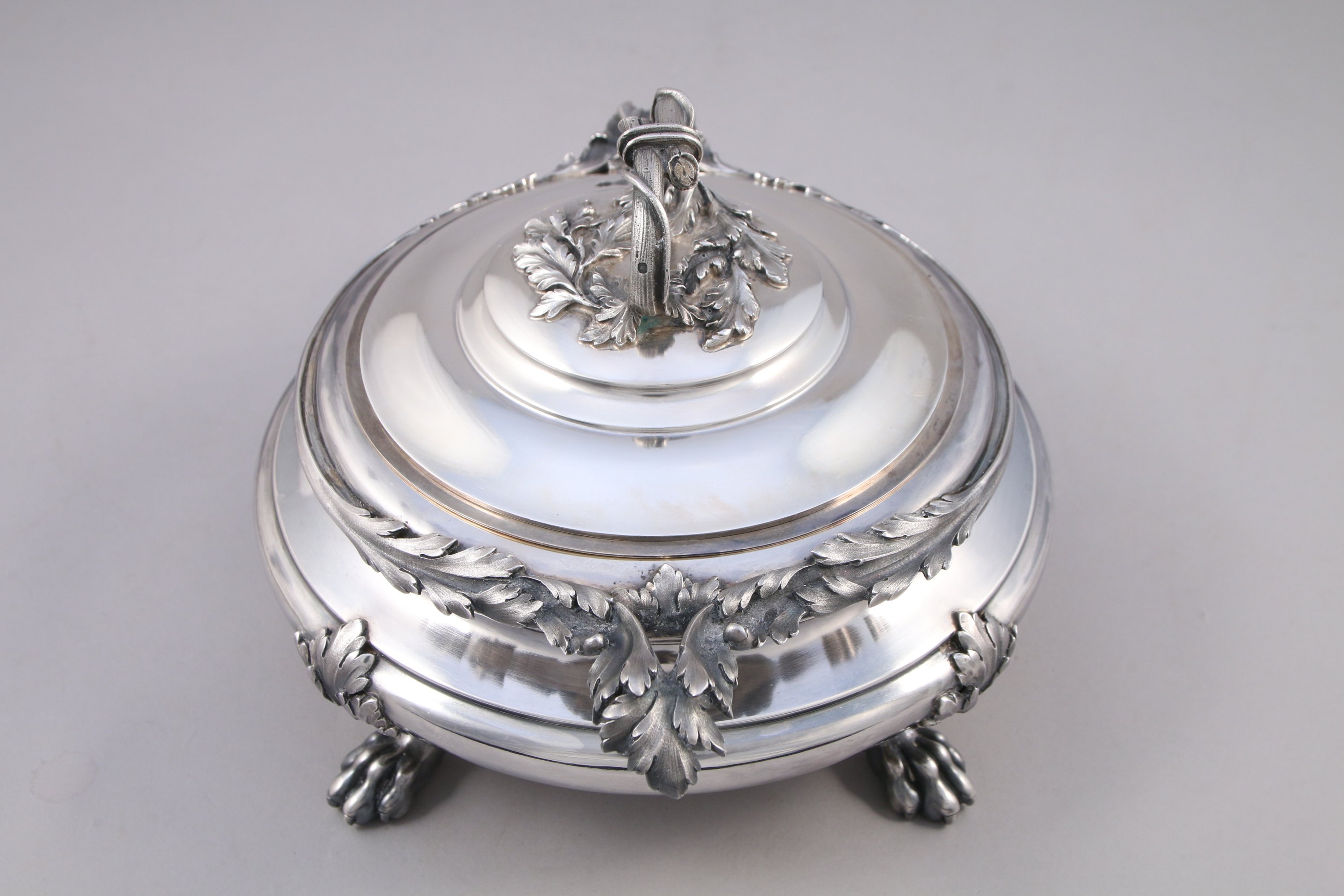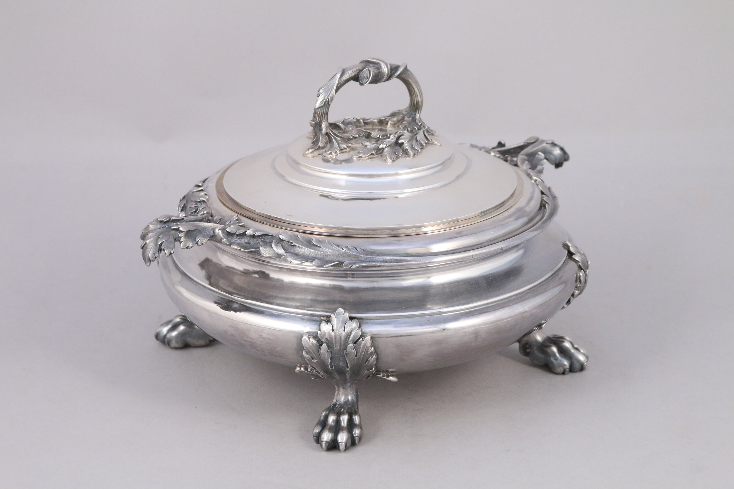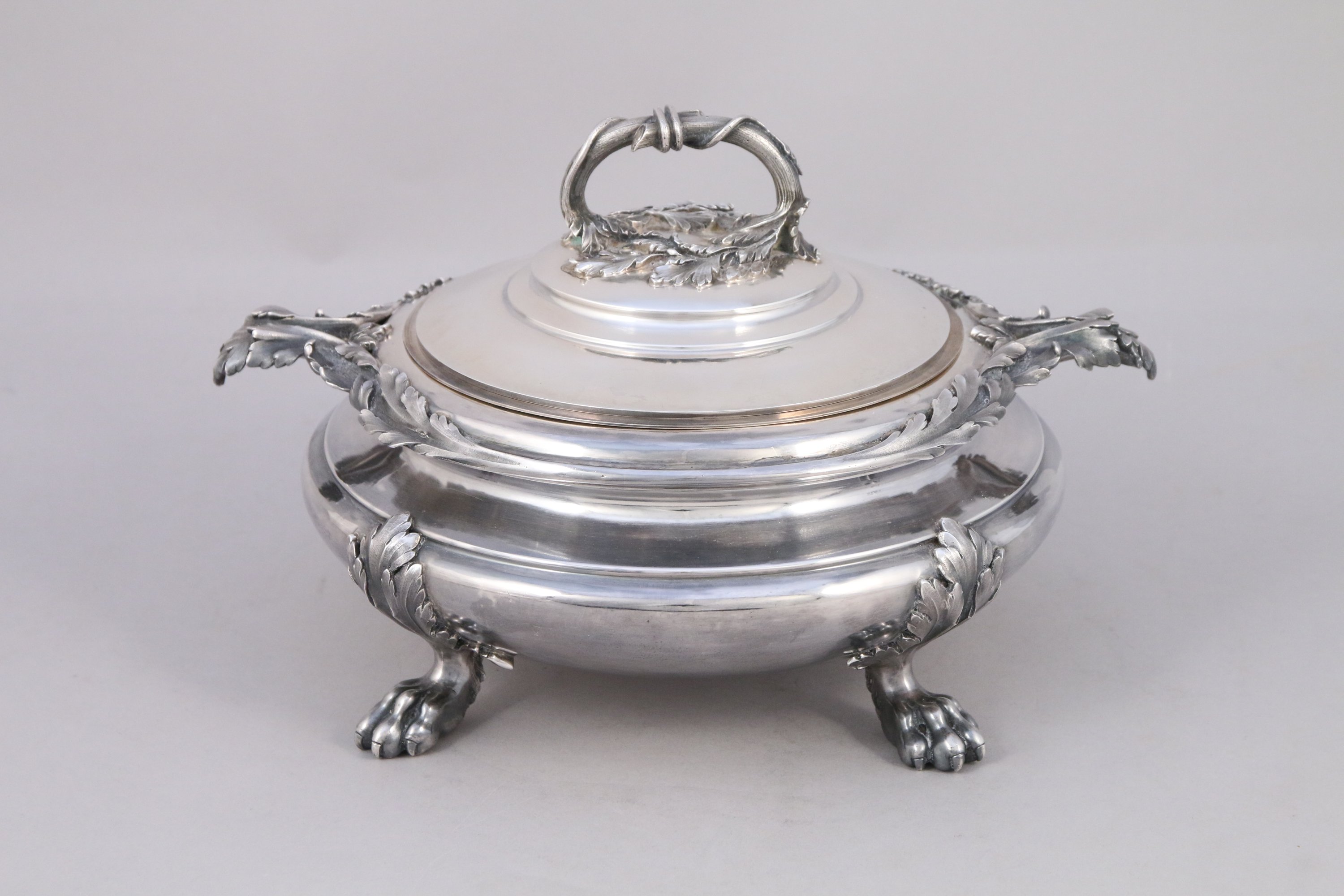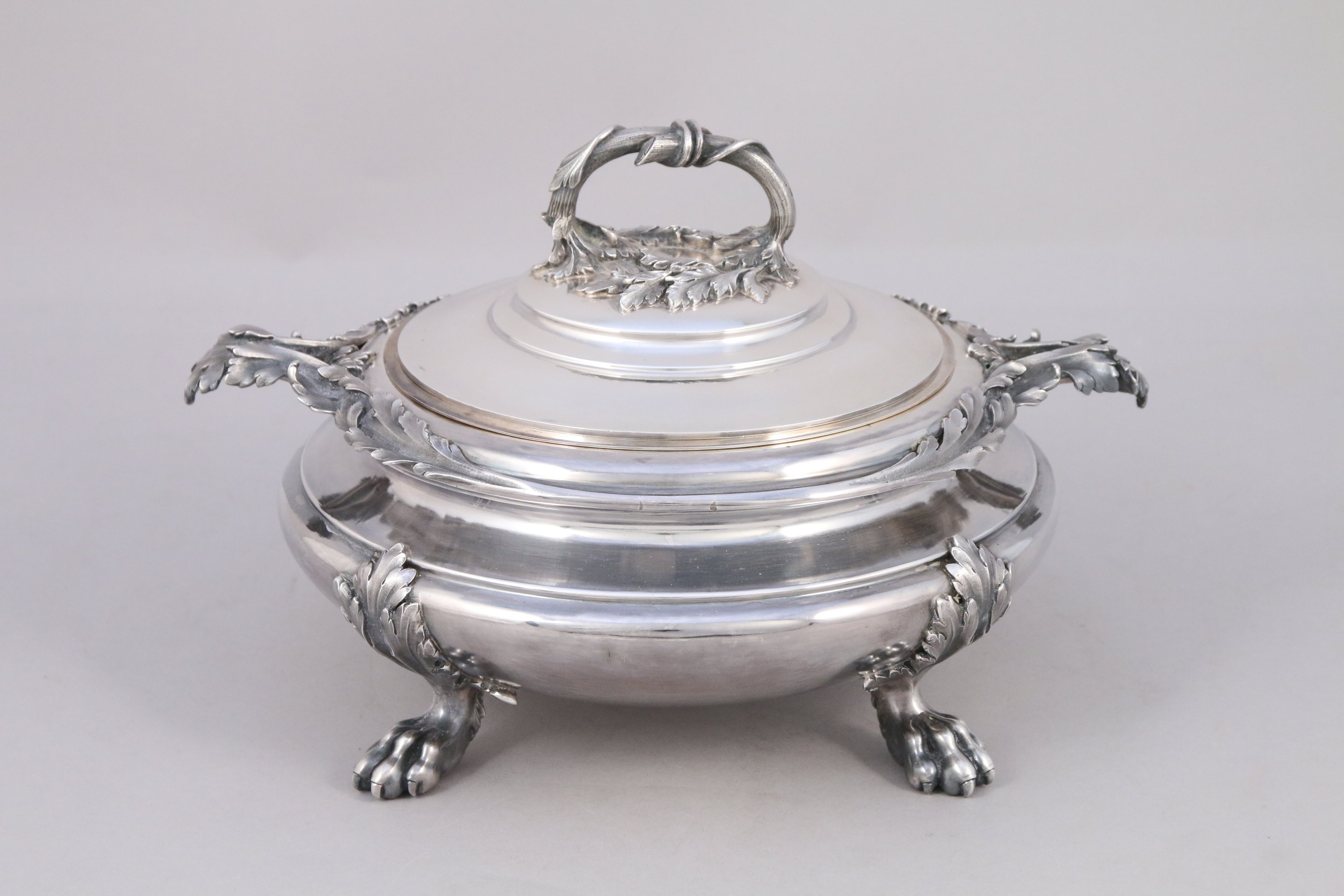 SOUPIÈRE en argent, la prise en forme de branche d'acanthe, les anses stylisées en feuille d'acanthe. Repose sur quatre pieds griffes.