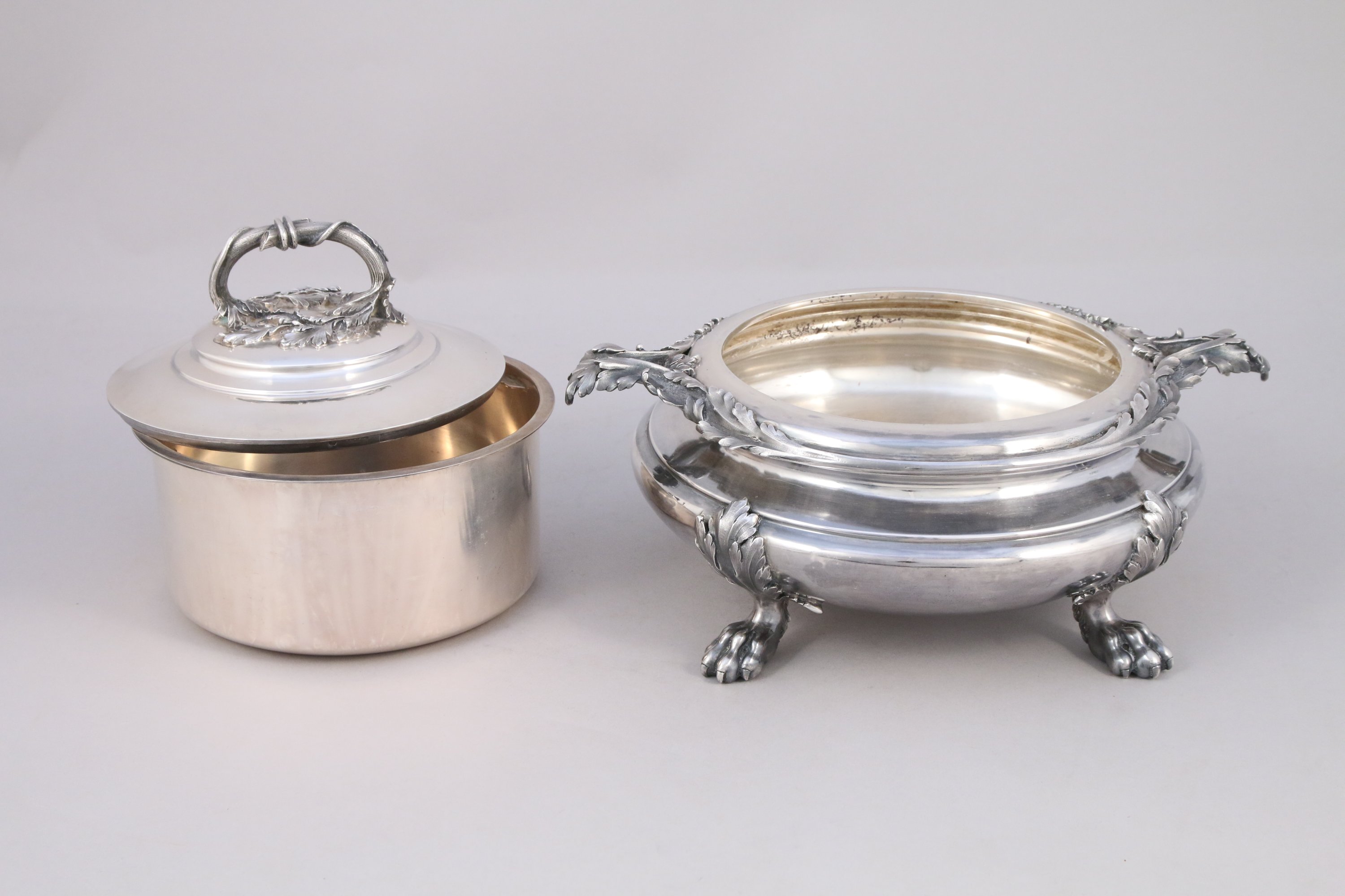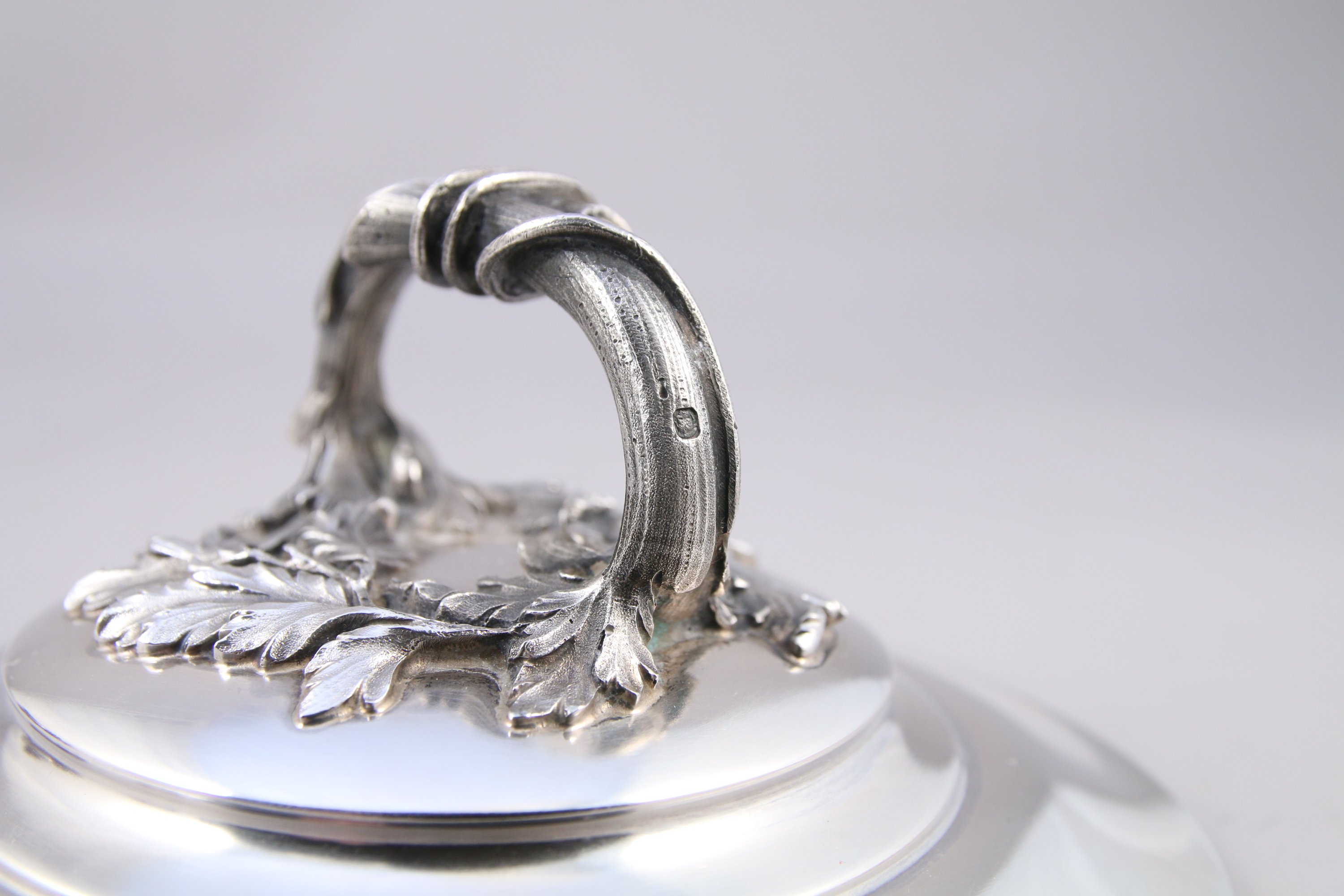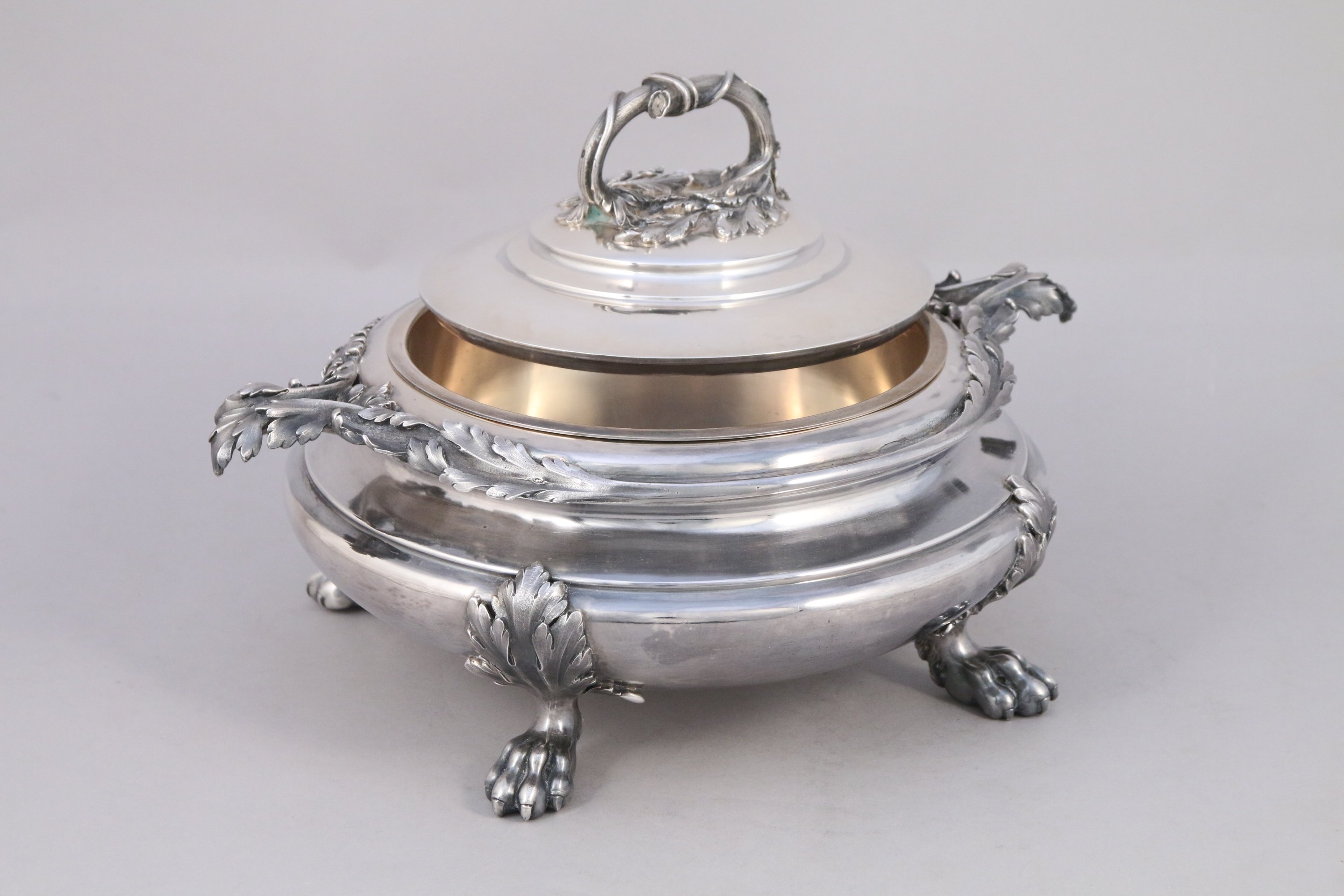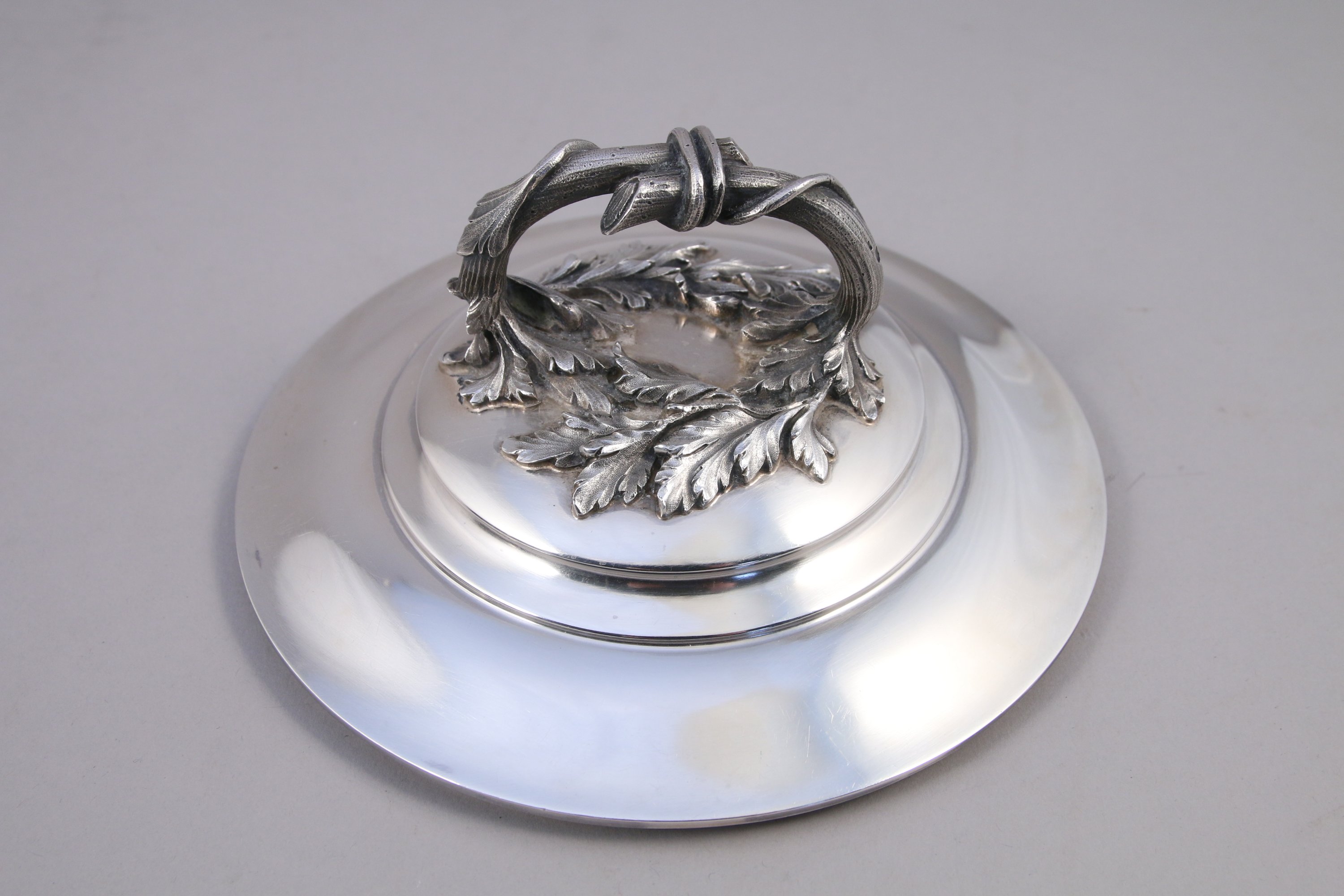 SOUPIÈRE en argent, la prise en forme de branche d'acanthe, les anses stylisées en feuille d'acanthe. Repose sur quatre pieds griffes.
