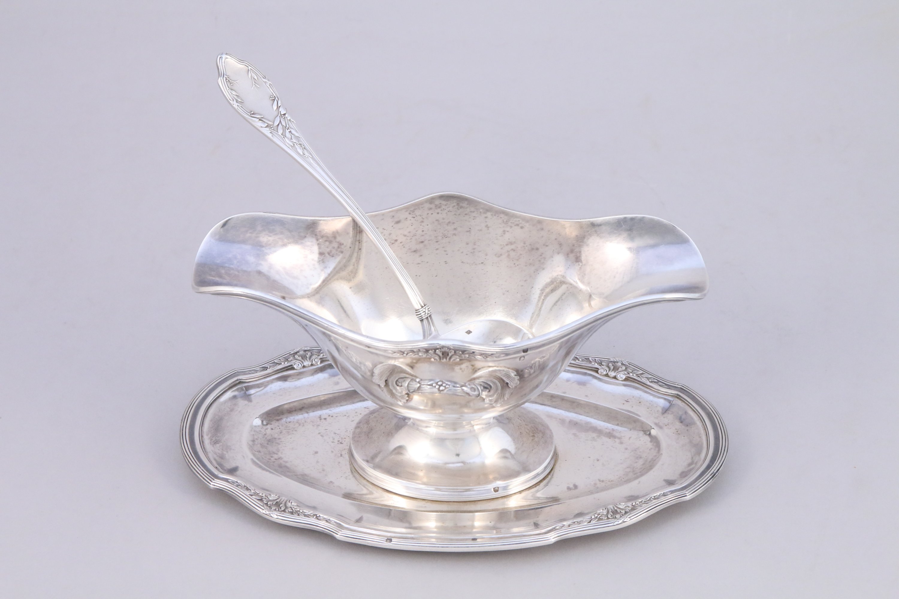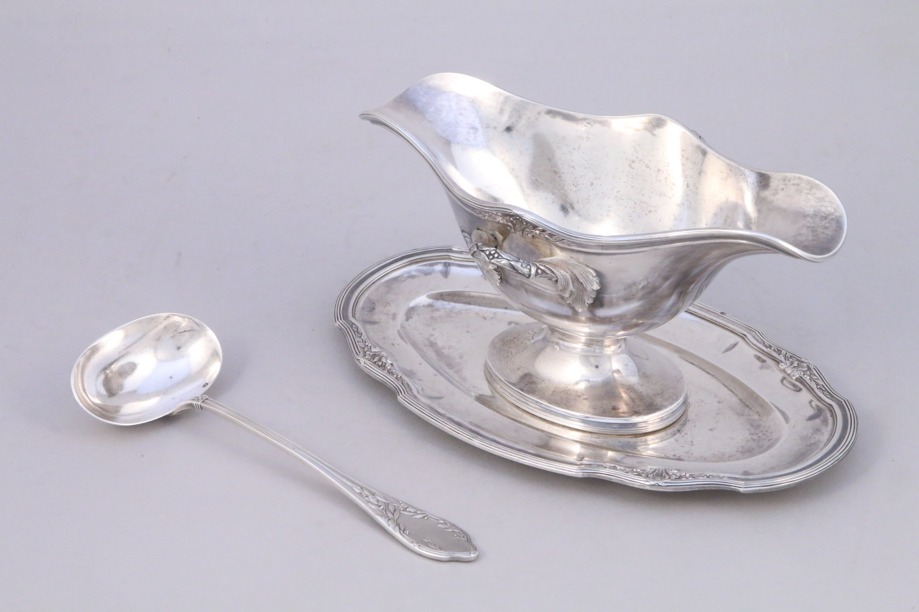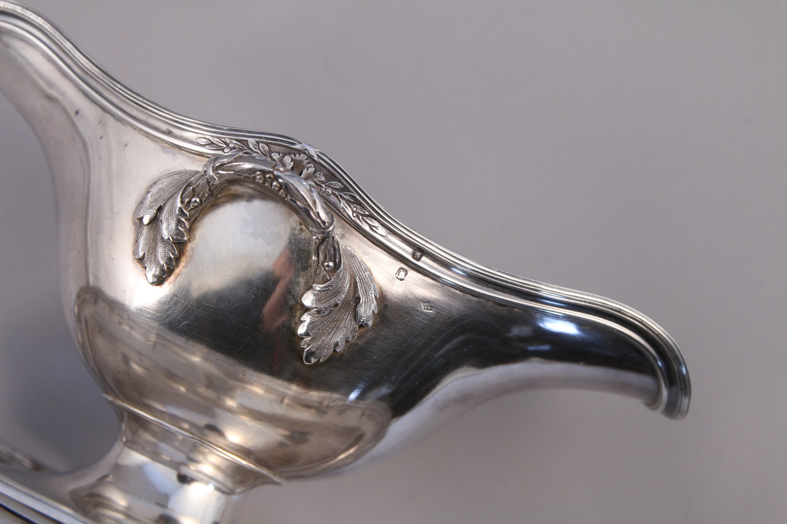 SAUCIÈRE en argent, le col orné en son centre d'une feuille d'acanthe entourée de deux branches de lauriers, les anses stylisées se terminant sur la panse par des feuilles d'acanthe.
