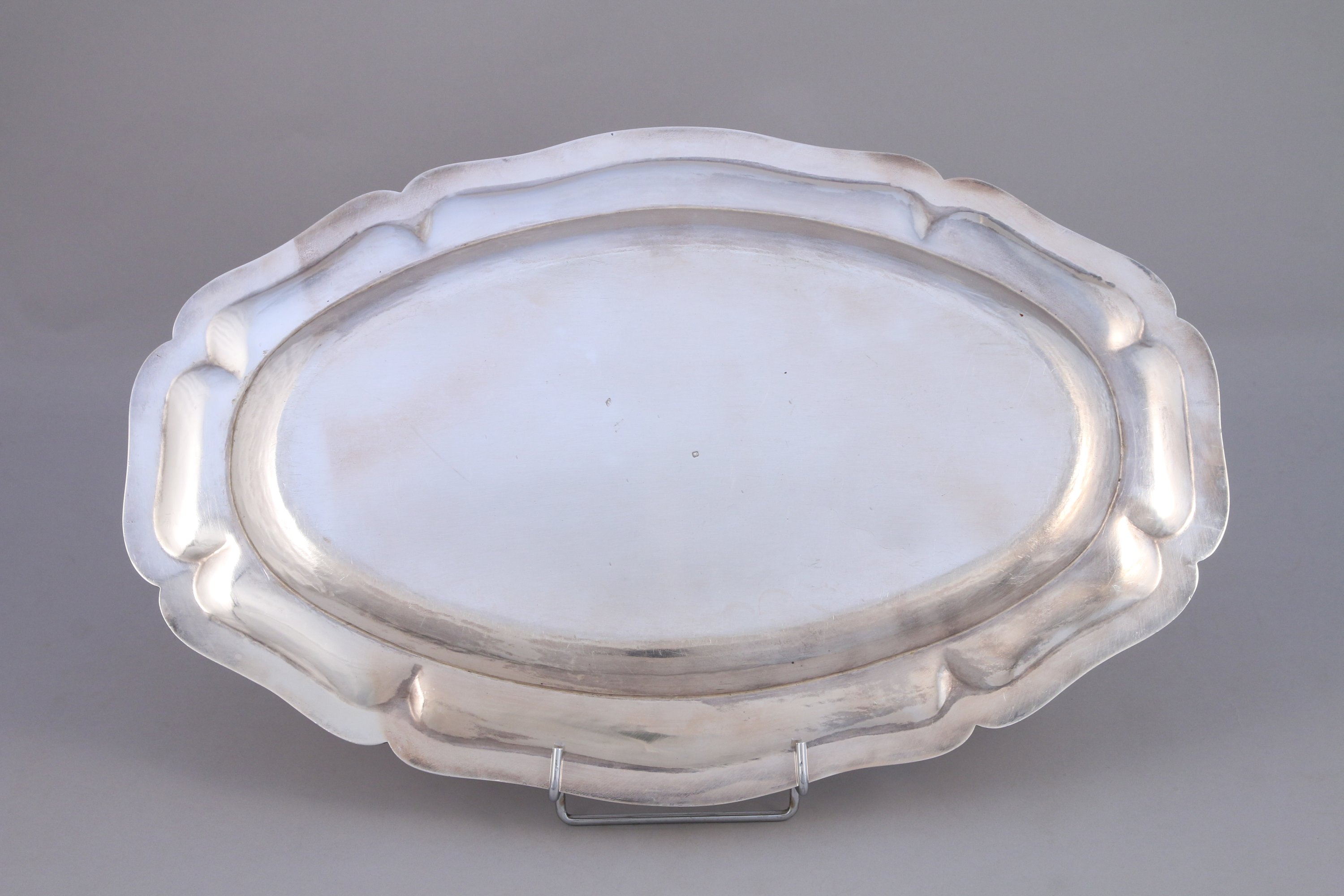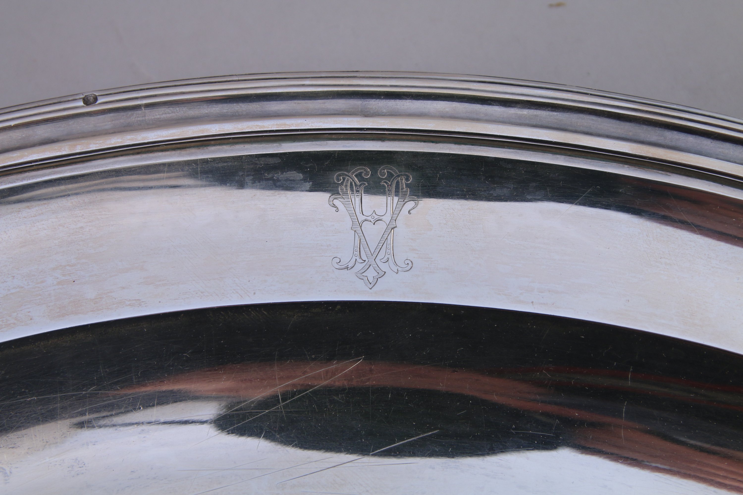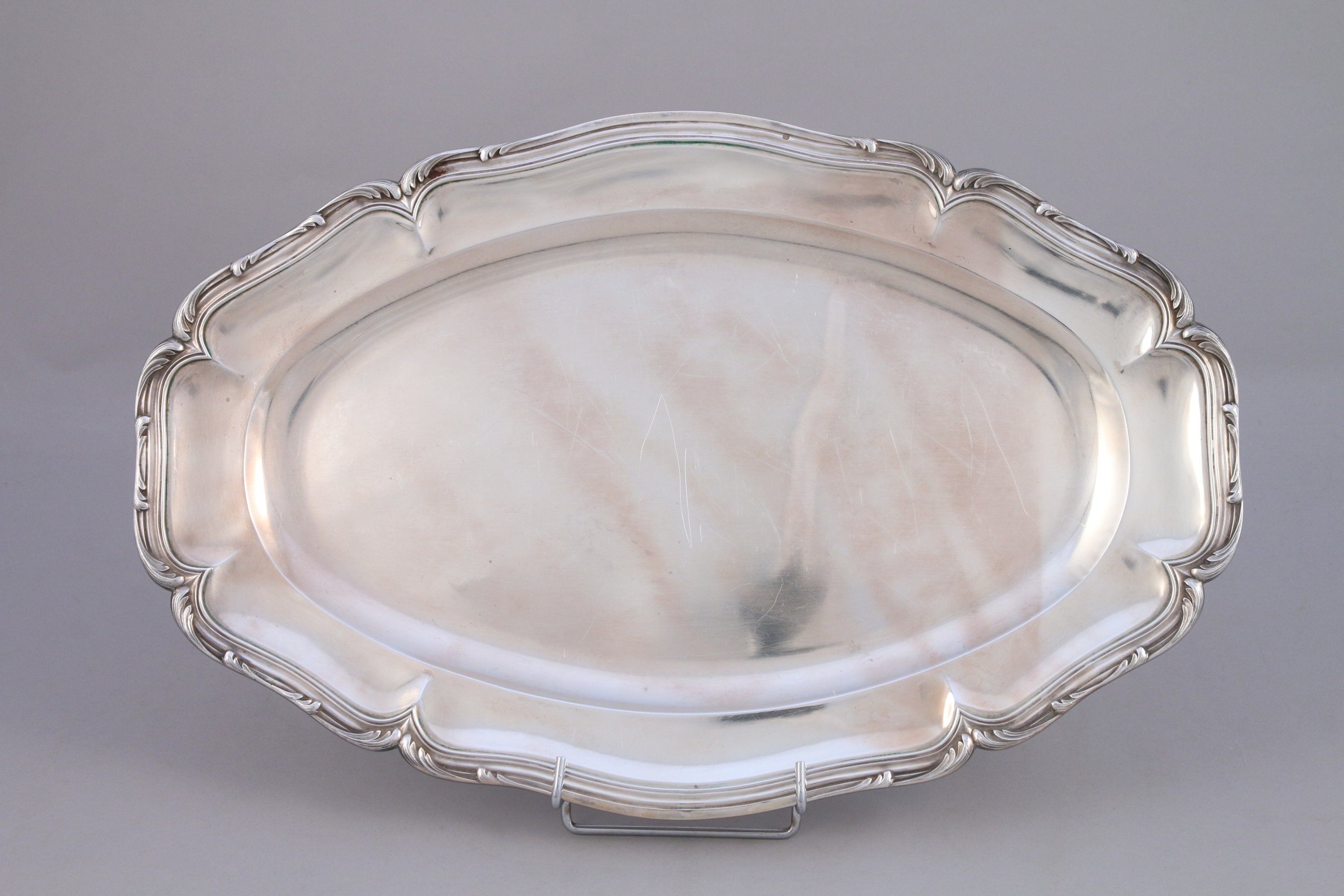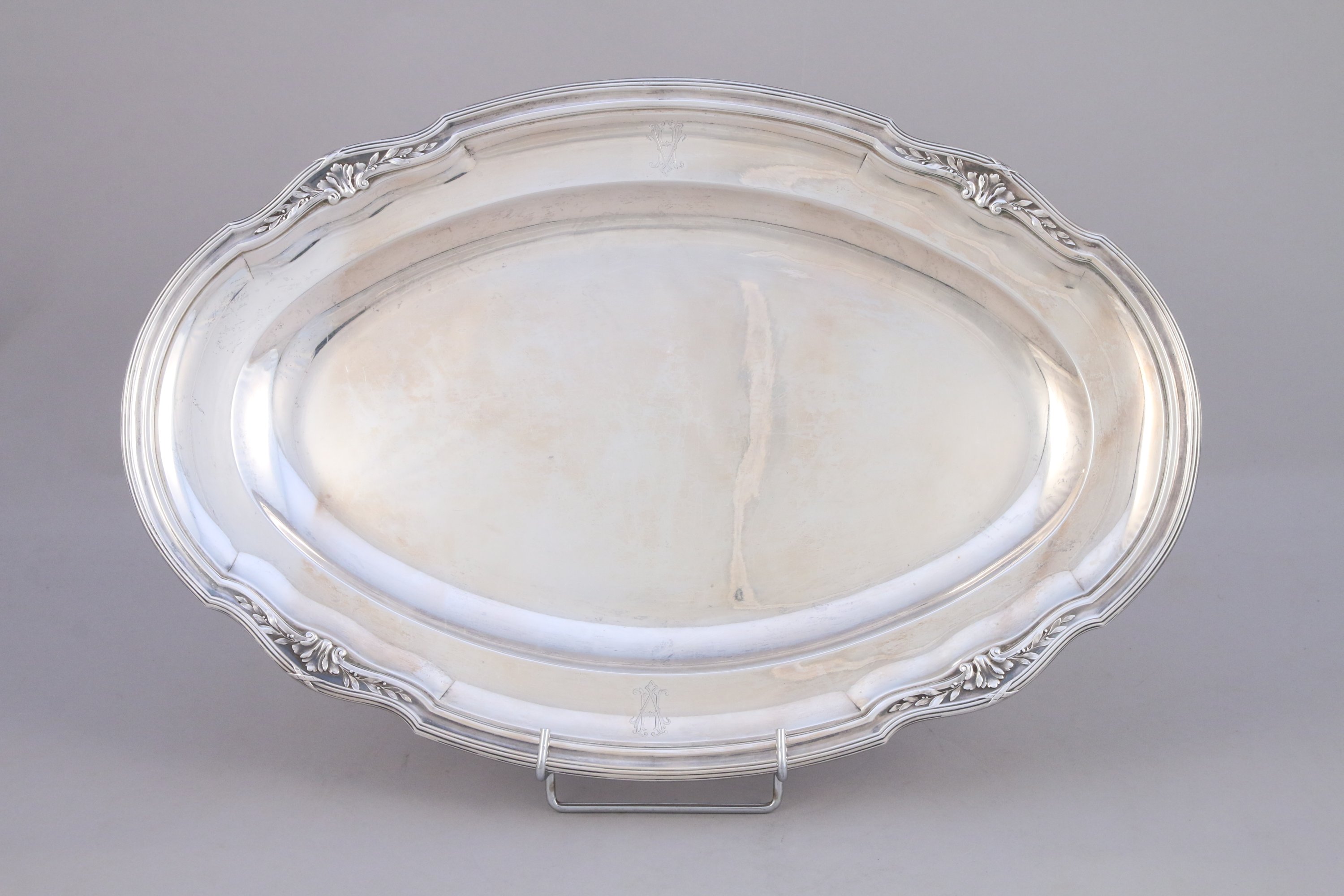 PLAT de SERVICE en argent de forme ovale, à bord chantourné, orné à quatre coins de motifs de feuilles de laurier entourant des feuilles d'acanthe. Porte les initiales "HV" entrelacées.