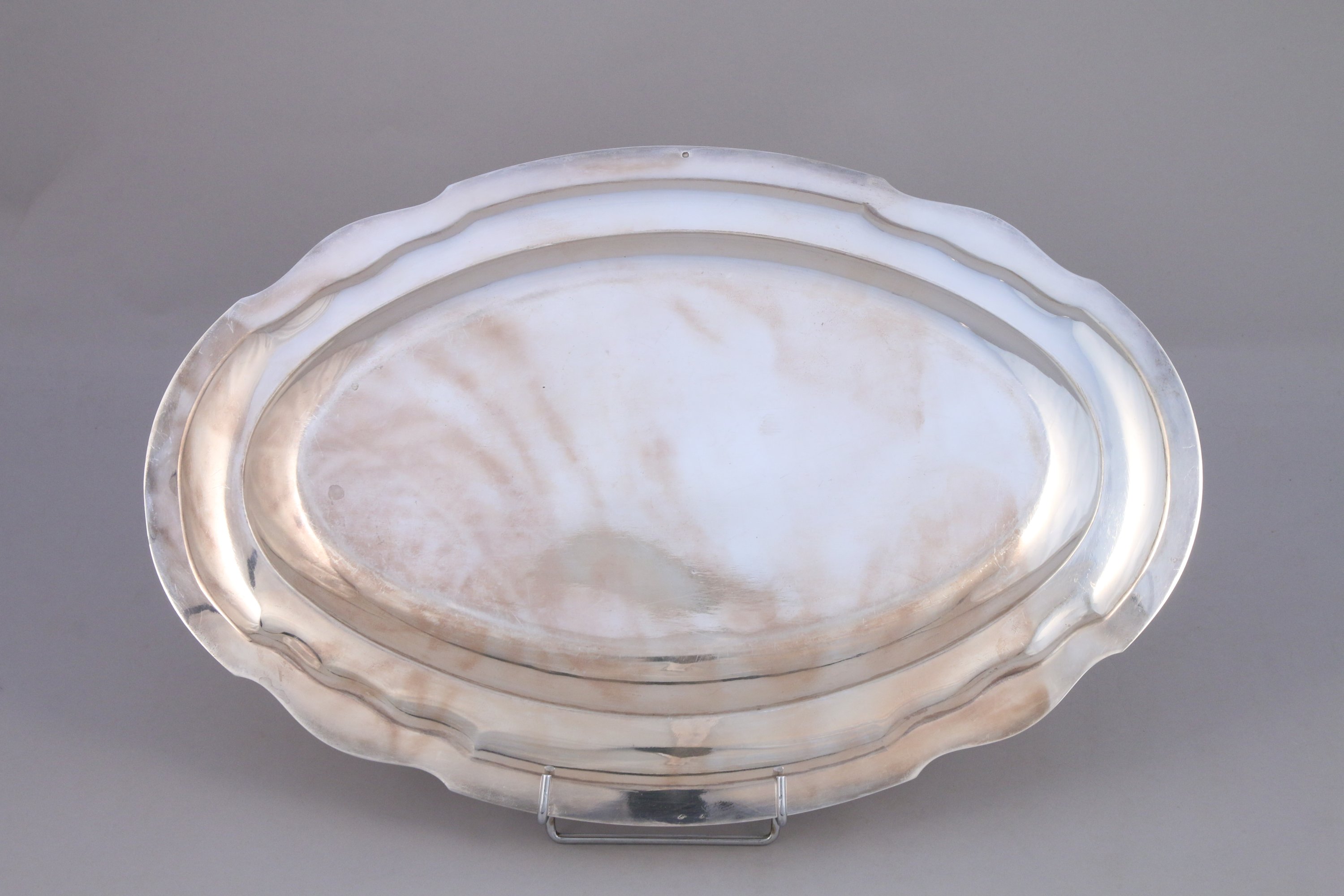 JOINT: PLAT en argent au décor rocaille. Poinçon Minerve. Orfèvre Debain-Flamant. Long. 42 cm. Poids 1040 g.