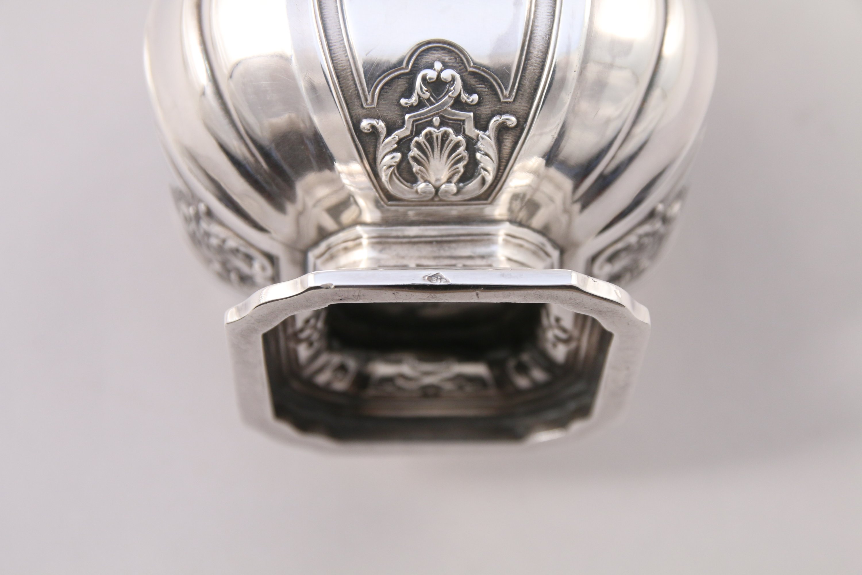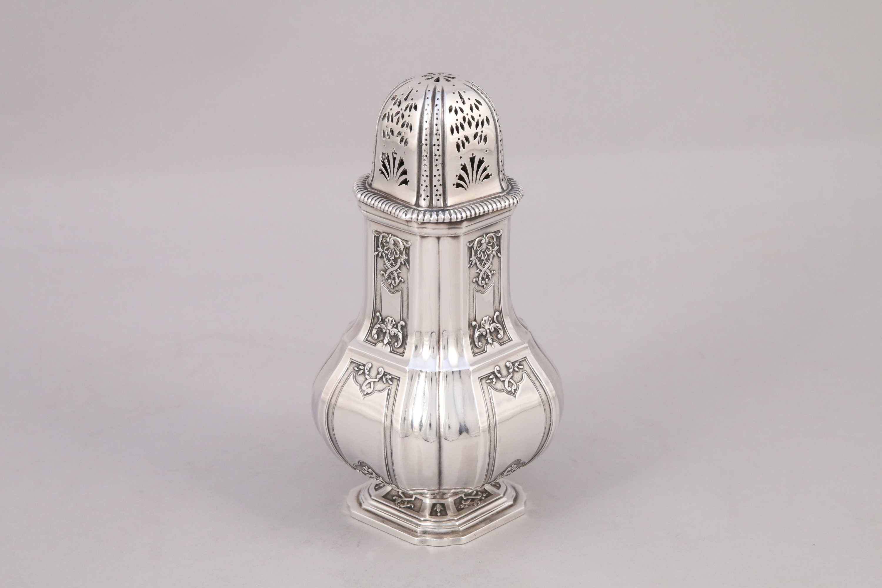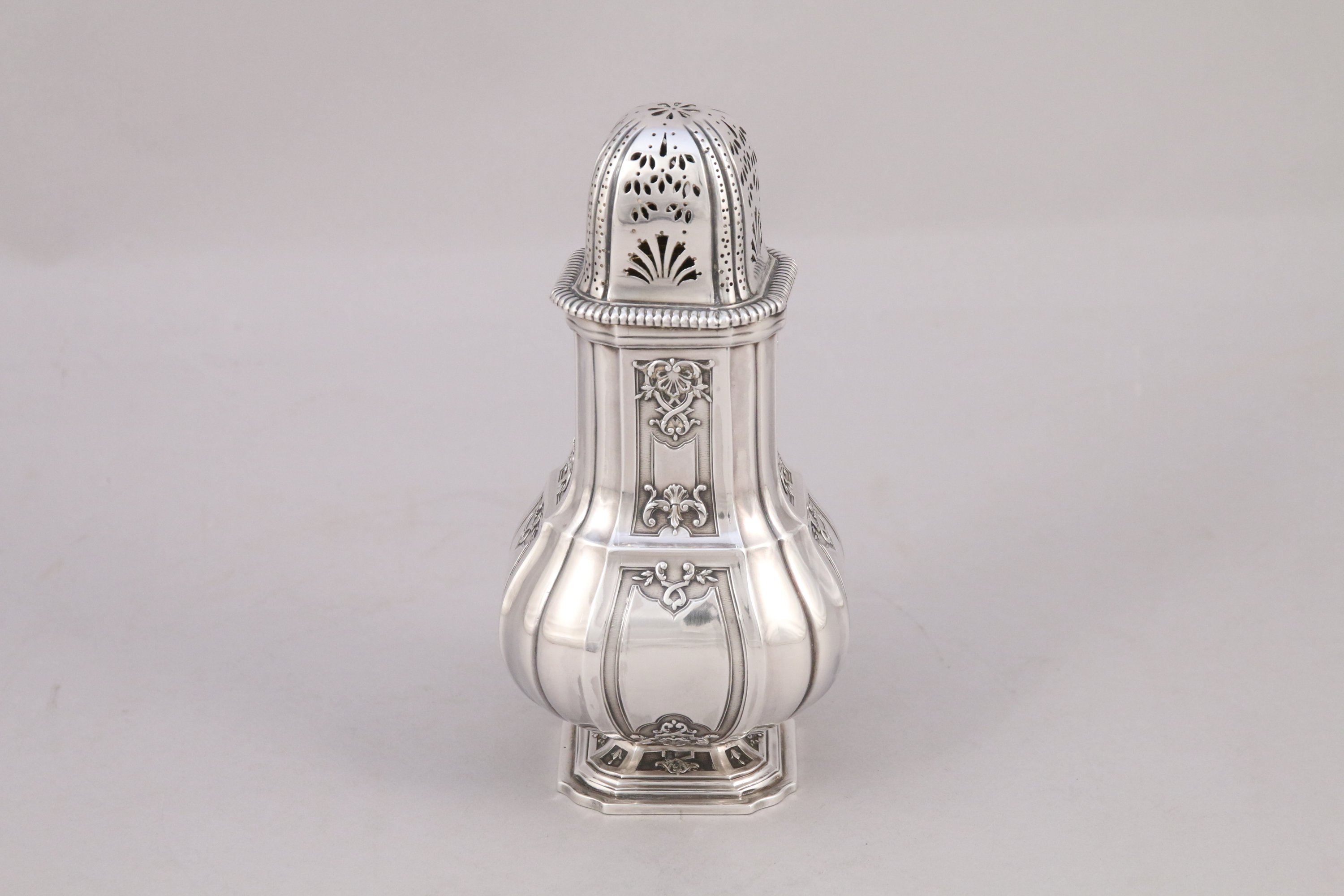 PUIFORCAT. SAUPOUDREUSE en argent, de forme balustre à pans coupés. Ornée de motifs de coquilles et d'entrelacs.