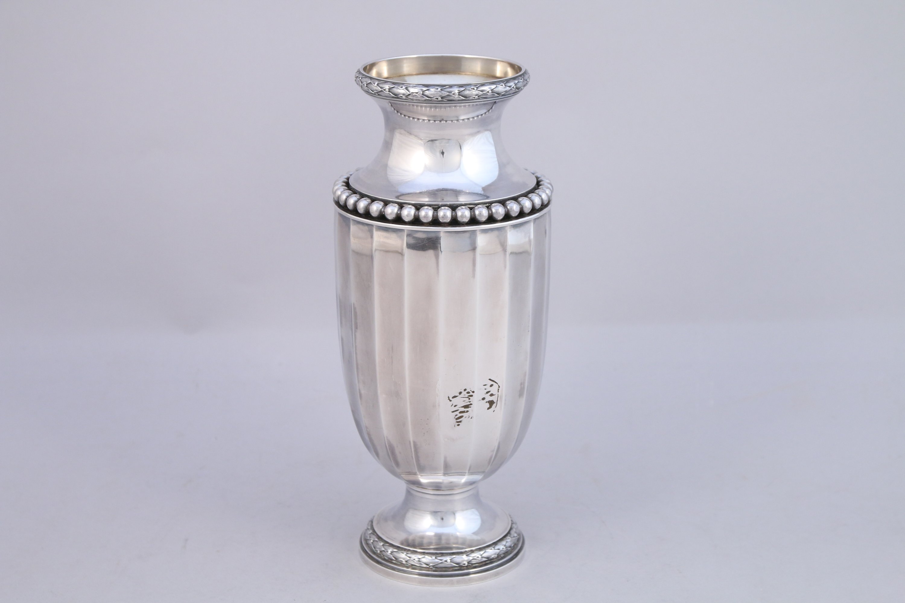 VASE BALUSTRE en argent à pans coupés, le col orné de feuilles de laurier, le col d'un important rang de perles.