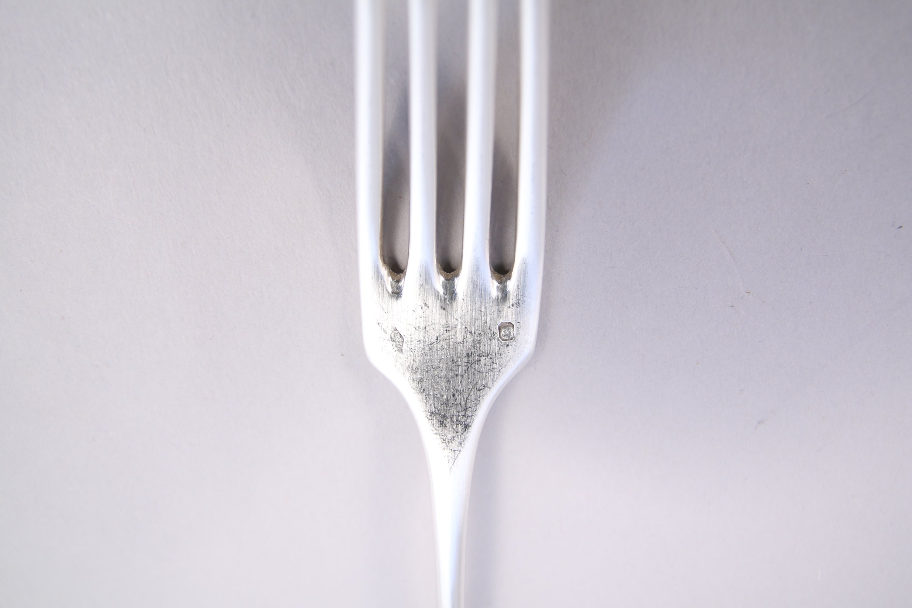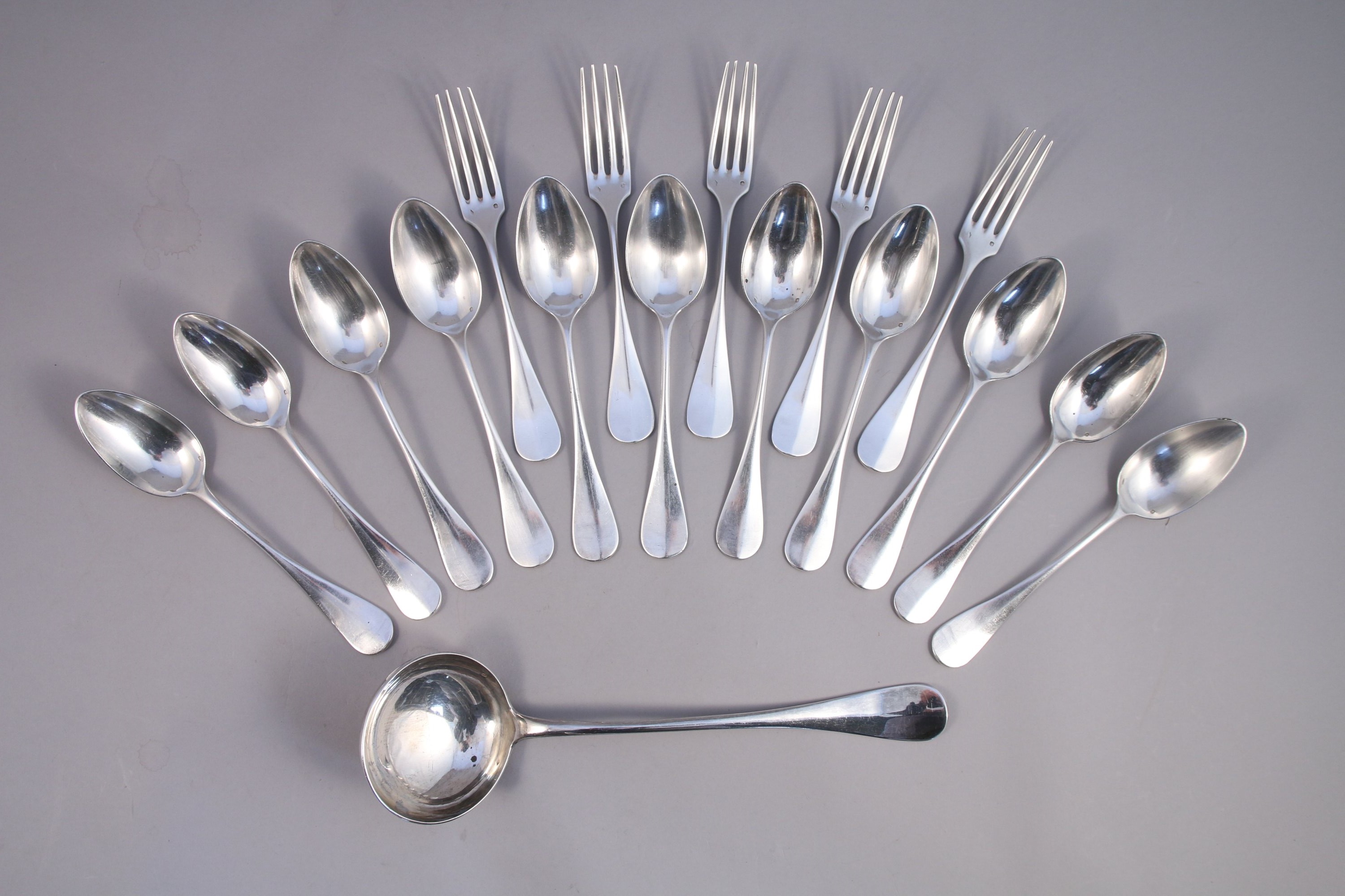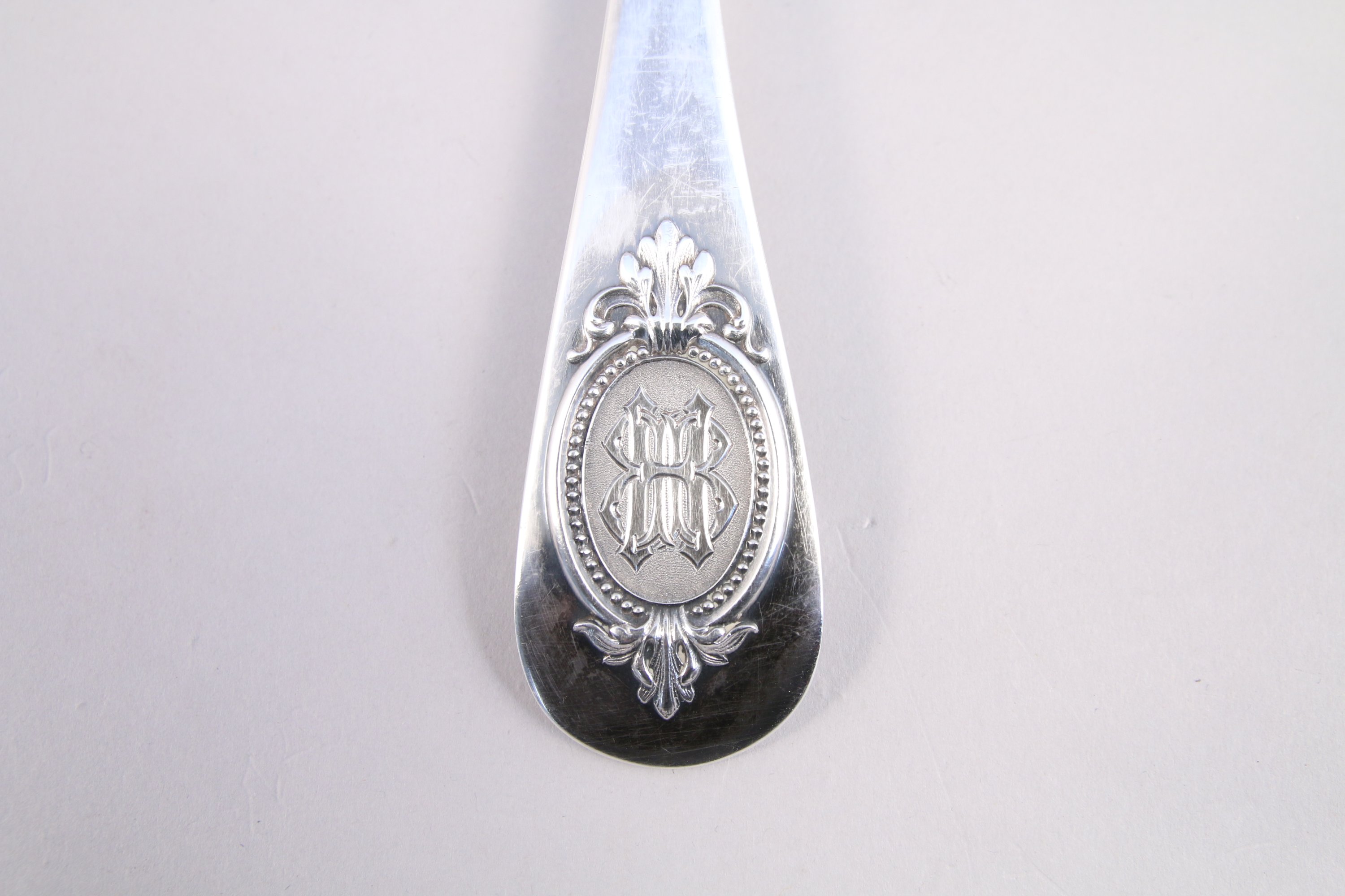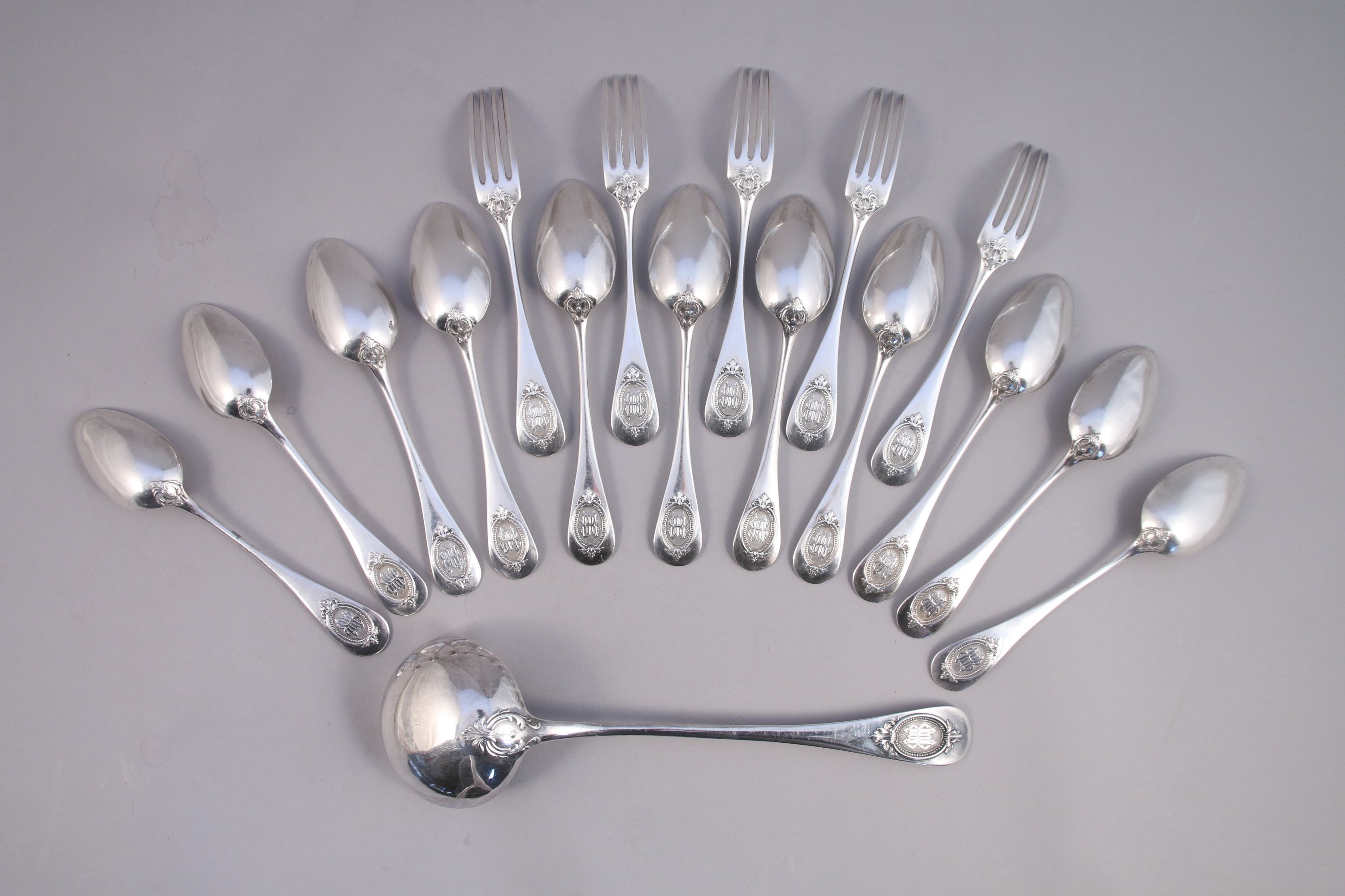PARTIE de COUVERTS en argent, modèle uniplat, composée de onze CUILLÈRES, cinq FOURCHETTES et une LOUCHE modèle uniplat. Monogrammées HB dans un cartouche à décor de feuilles d'acanthe et rang de perle.