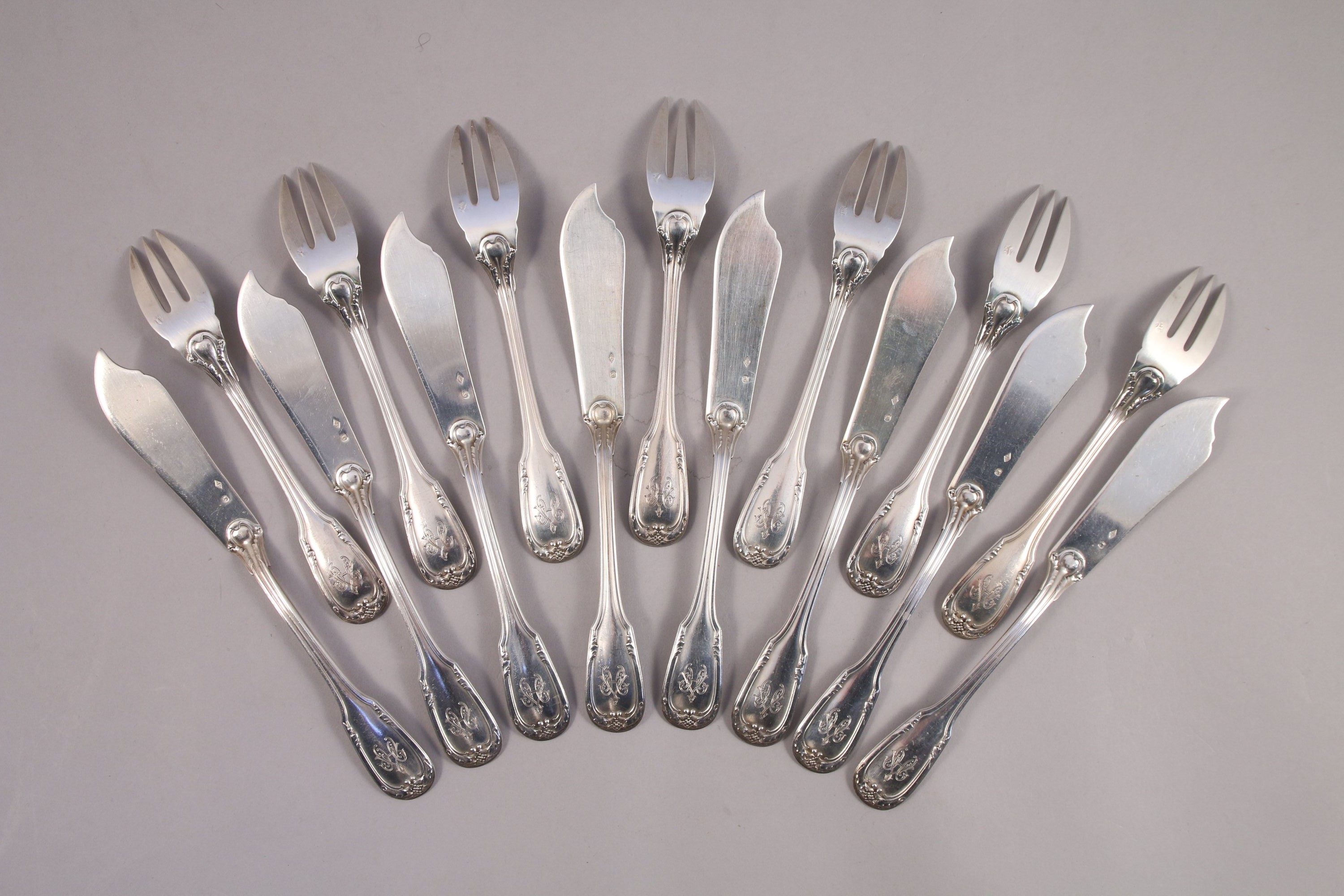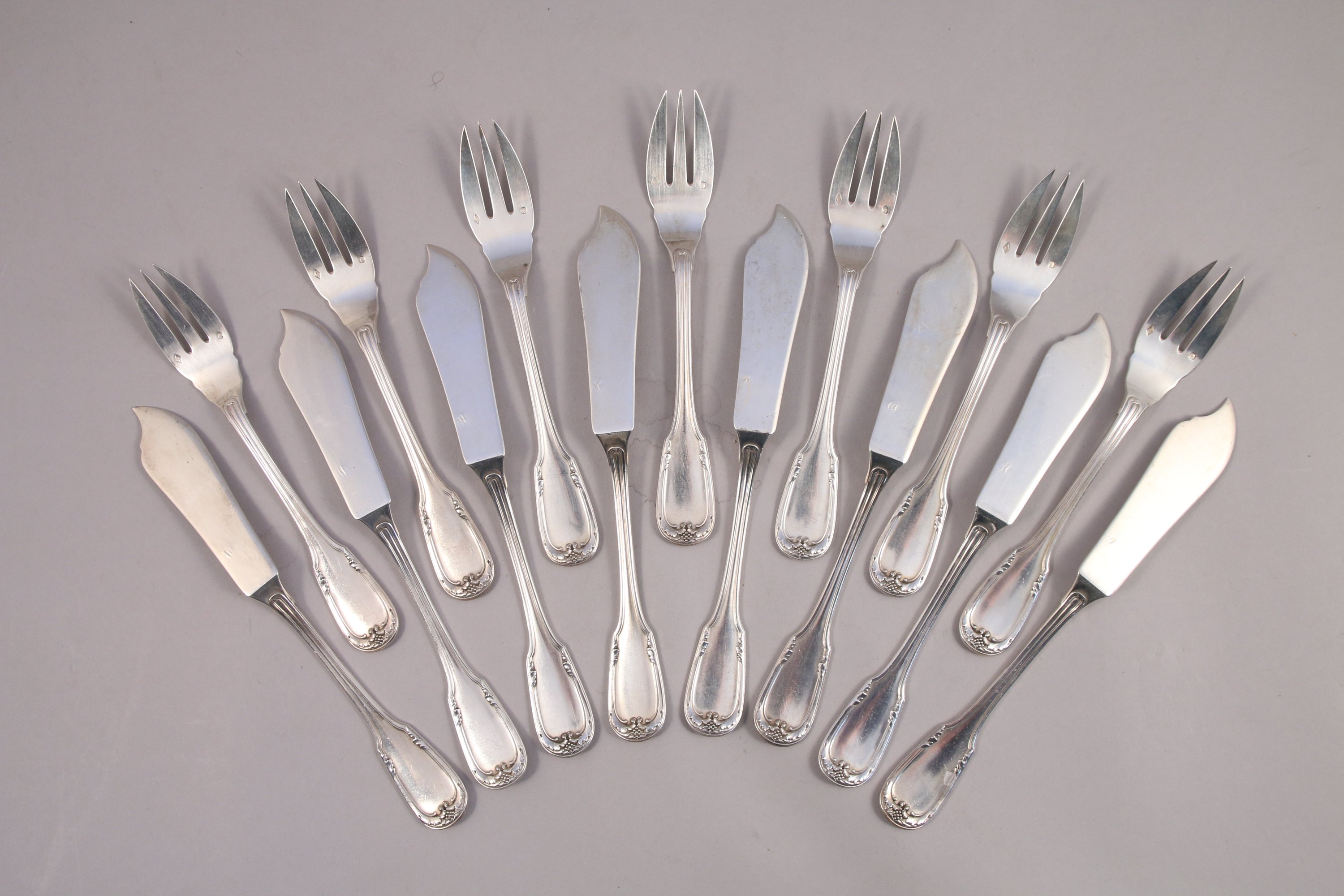 COUVERTS à POISSON en argent, la bordure à filet contours rythmée de feuilles d'acanthe. Monogrammés HV.
