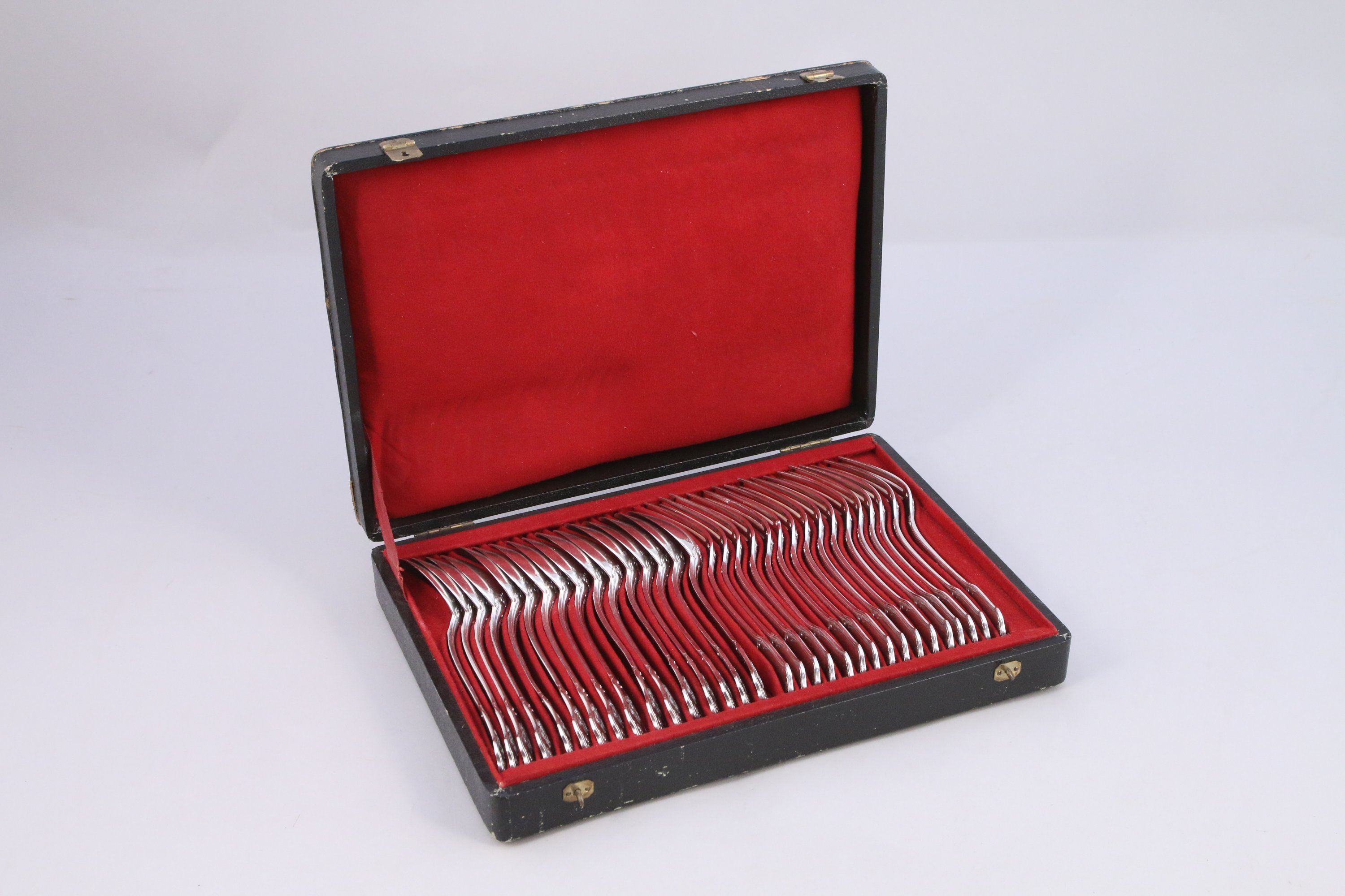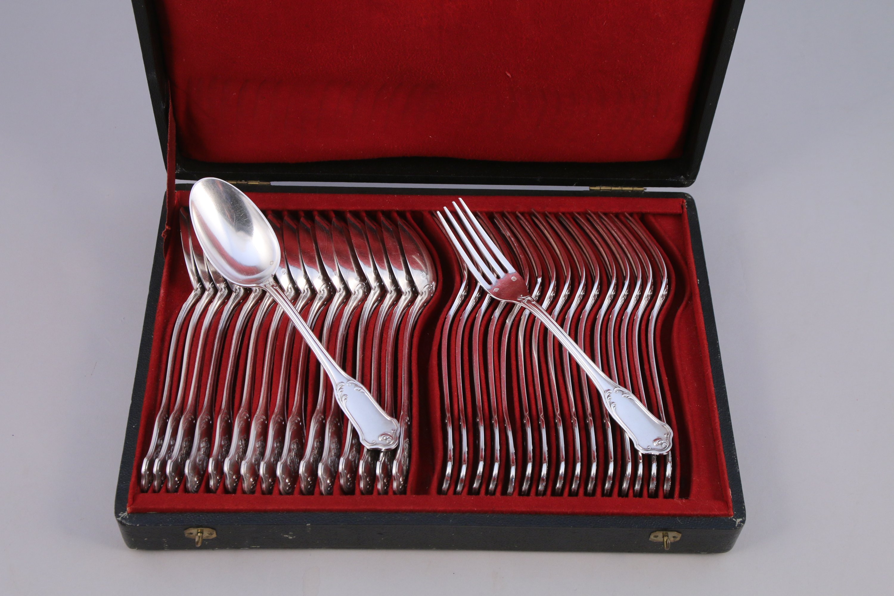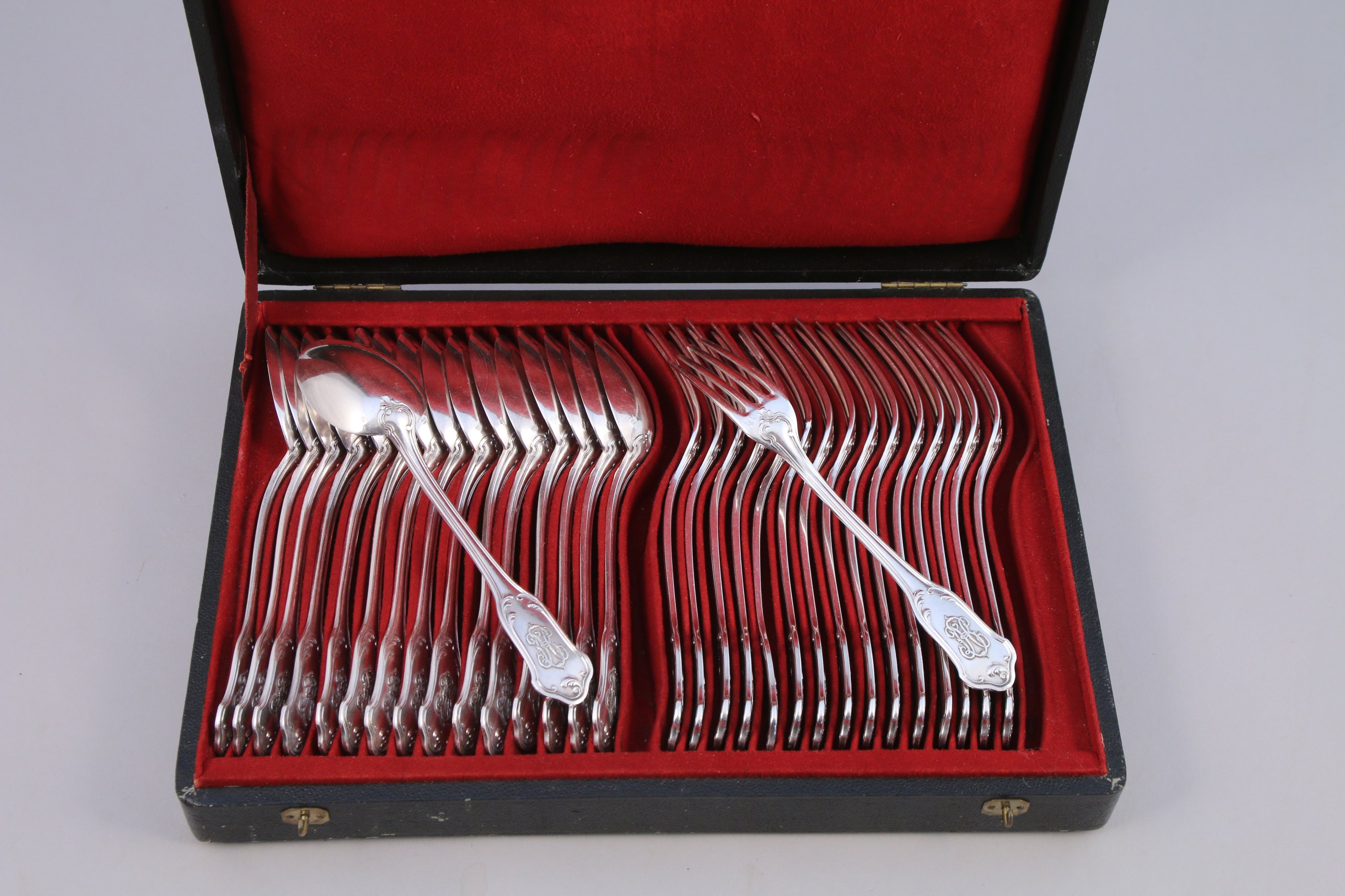 SEIZE COUVERTS à entremets en argent, modèle filets contours rythmé par des feuilles d'acanthe. Monogrammés BH?