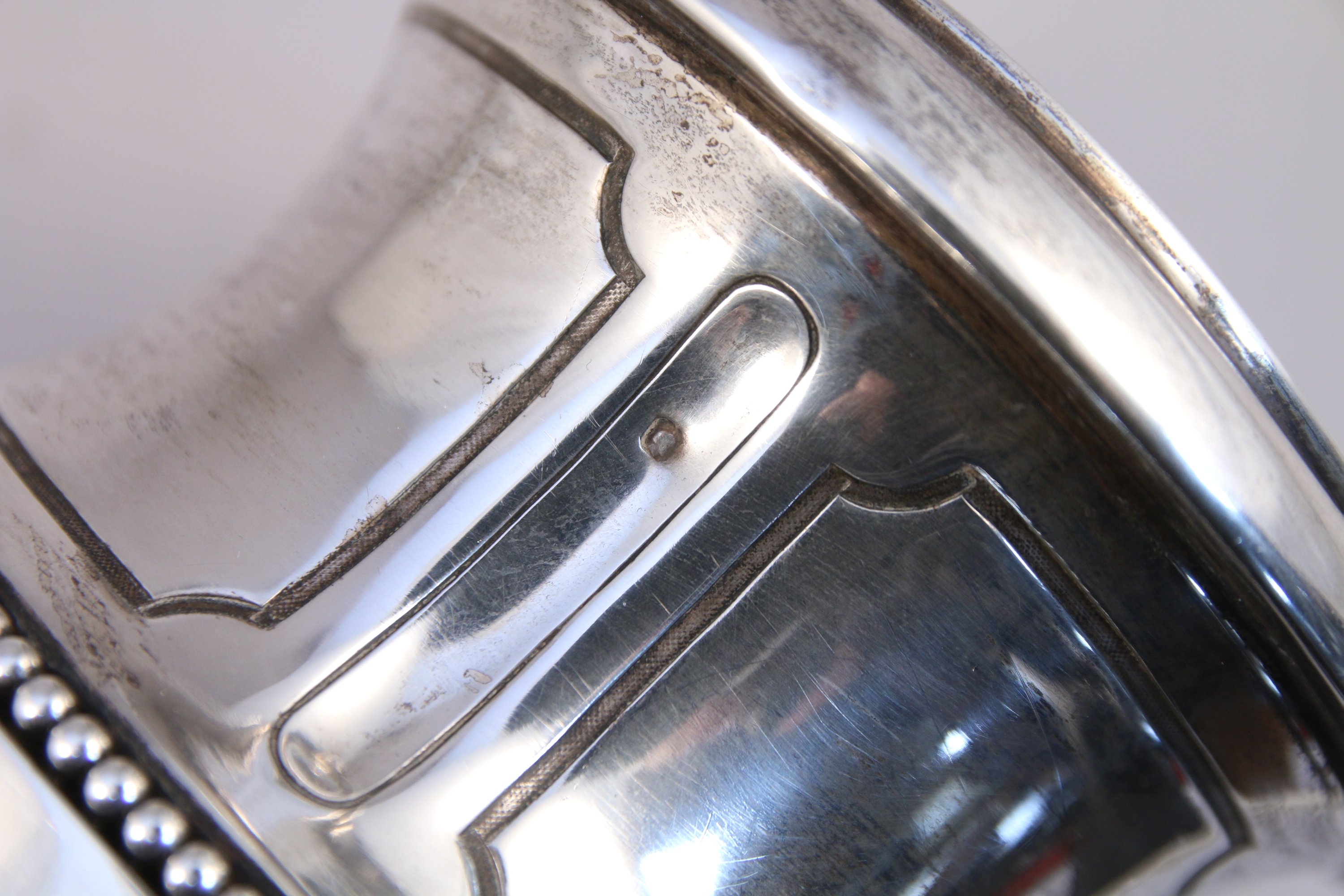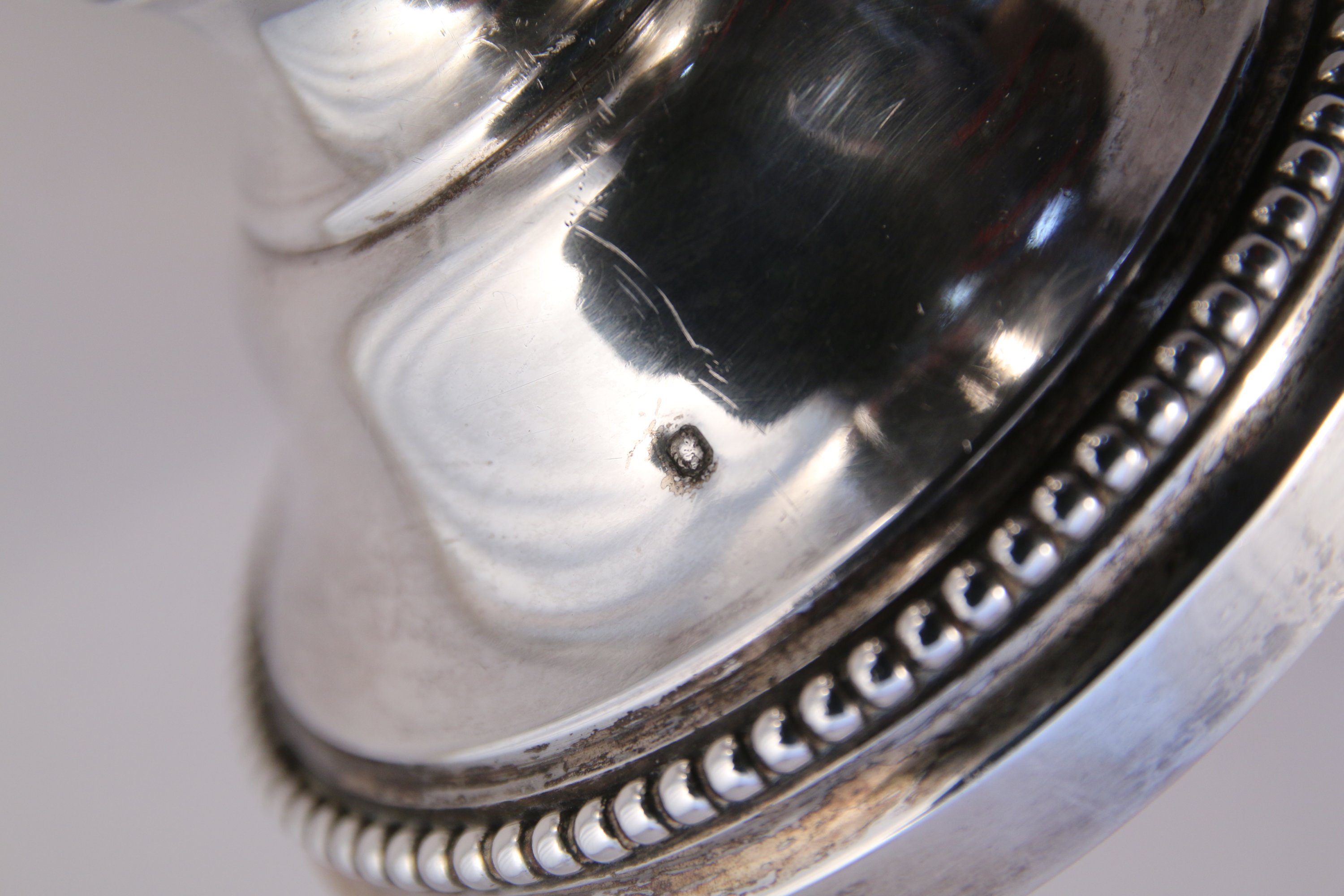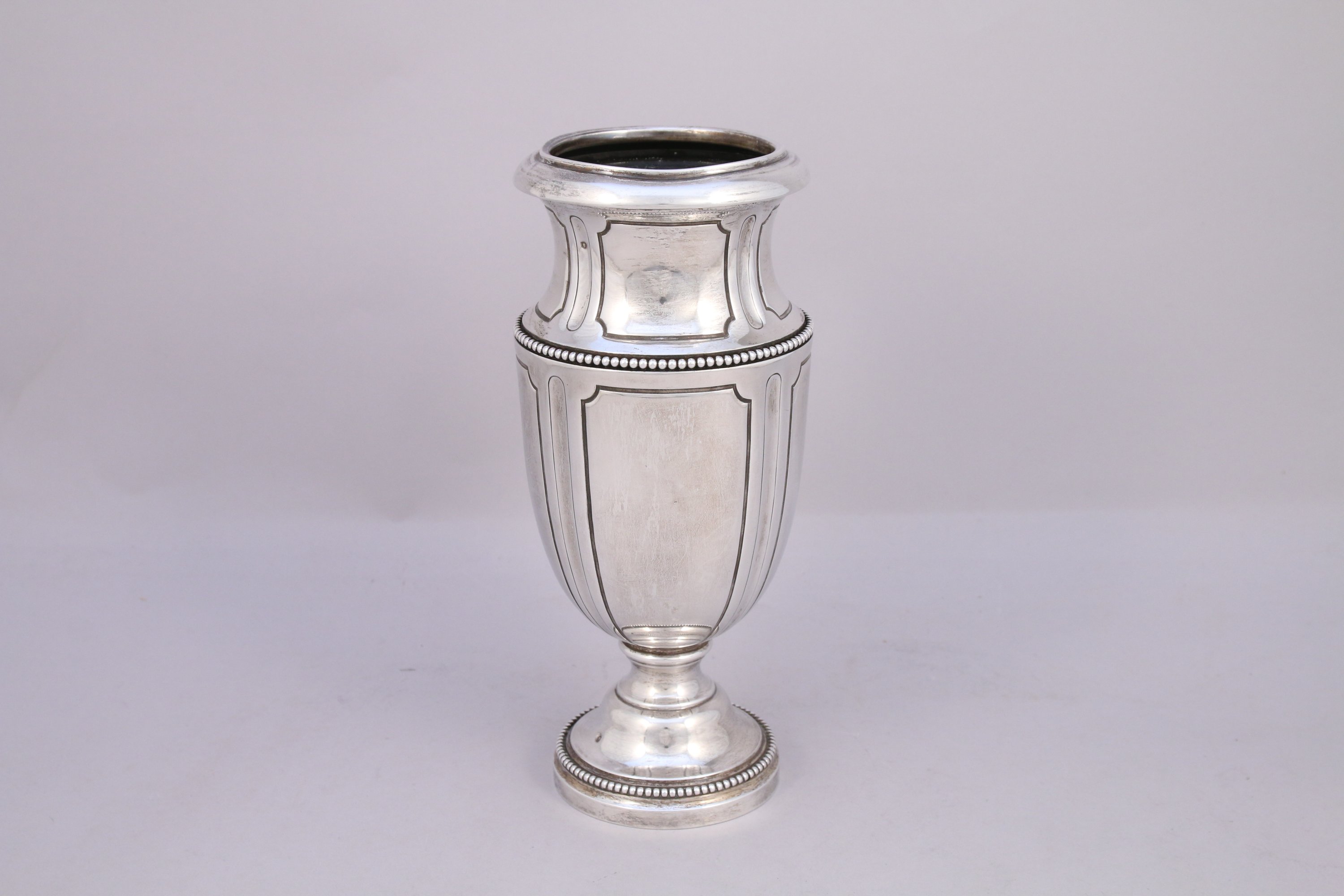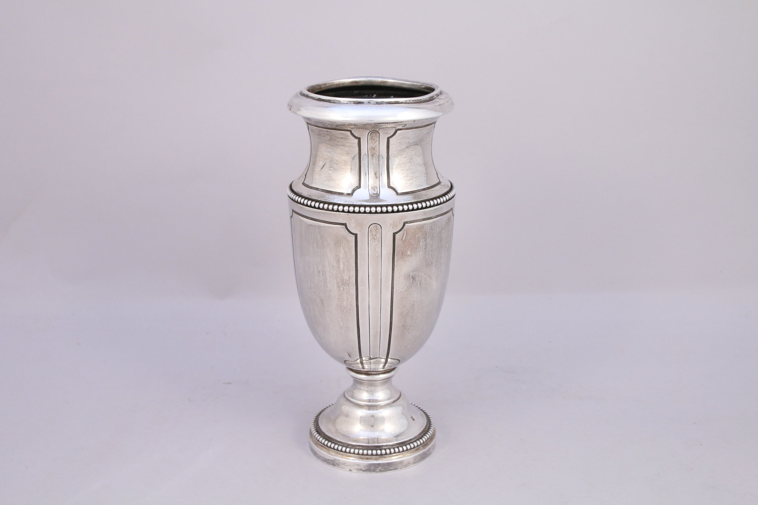 VASE en argent de forme balustre, panse à décor de cartouches, le piédouche bordé d'une frise de perles reprise sur la panse.