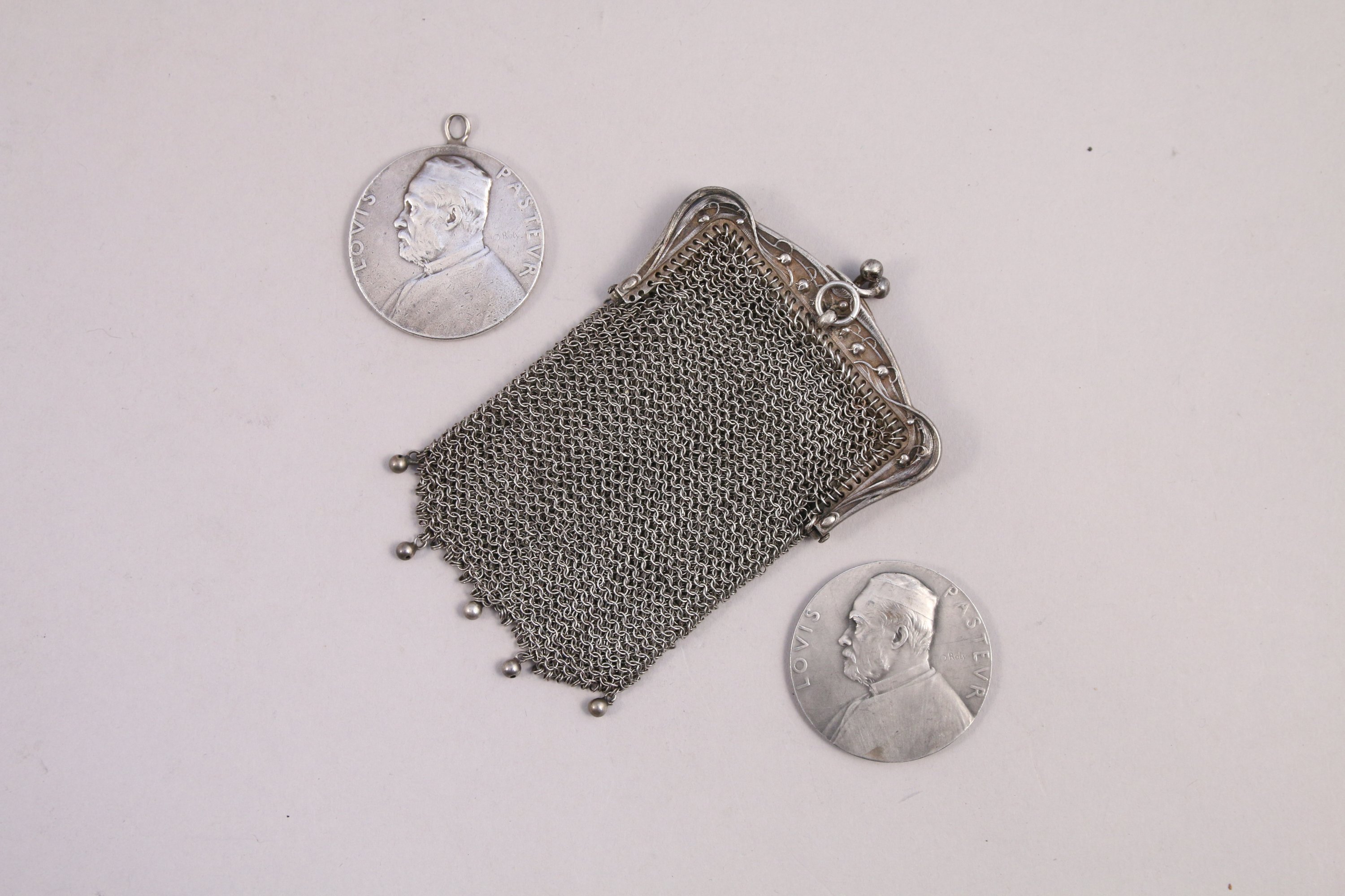 JOINT: Petit sac aumonière en argent et deux médailles en argent Louis Pasteur.