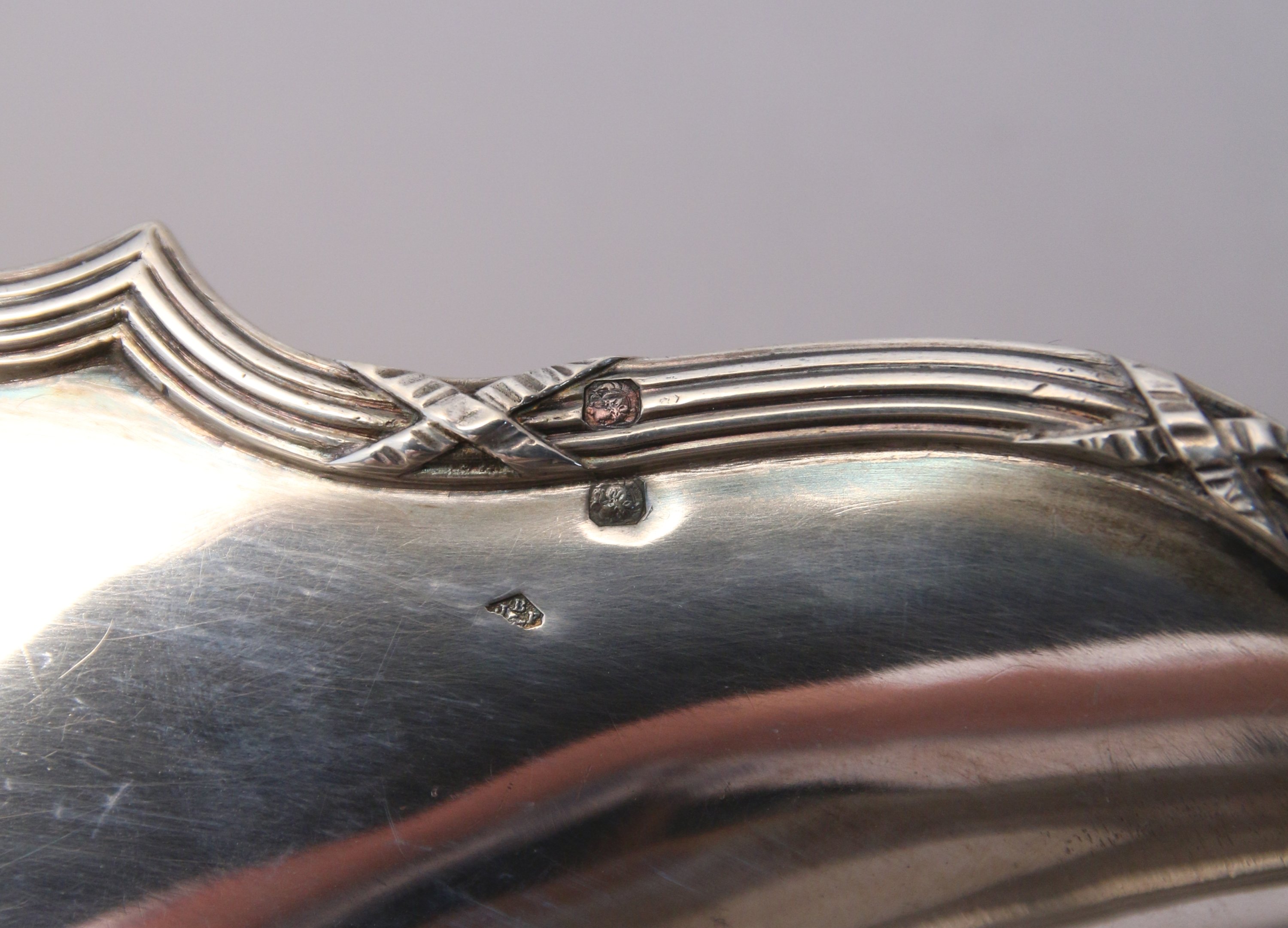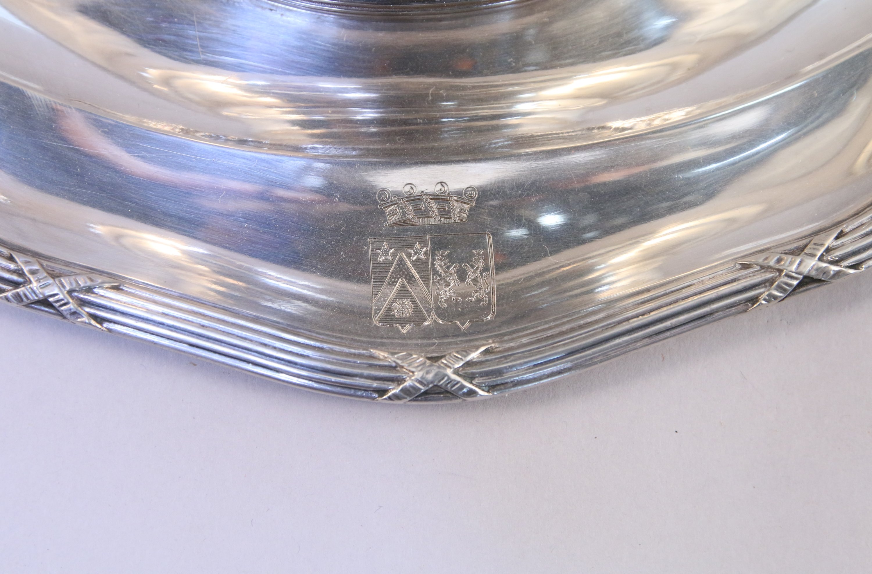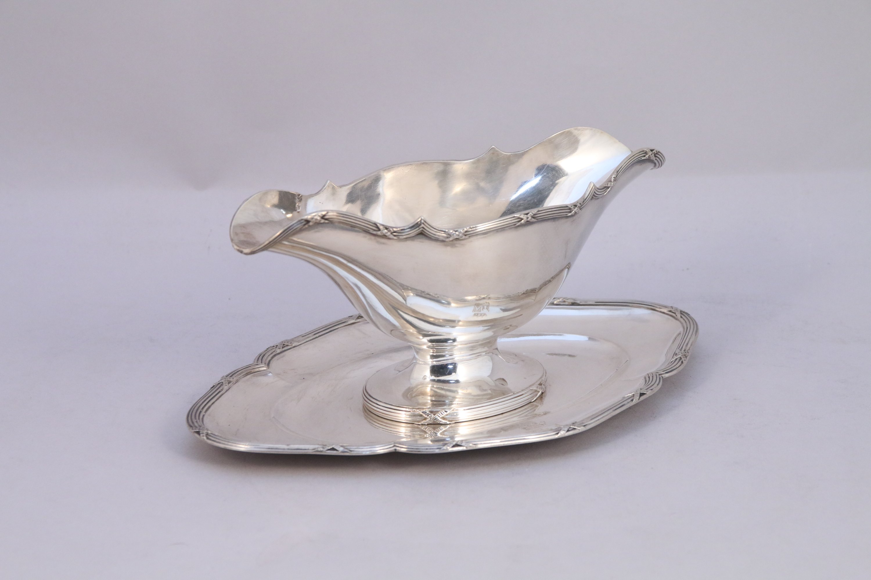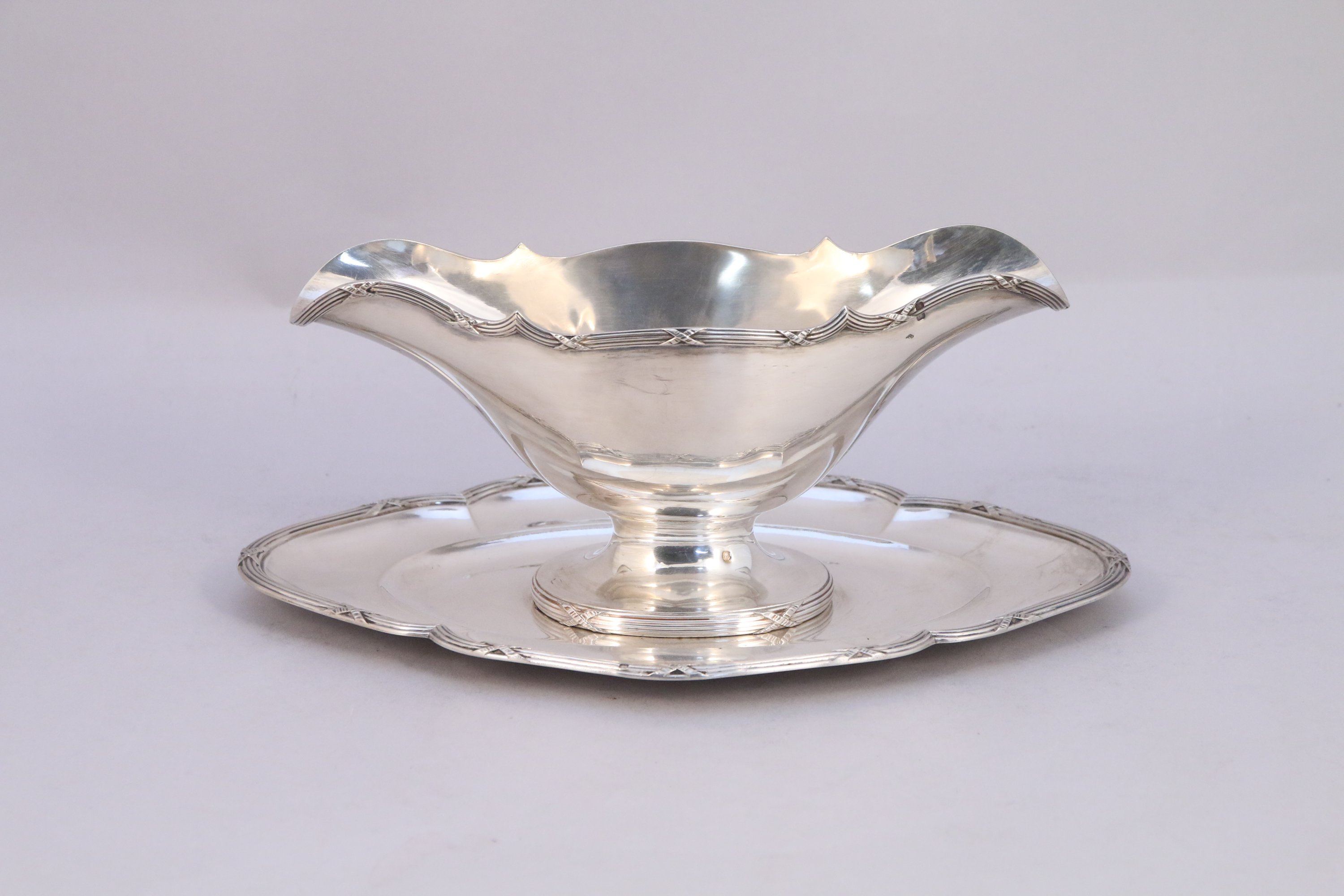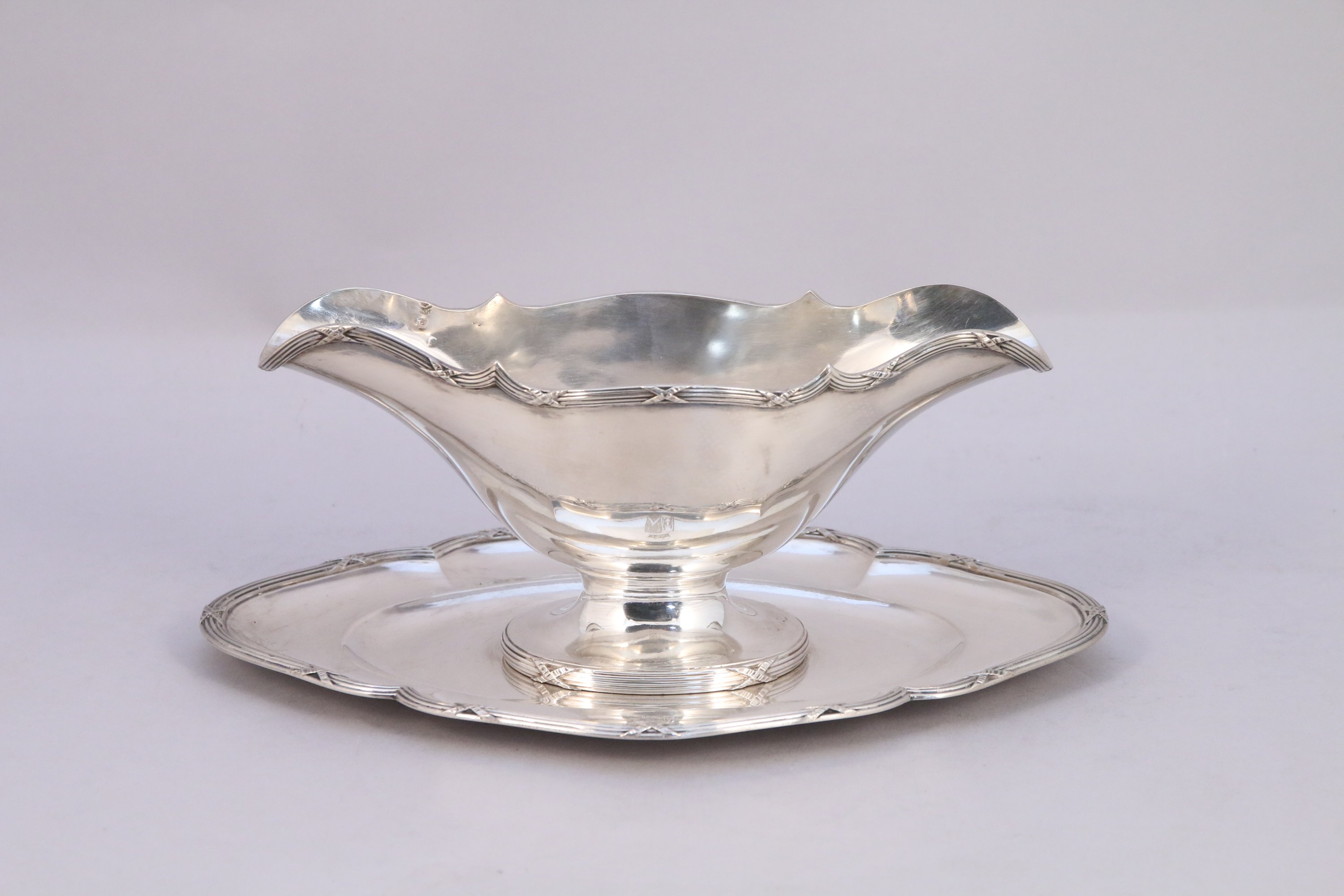 SAUCIÈRE et son PLATEAU FIXE de forme chantournée bordée d'un frise de jonc rubané. Gravé d'armoiries d'alliances surmontées d'une couronne de baron sur le marli.