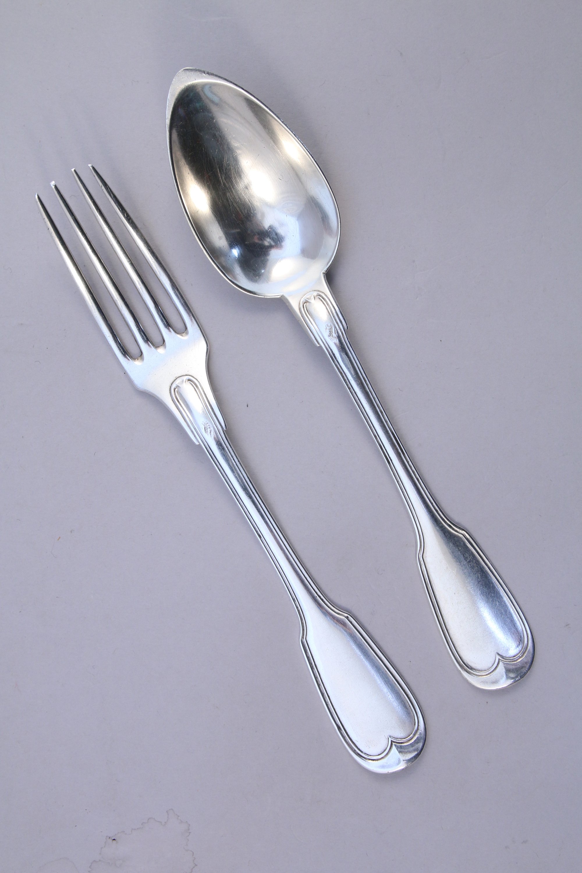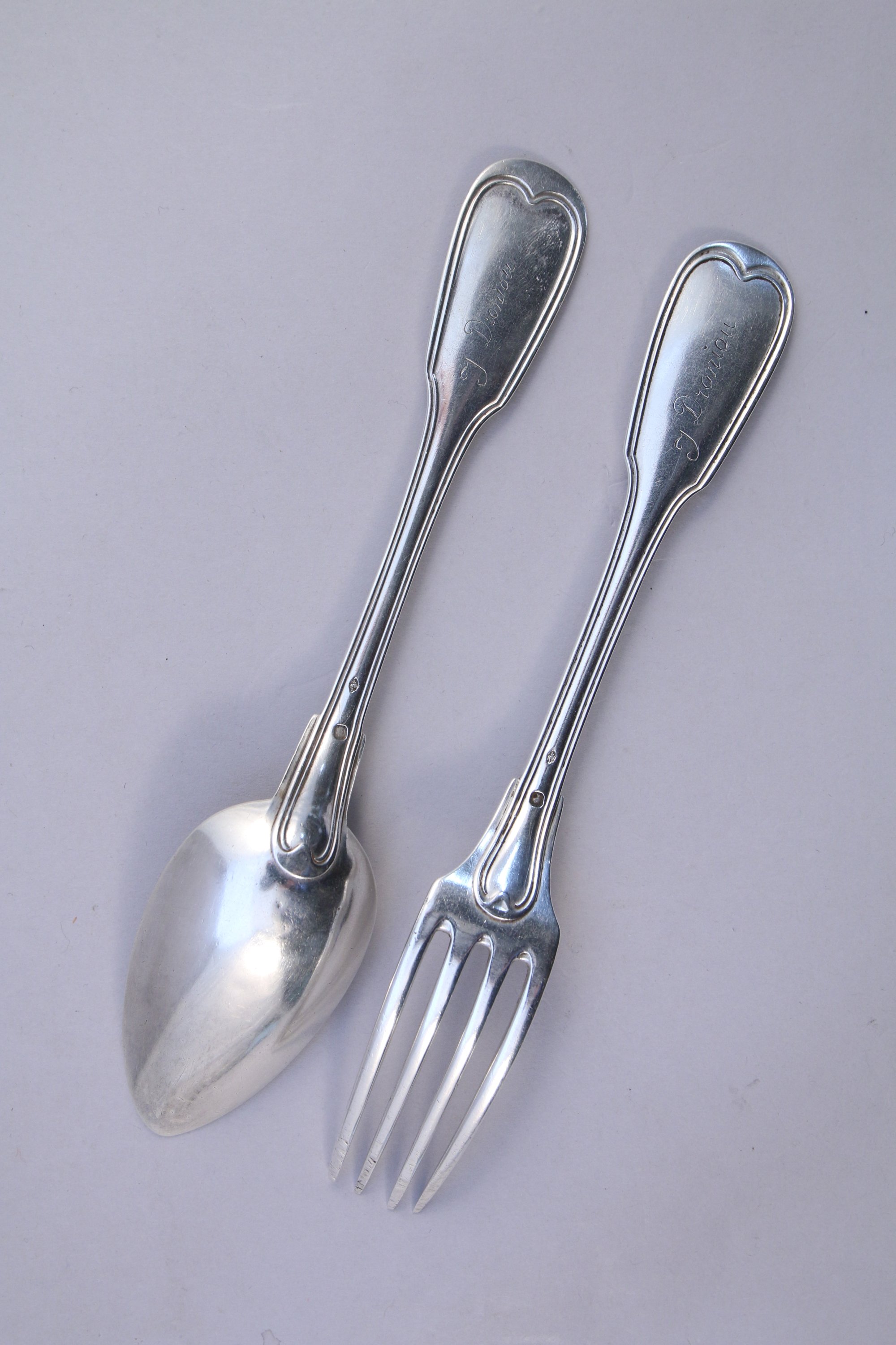 JOINT: UNE CUILLÈRES et UNE FOURCHETTE en argent, modèle filet, gravées "I DRONIOU".