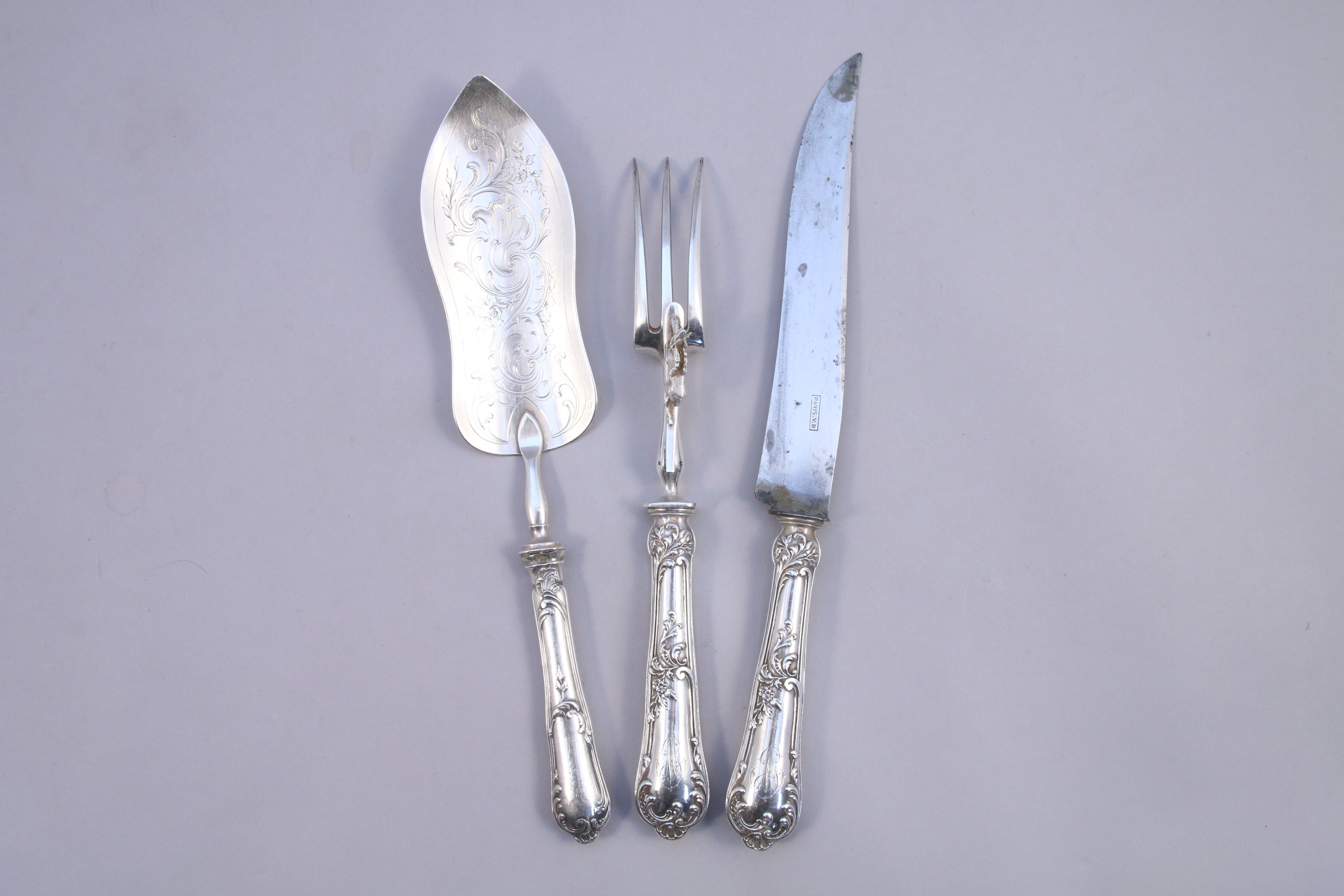 - Deux COUVERTS de DÉCOUPE le manche en argent fourré la lame et la fourche en acier. Motifs rocailles, et cerf ronde bosse sur le garde lame. Poinçon Minerve.