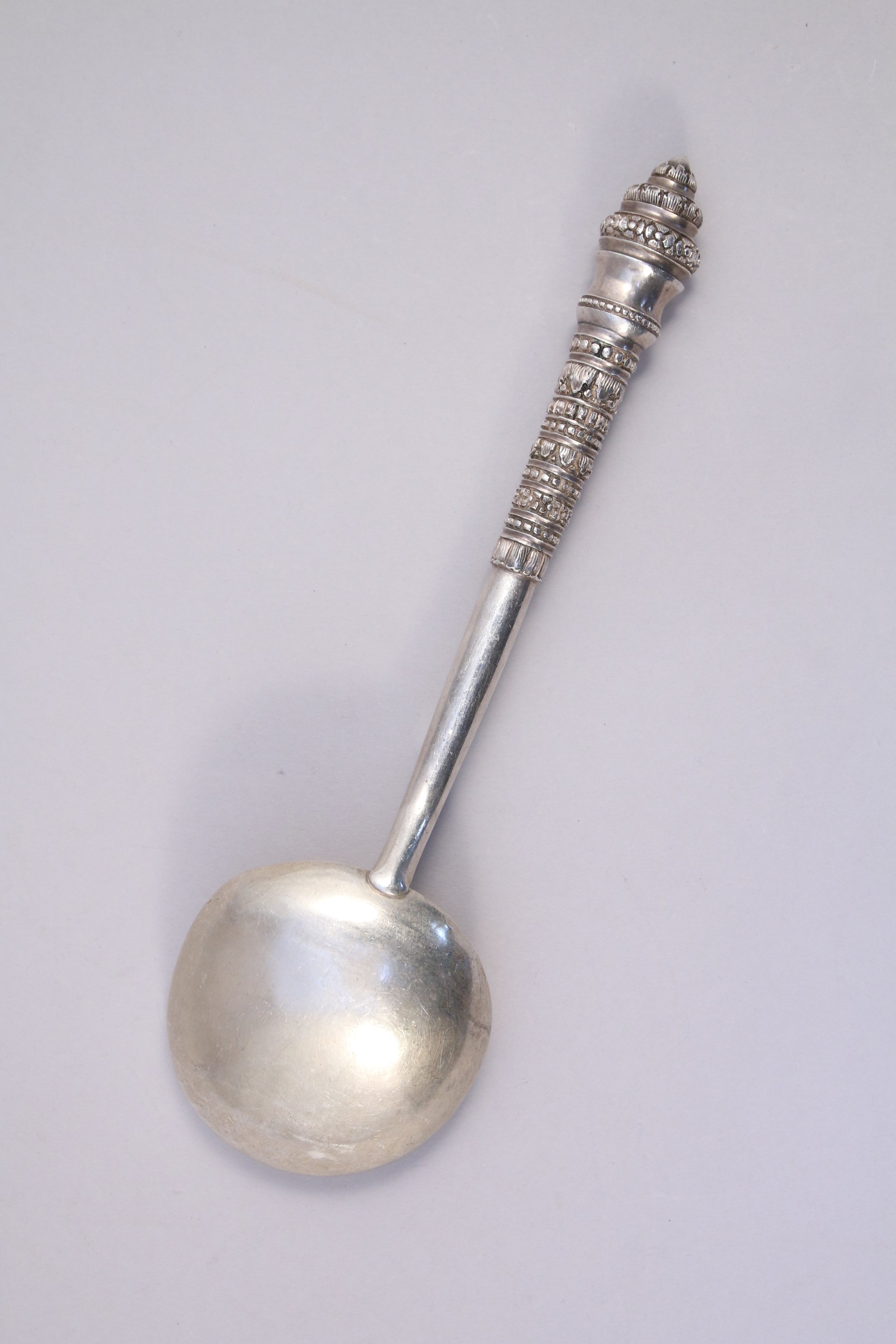 INDOCHINE. LOUCHE en argent, à décor de fleurs et motifs stylisés en registre.