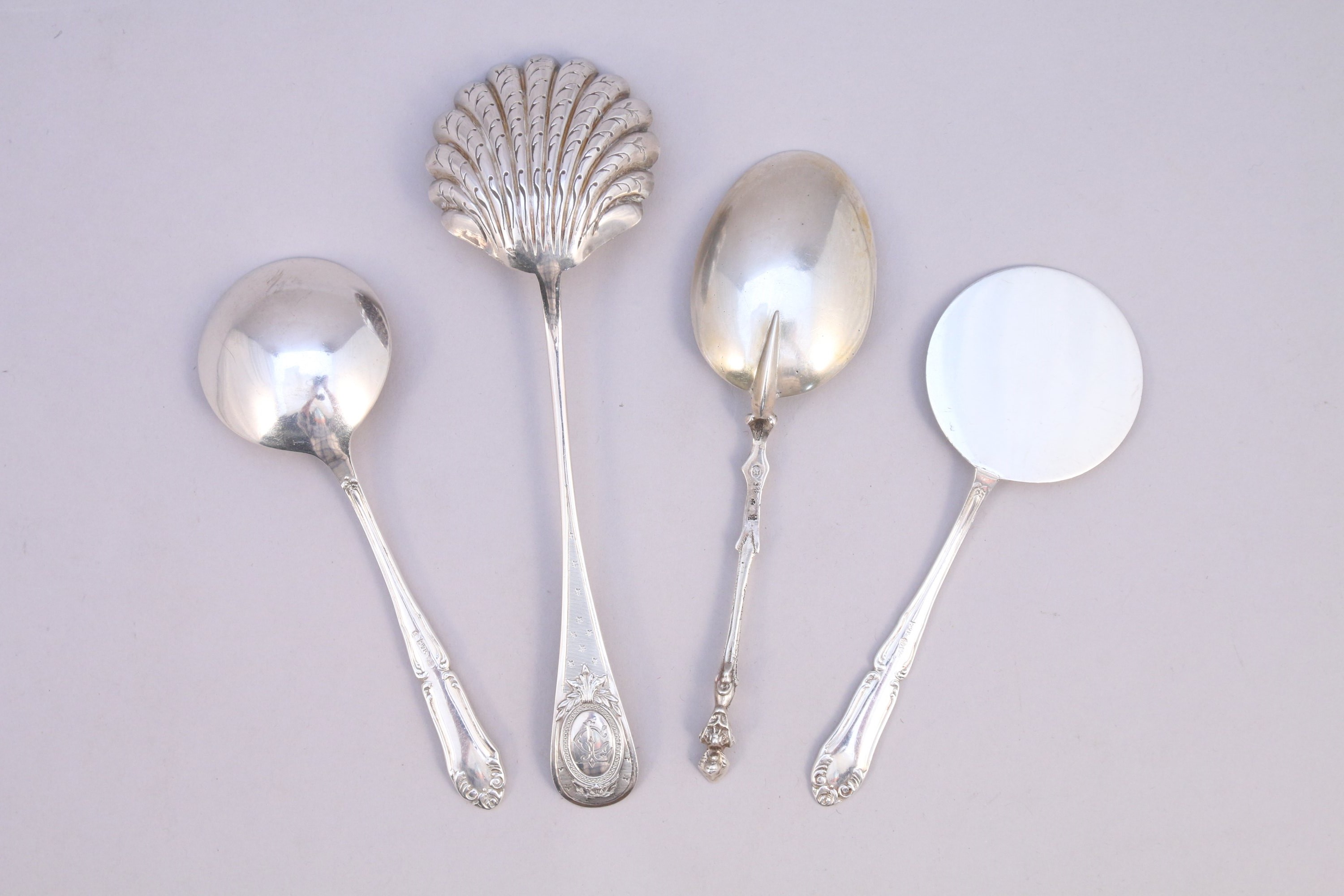 LOT de COUVERTS en argent dont: une CUILLER à saupoudrer poinçon Minerve, une CUILLER et une PELLE en argent travail étranger, une CUILLER ornée d'un personnage en buste travail étranger.
