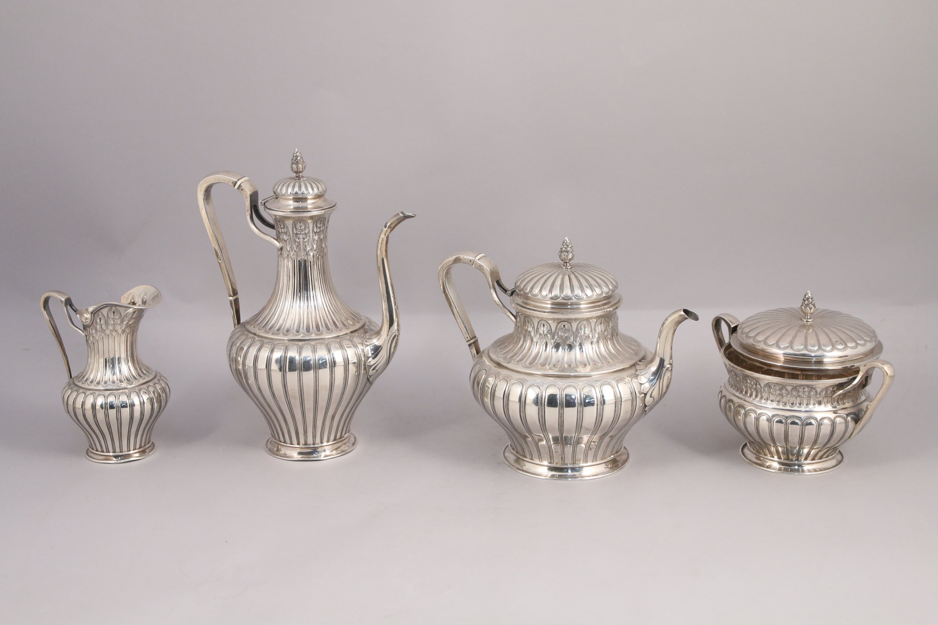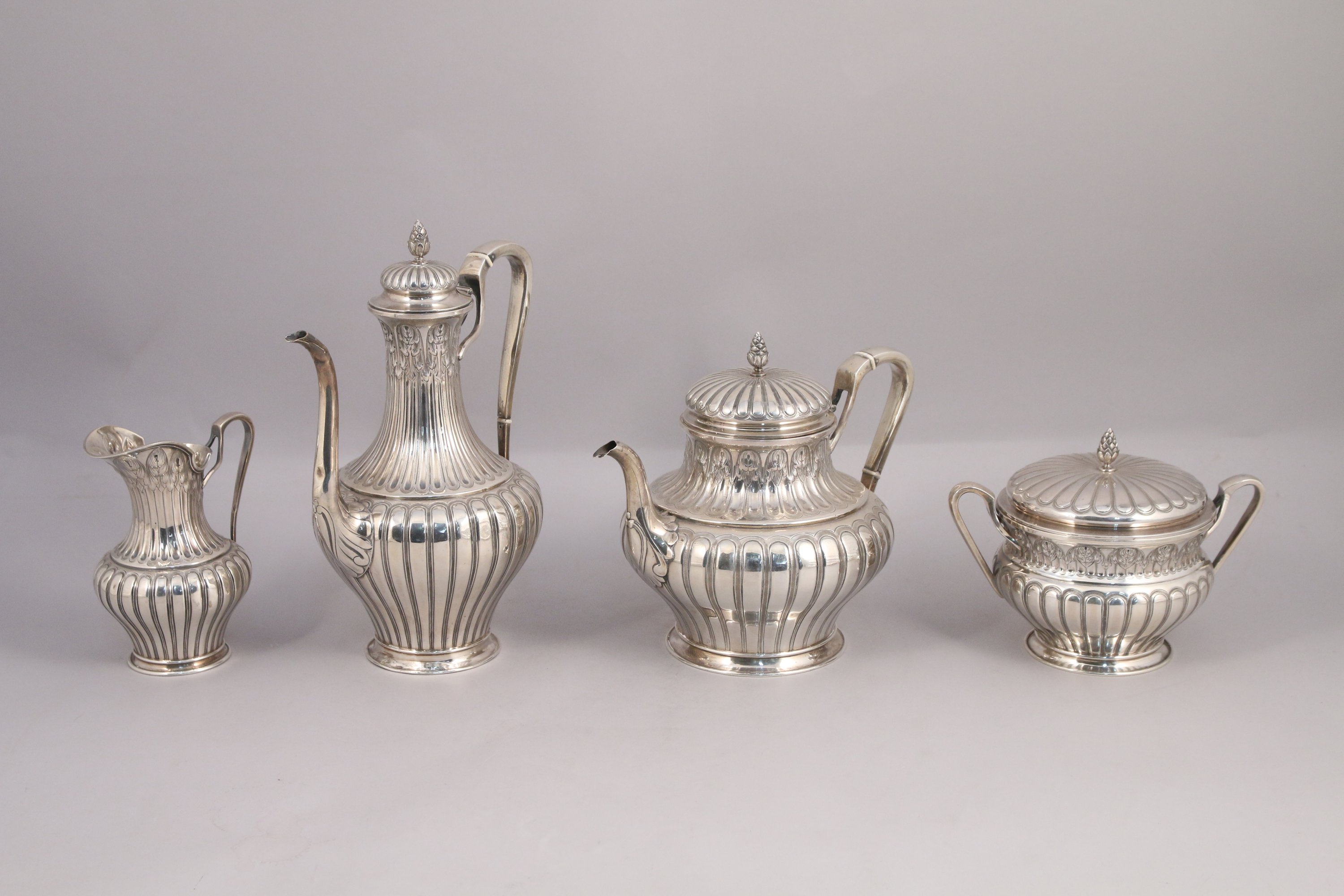 SERVICE à THÉ et CAFÉ en argent. Il est constitué de deux verseuses, un pot à lait et un sucrier.