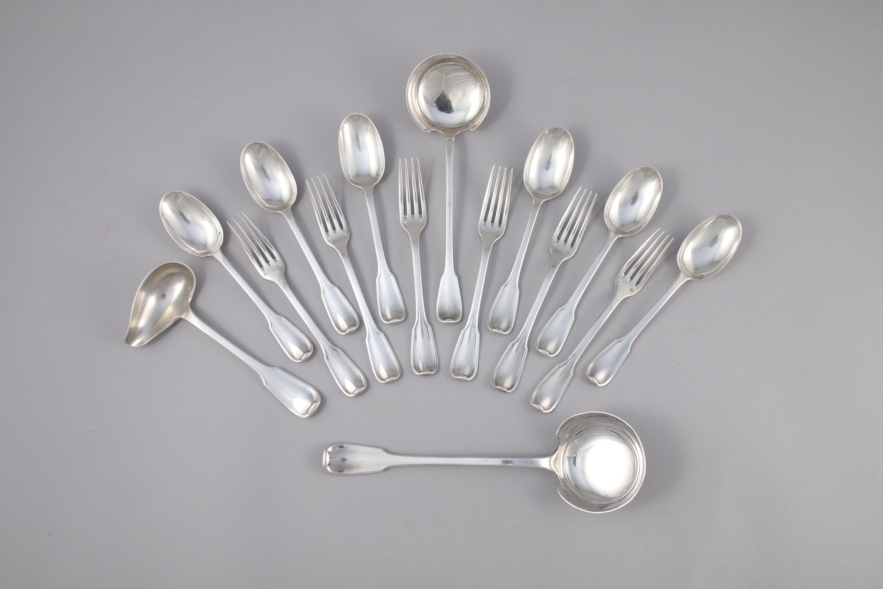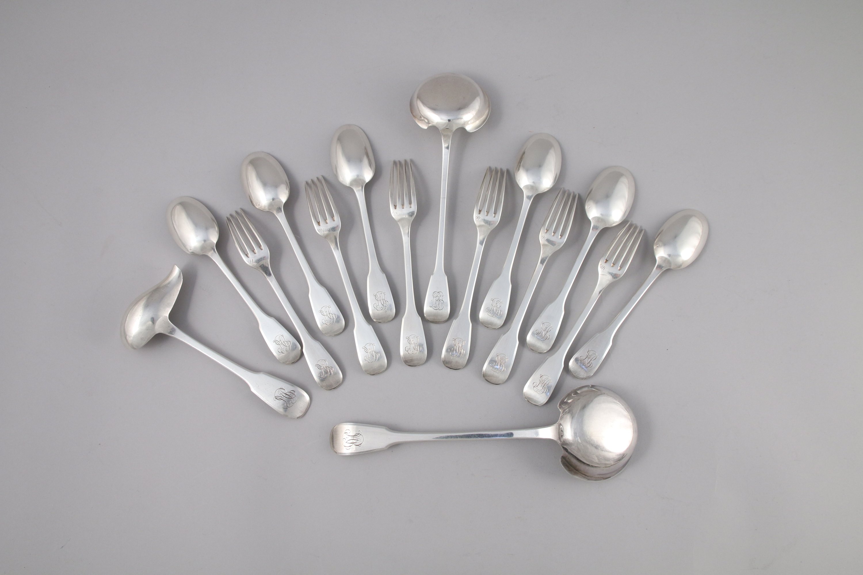 PARTIE de MÉNAGÈRE, en argent comprenant SIX COUVERTS À ENTREMETS, DEUX LOUCHES et UNE CUILLÈRE À SAUCE. Modèle uniplat et filet monogrammés "MB" et "BB" pour la petite louche.