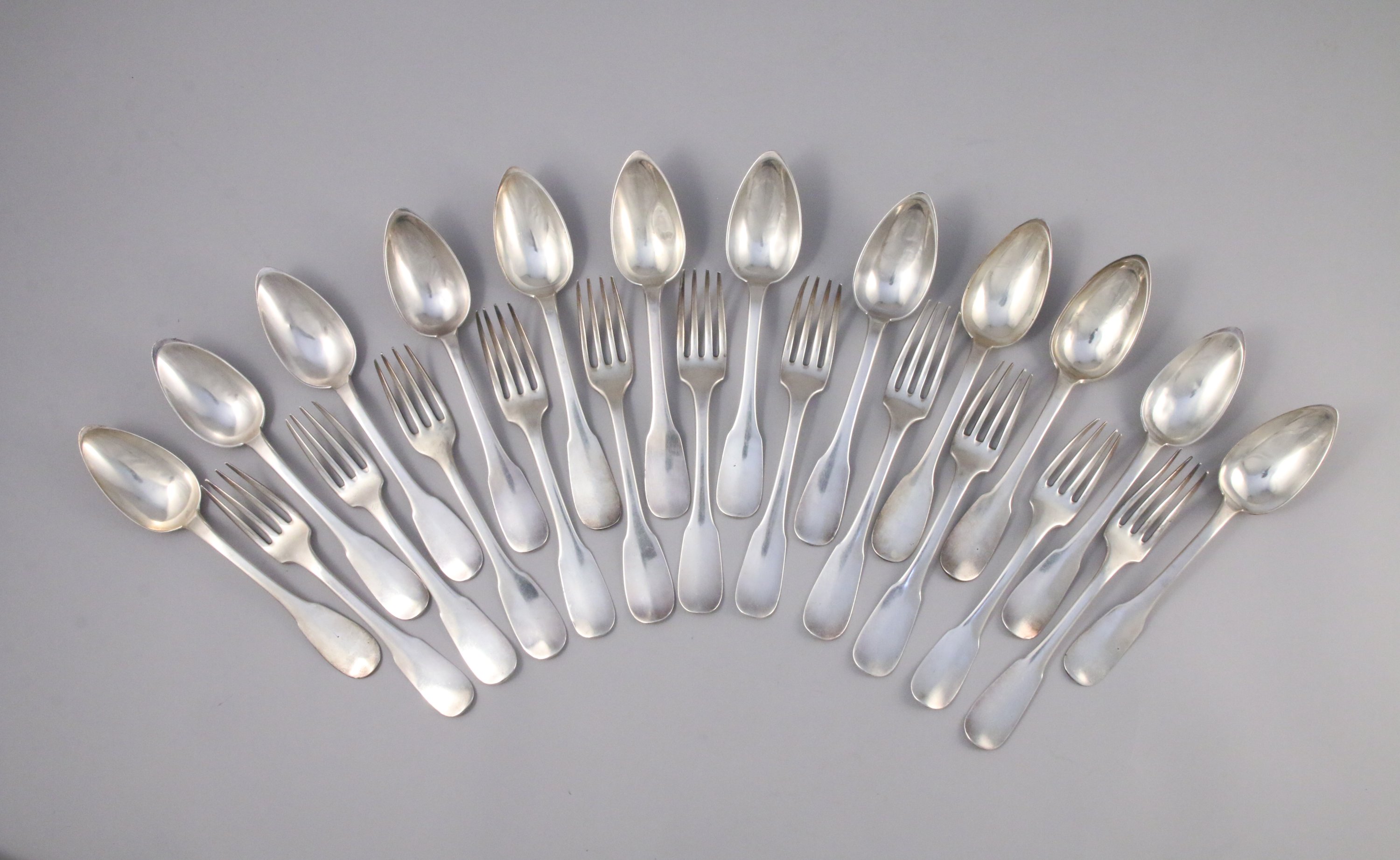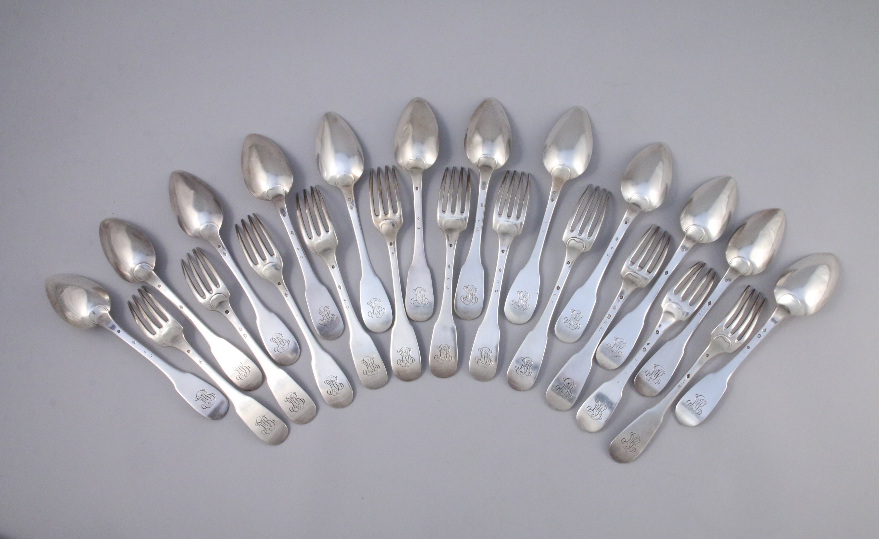 ONZE COUVERTS et UNE CUILLÈRE DE TABLE en argent modèle uniplat monogrammés "MB":