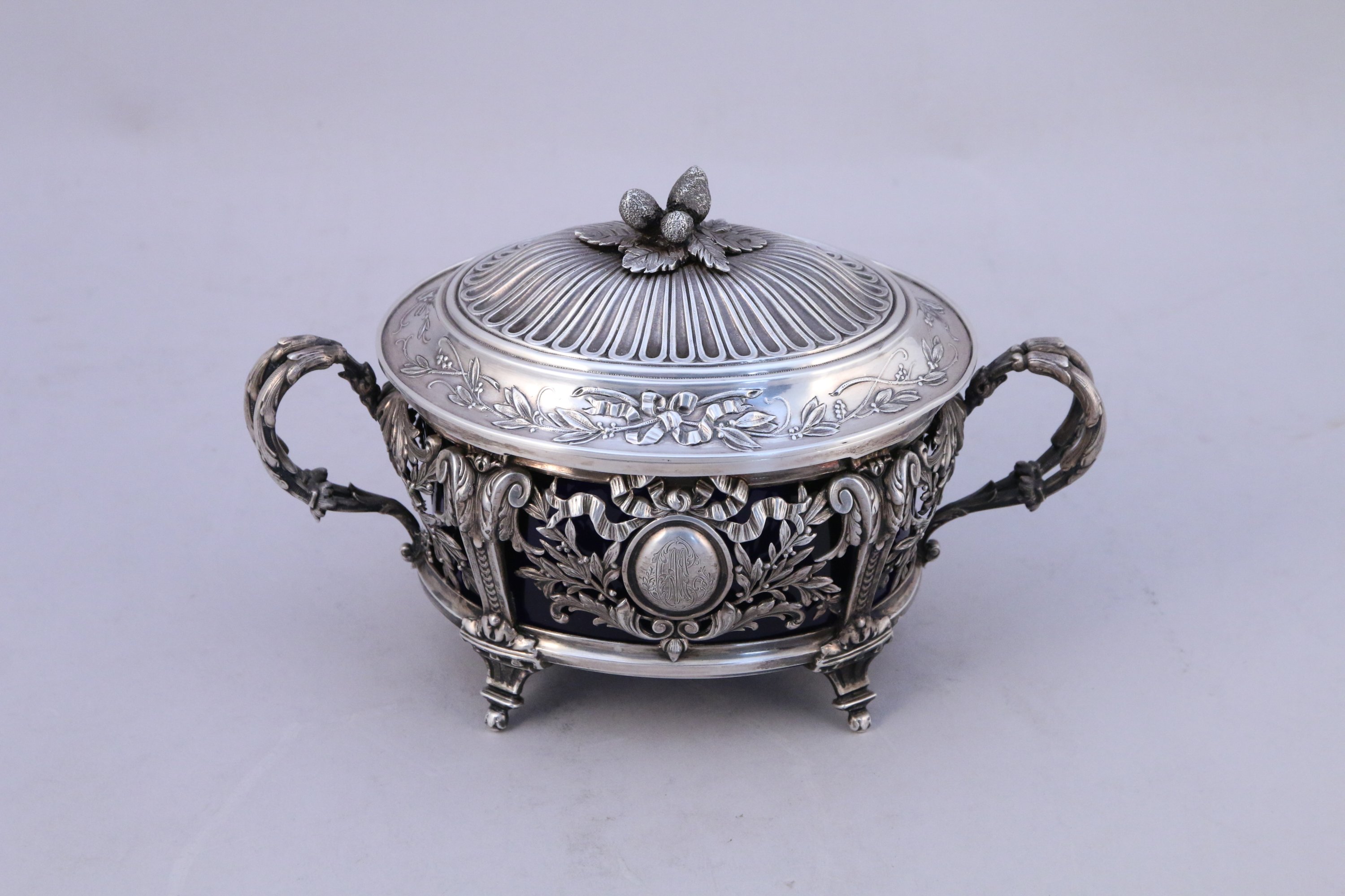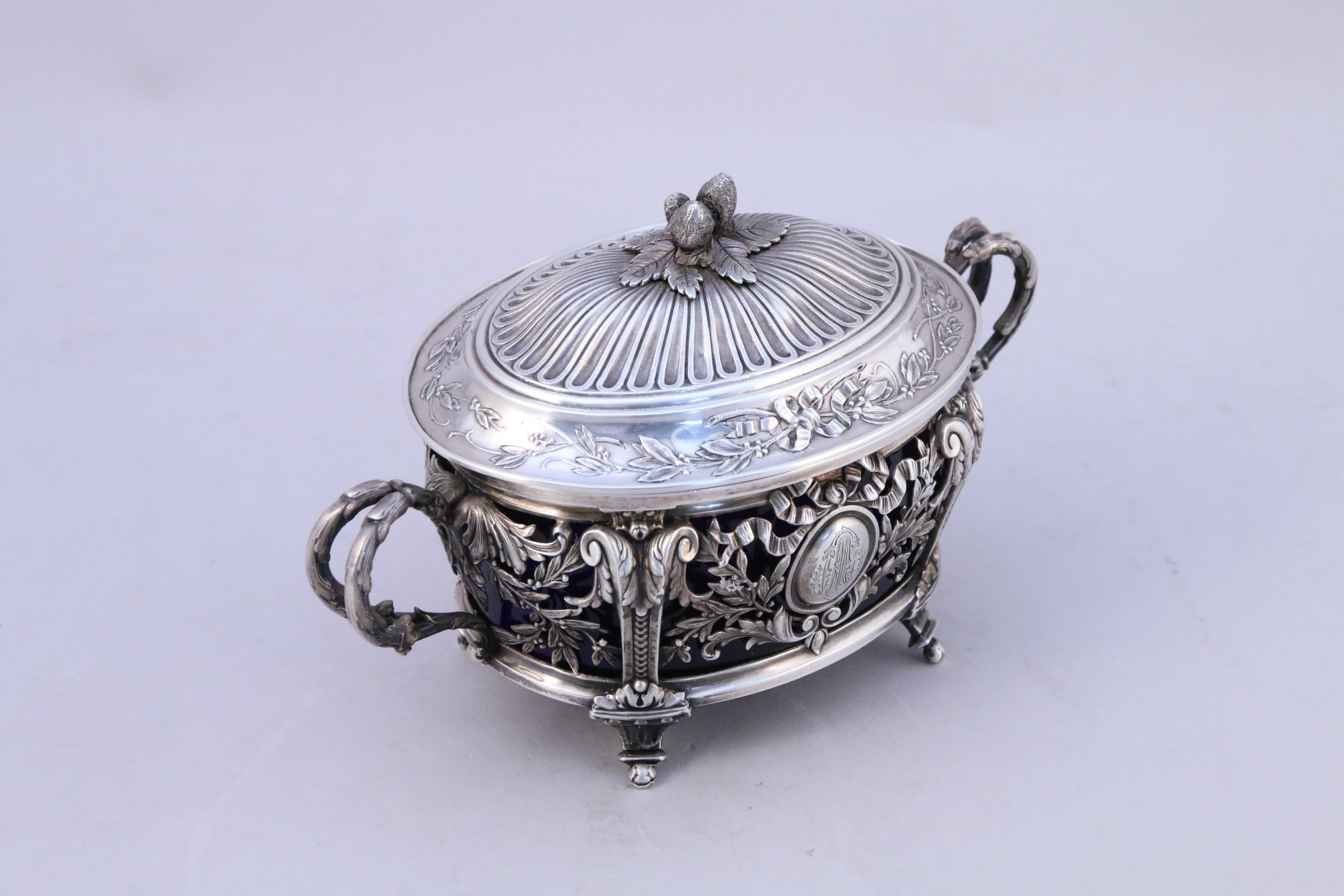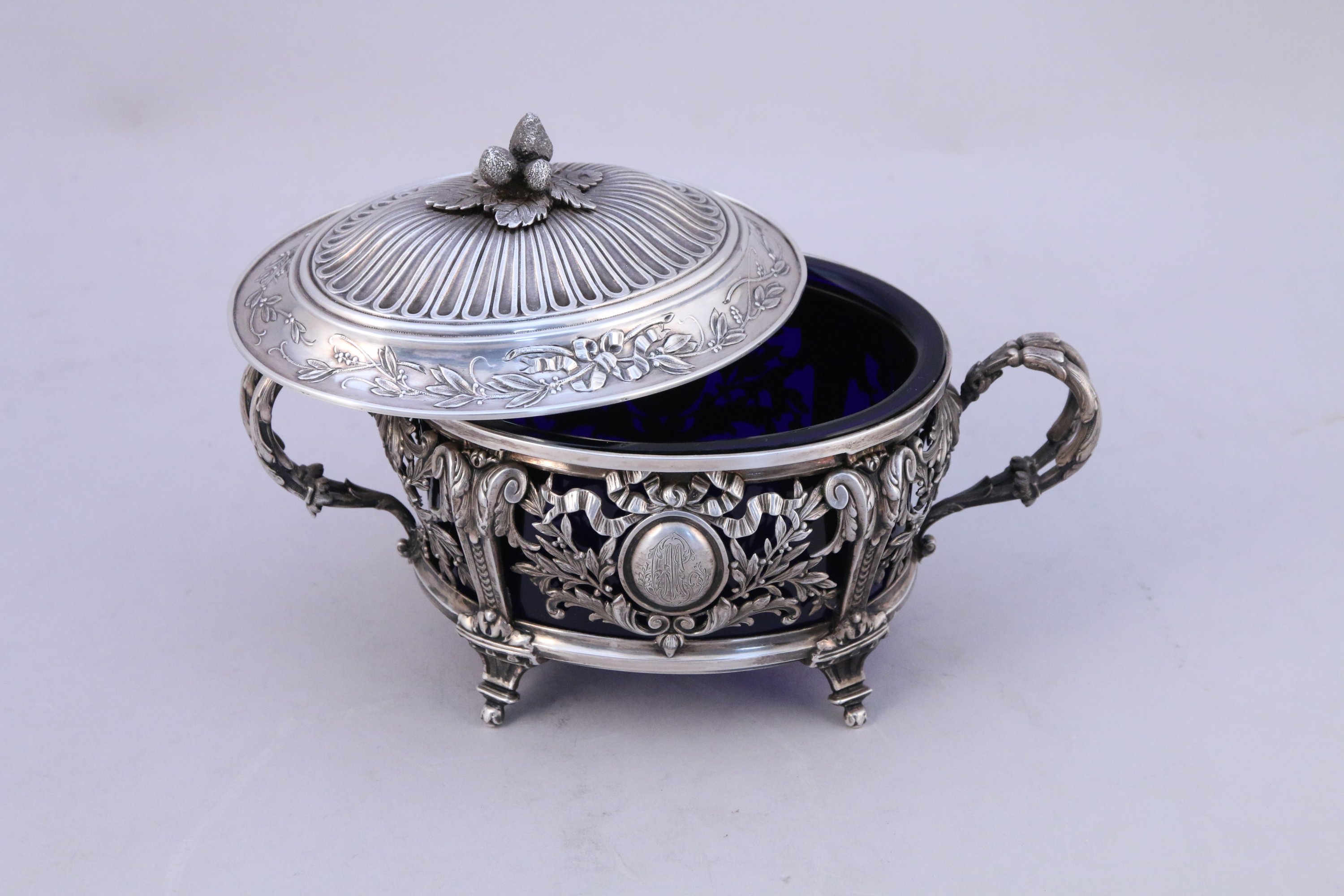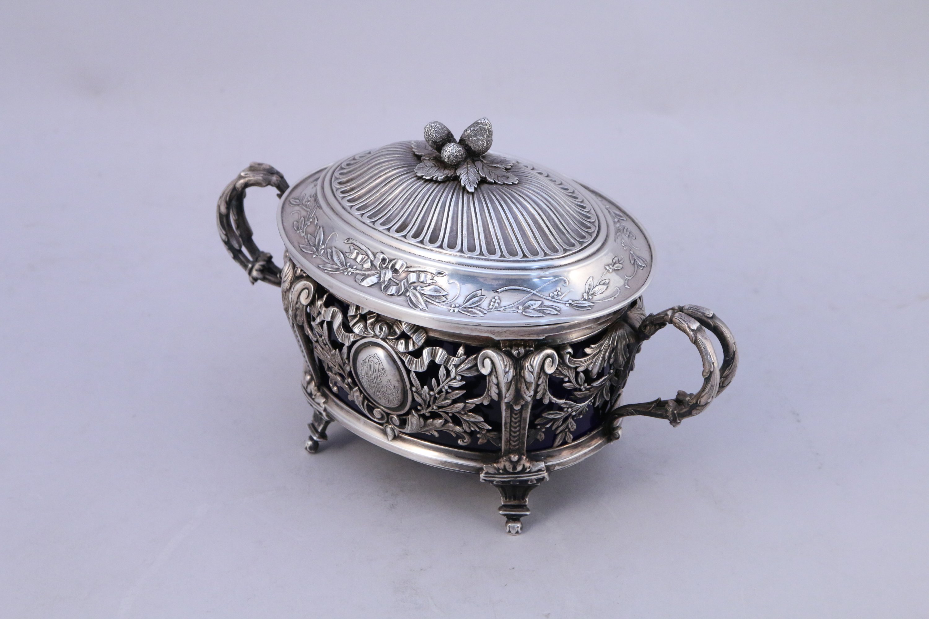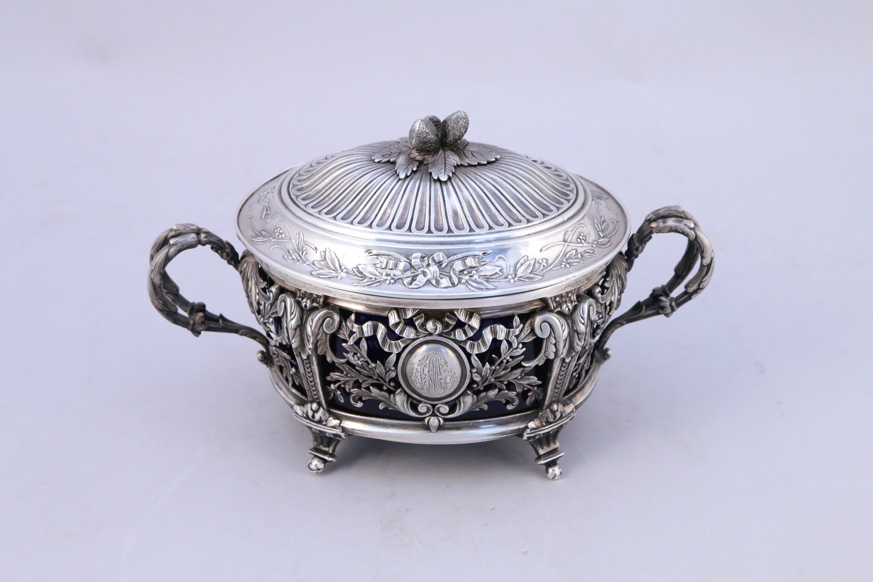 SUCRIER COUVERT en argent de forme ovale garni d'un réceptacle en verre bleu. Décor ajouré de branches de laurier et d'un cartouche sur chaque face gravé d'un monogramme "MC" surmonté d'un noeud de rubans. Les anses latérales à double enroulement feuillagé.