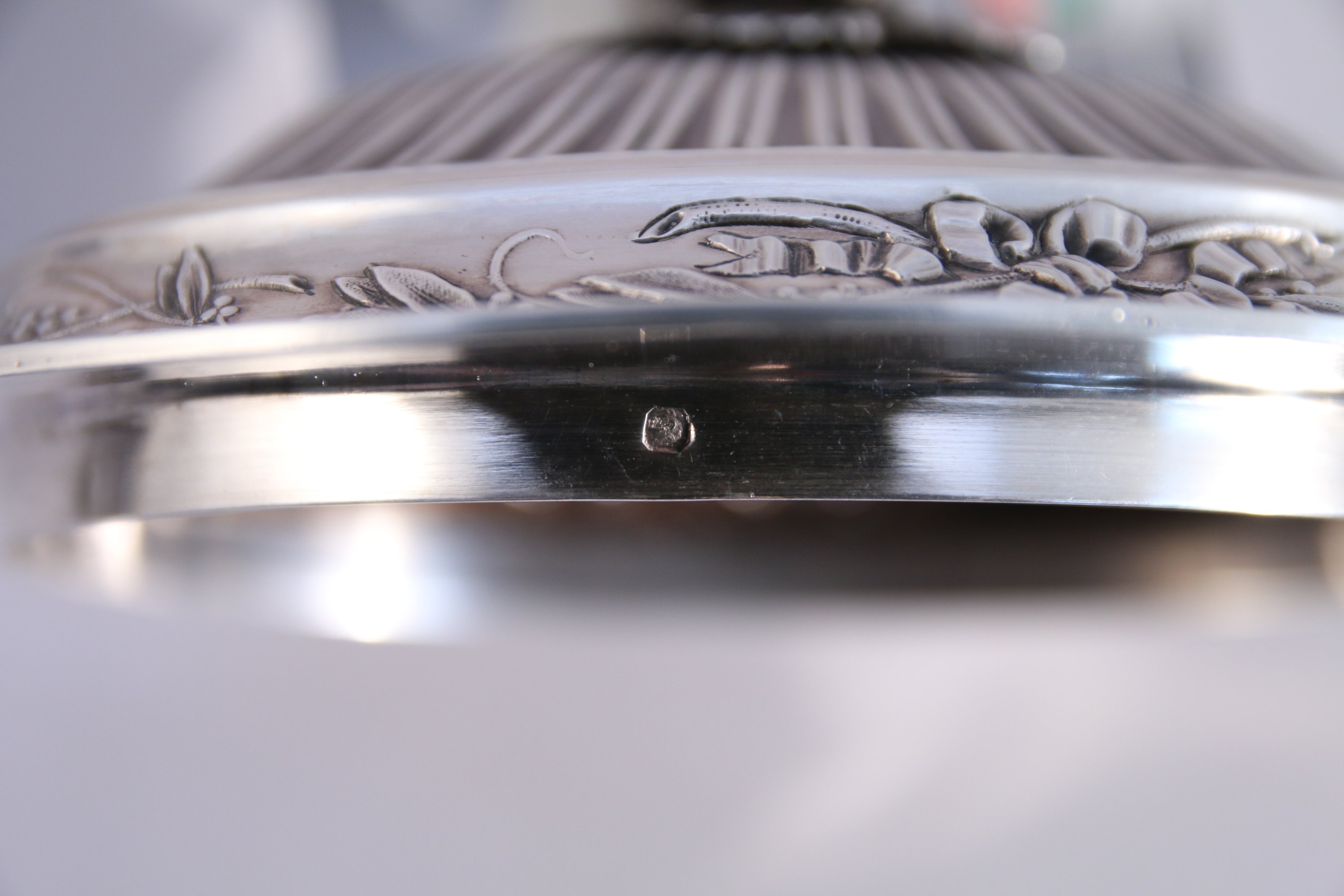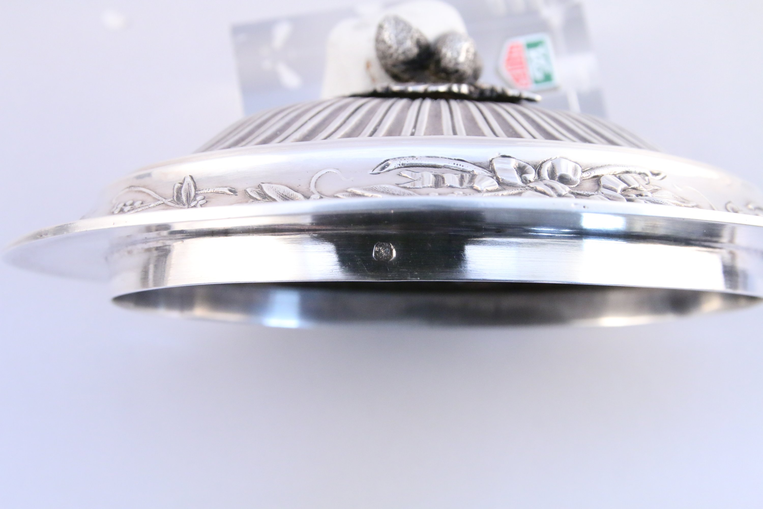 Reposant sur quatre pieds griffes en console. Le couvercle à doucine est orné au repoussé de cannaux et d'une frise de lauriers et rubans. Le fretel formé de trois fraises des bois posant sur leur feuillage.