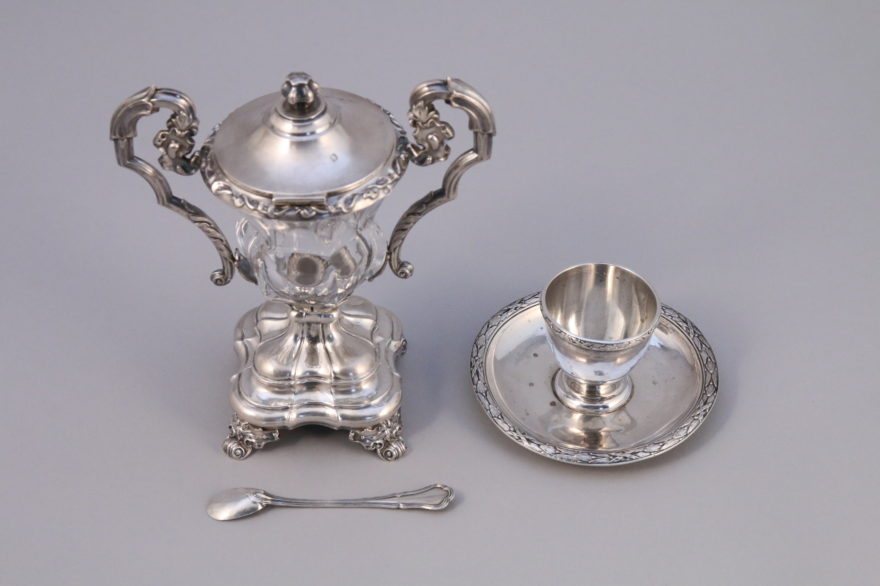 - MOUTARDIER en forme de vase couvert, les anses à enroulement à motif de feuillage stylisé et cuir découpé. Reposant sur un fût et une base contour mouluré et sur quatre pieds coquilles. Réceptacle en cristal à pans. Poinçon Minerve XIXe. Haut.15,5, Larg. 12 cm. Poids brut 302 g.