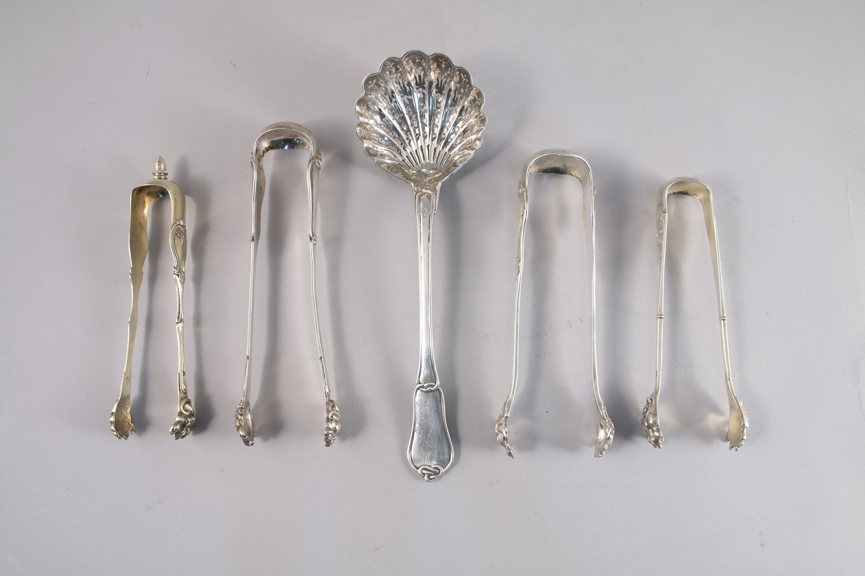 QUATRE PINCES À SUCRE et d'une CUILLÈRE À SAUPOUDRER en argent: